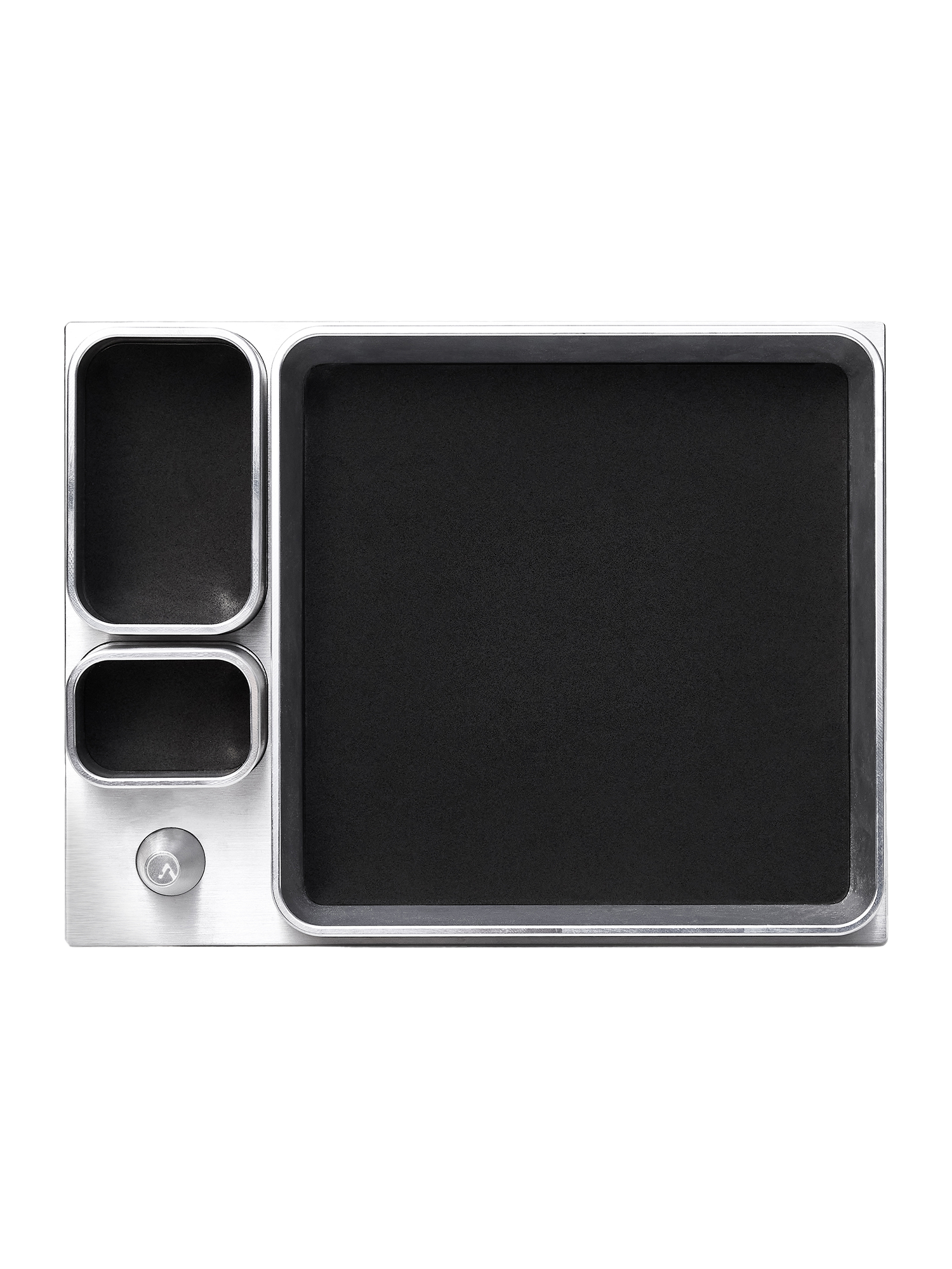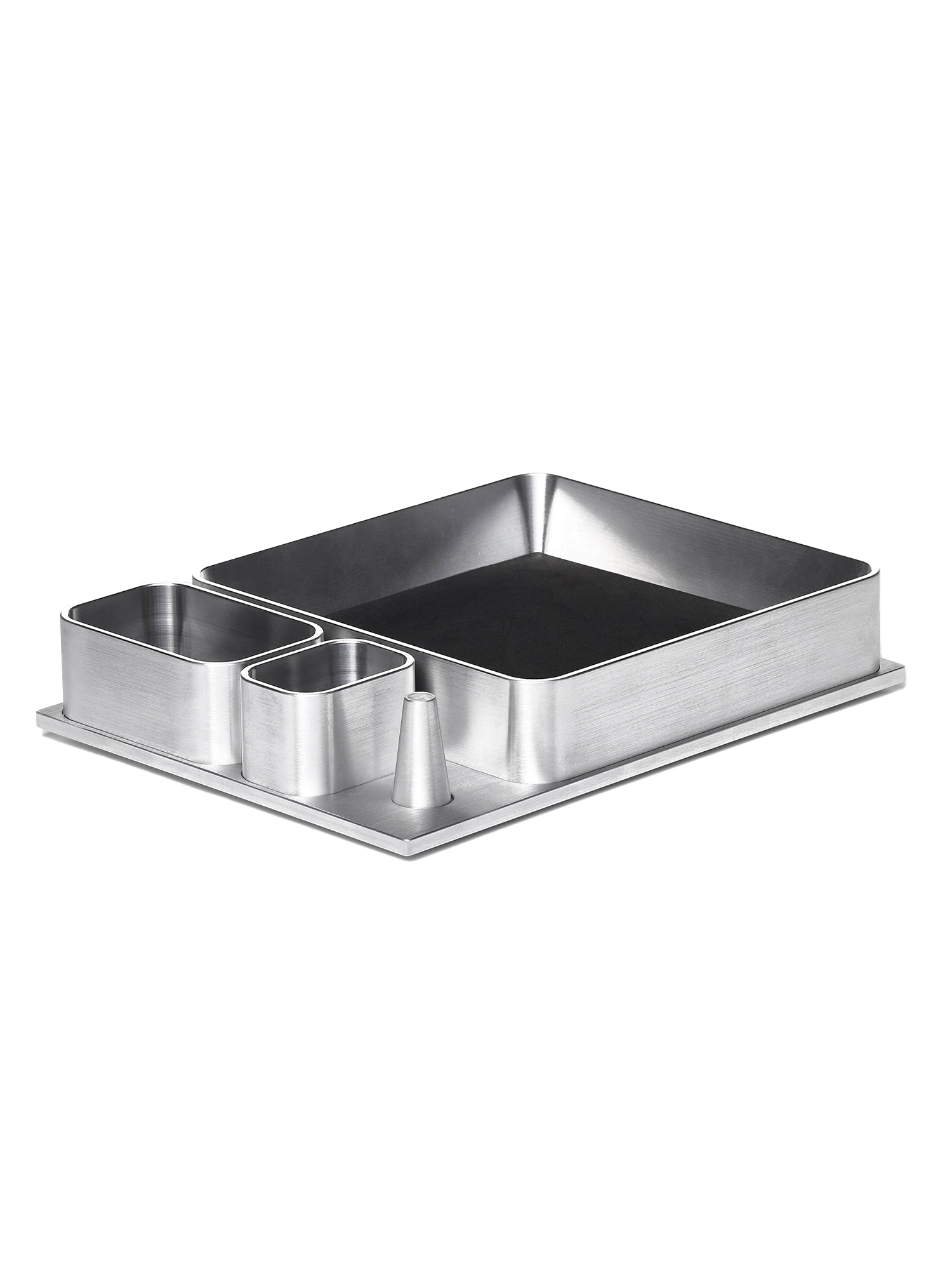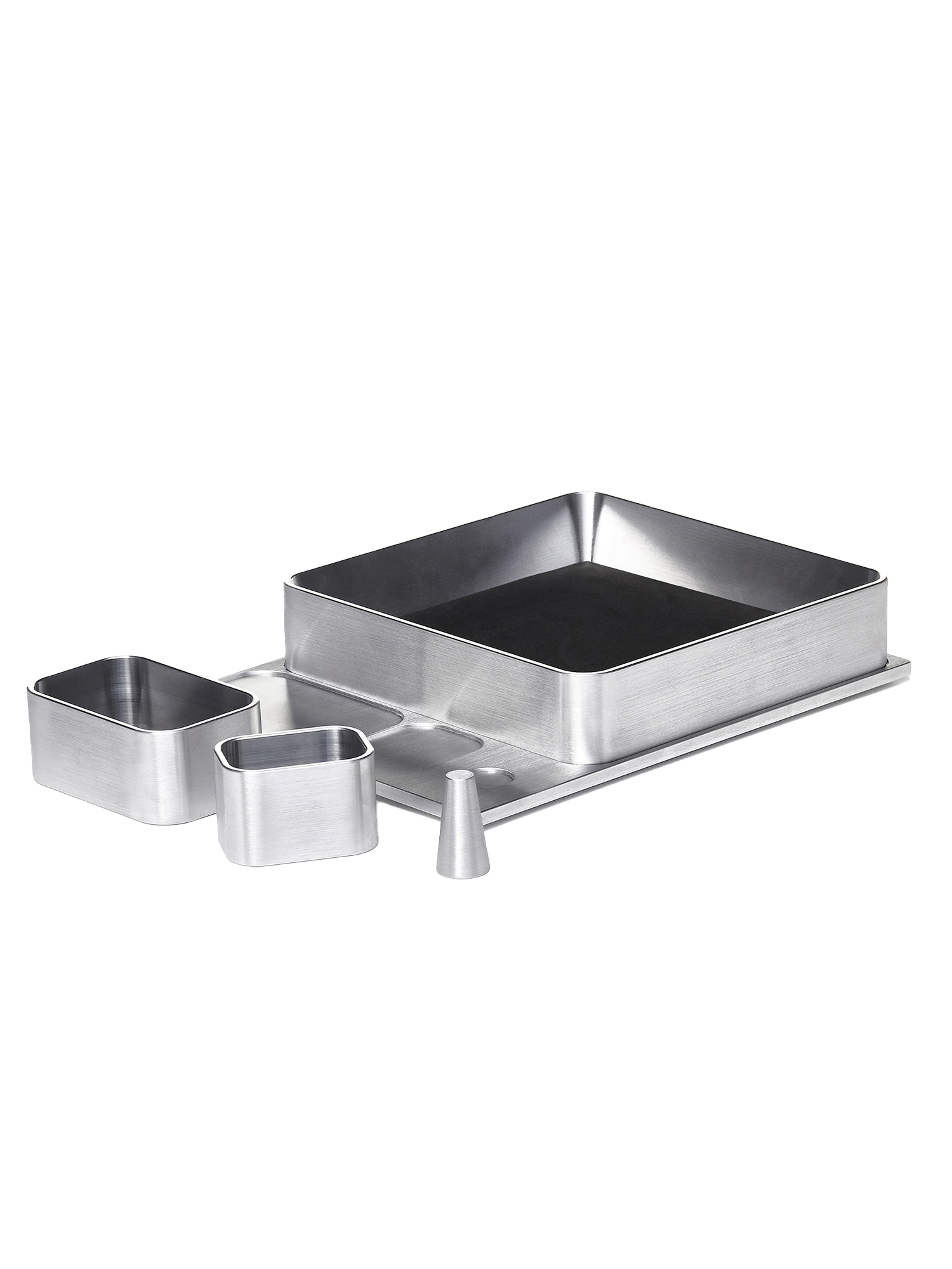 Featuring a ring holder and small, medium, and large compartments equipped with removable padded inserts on top of an inset aluminum tray.