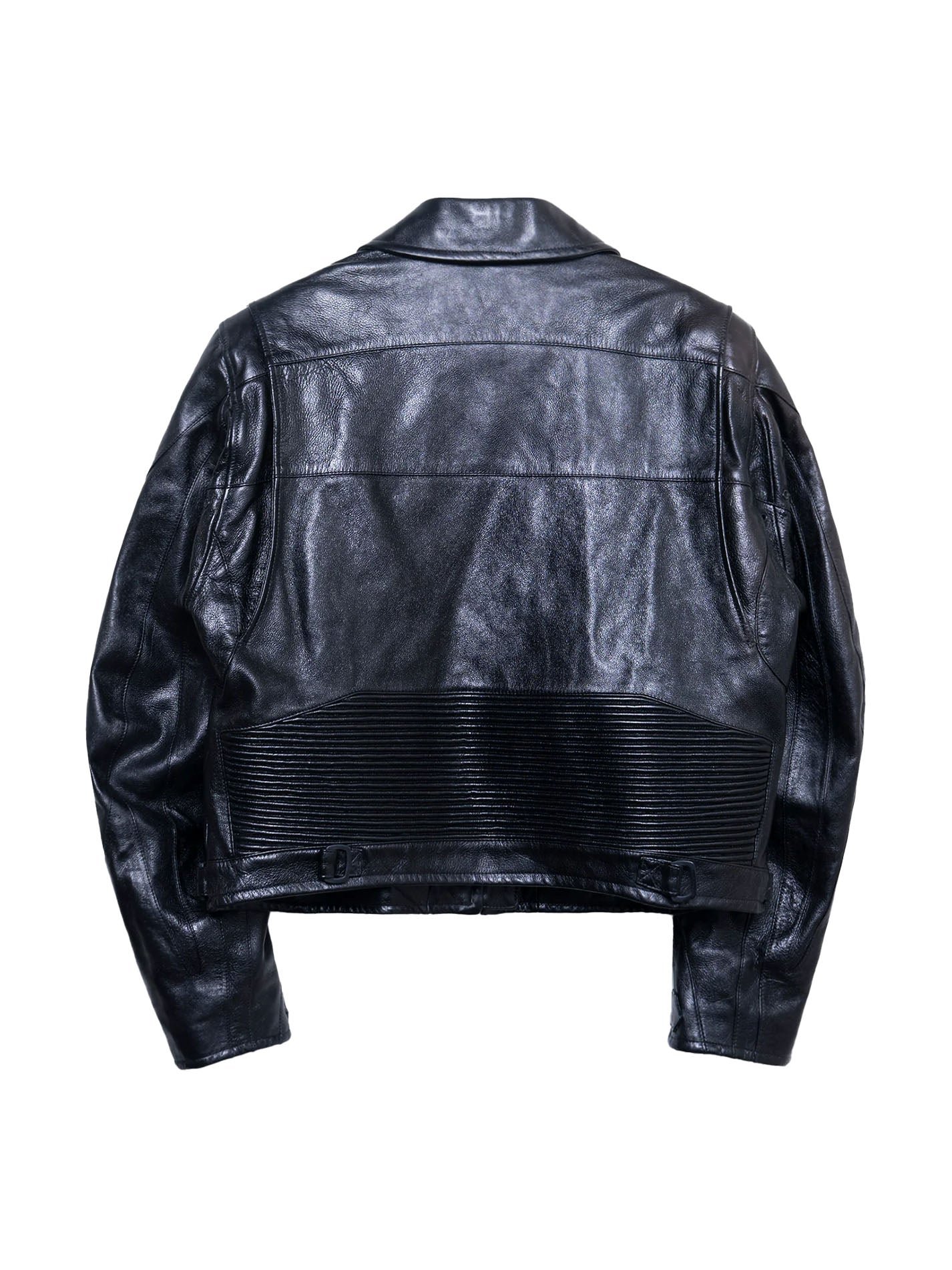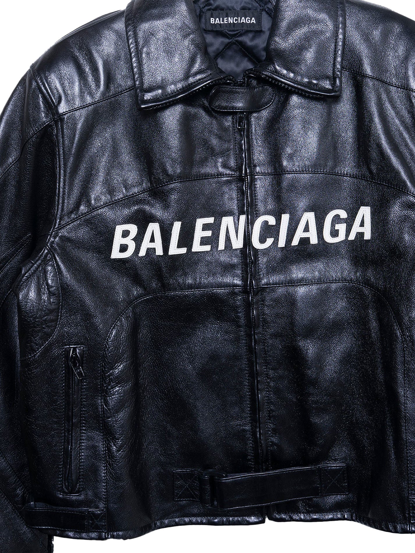 A hefty buffalo leather jacket from Balenciaga with their brand name blasted across the front.