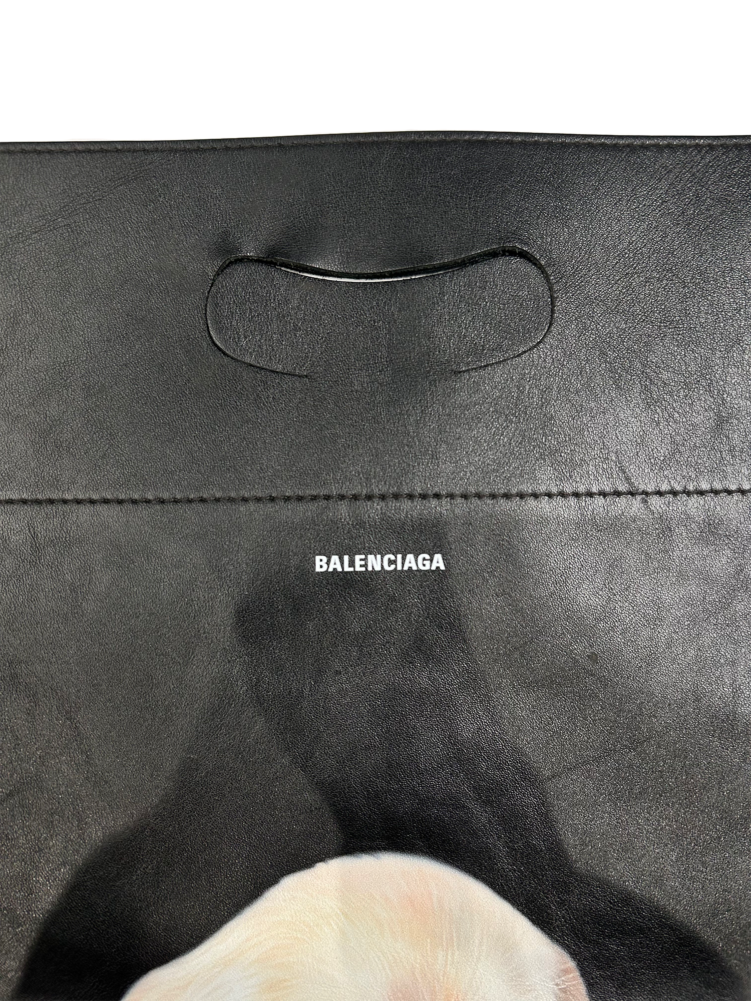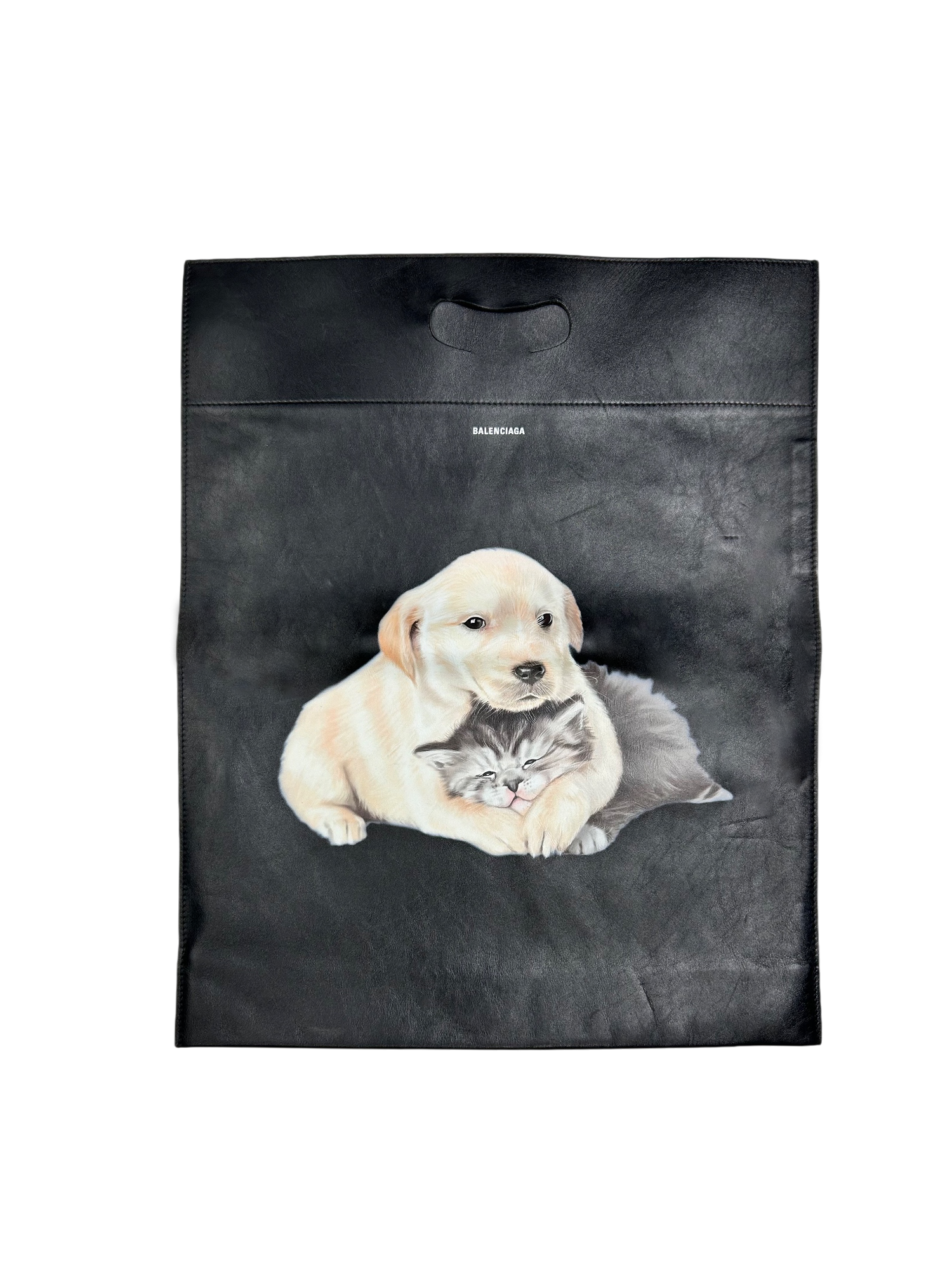 This chic leather tote bag features a charming puppy and kitten graphic. It also includes a convenient small leather pouch inside, perfect for keeping your essentials organized