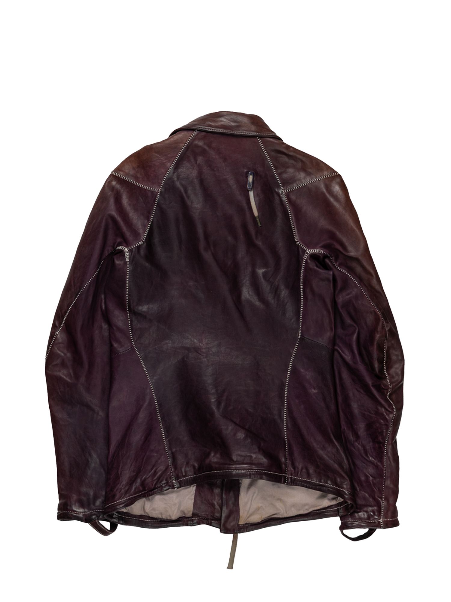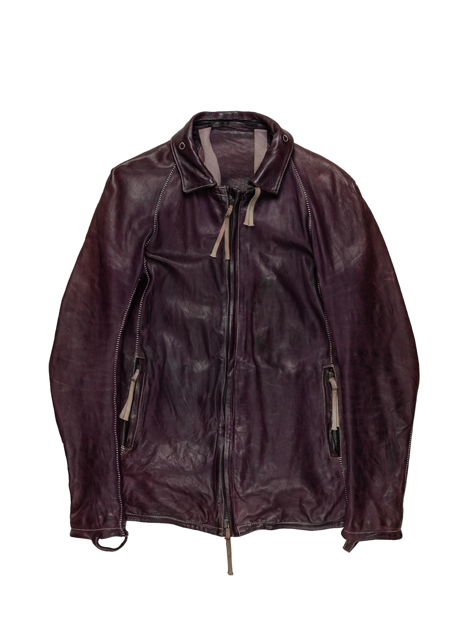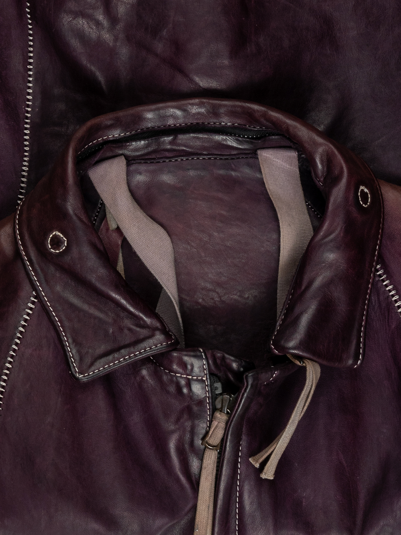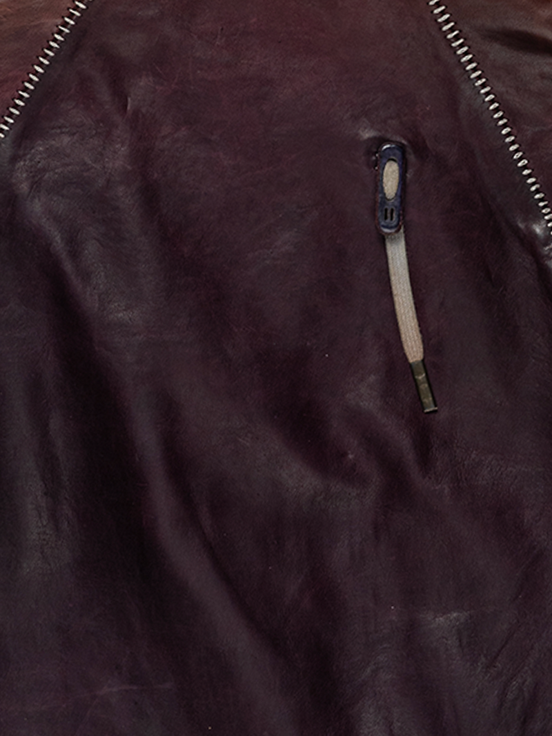 J2 leather jacket featuring heavy horse leather in a deep burgundy color. This exquisite jacket undergoes a stunning object dyeing process, resulting in a captivating patina that only improves with time. Inside the jacket includes shoulder straps and a net lining.