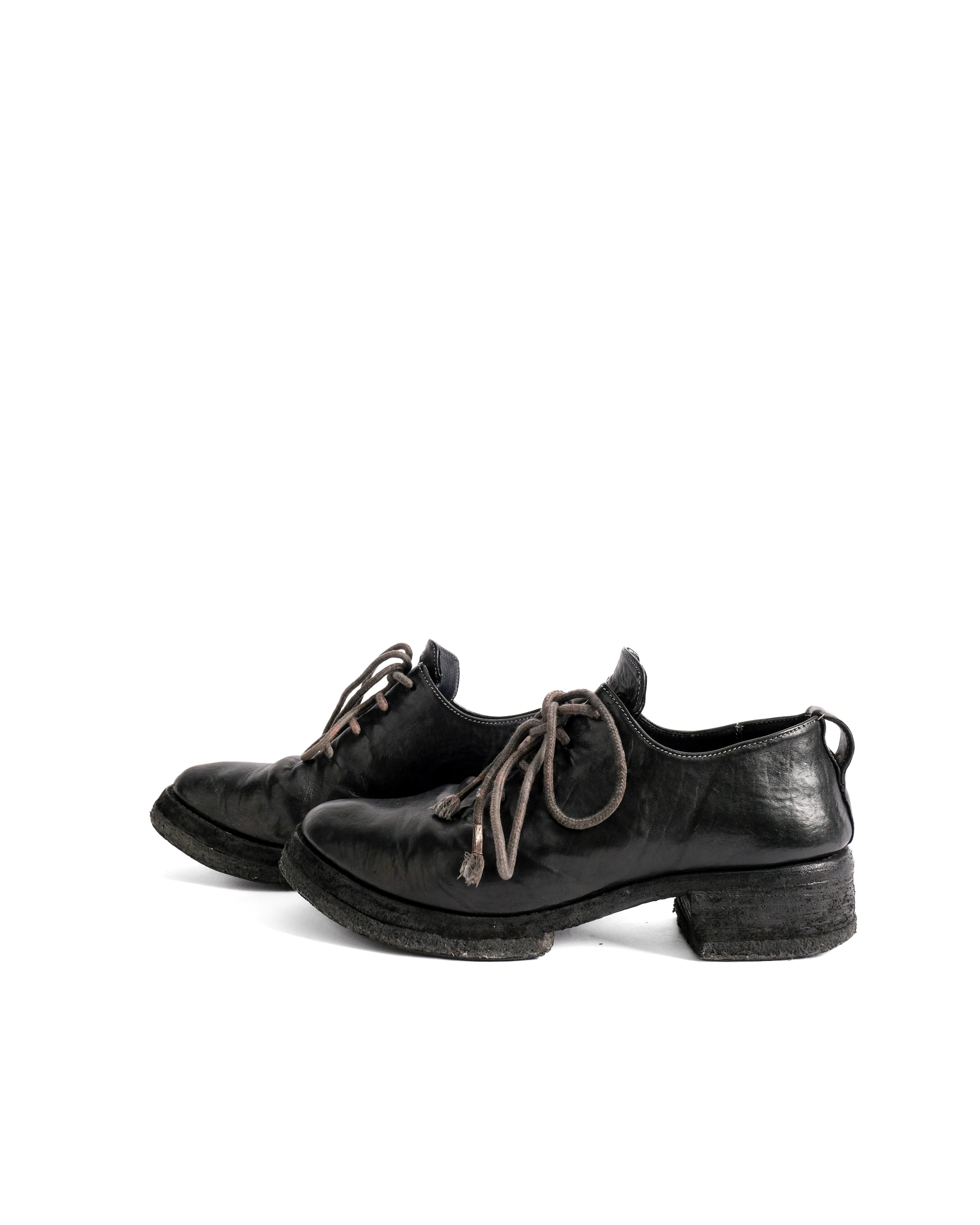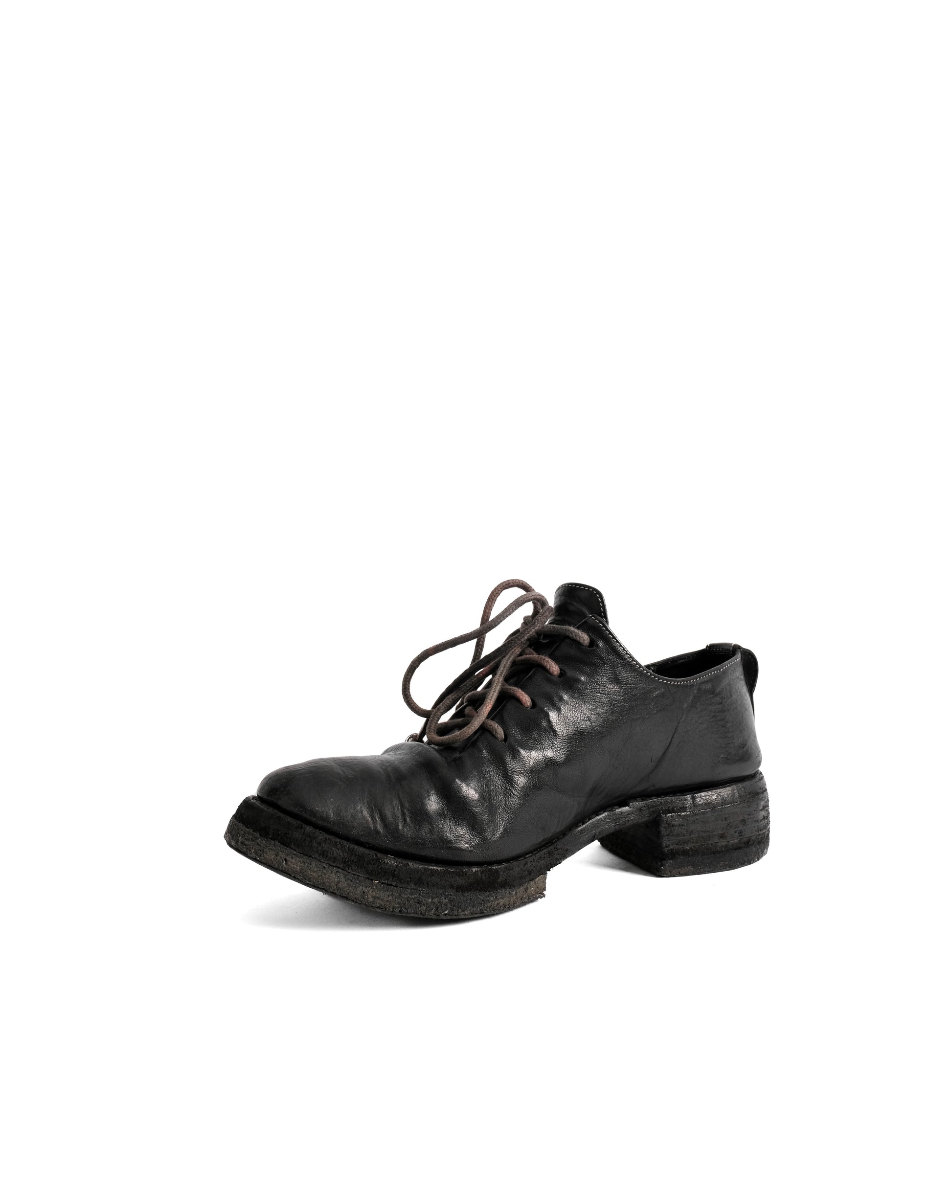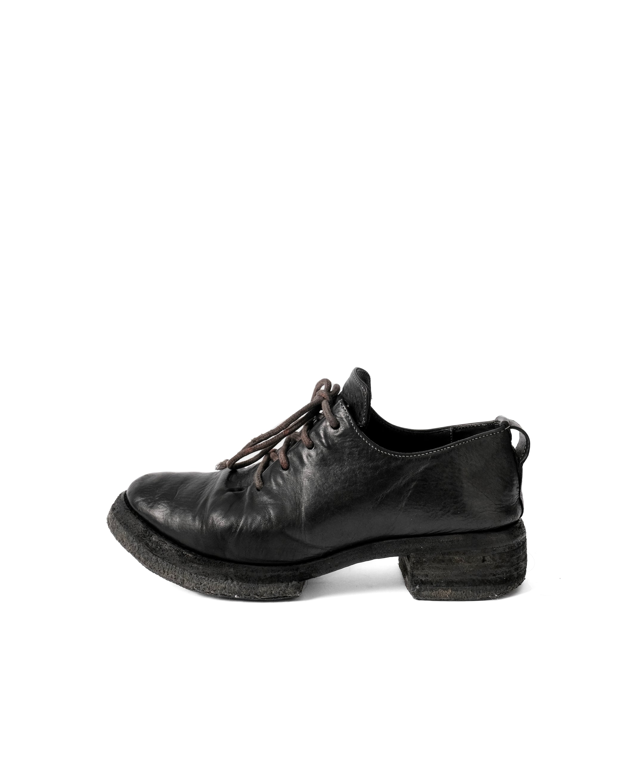 Crafted from horse leather and built using a reverse construction technique, the AM/2687 derbies draw inspiration from traditional military officer footwear. They undergo Poell’s signature object-dyeing process to achieve their deep grey tone, resulting in subtle variations unique to each pair. The design is finished with a leather-stacked heel, a durable rubber outsole, and a distinctive front silhouette shaped by Poell’s one-fold leather method, giving the shoes their unmistakable sculptural character.