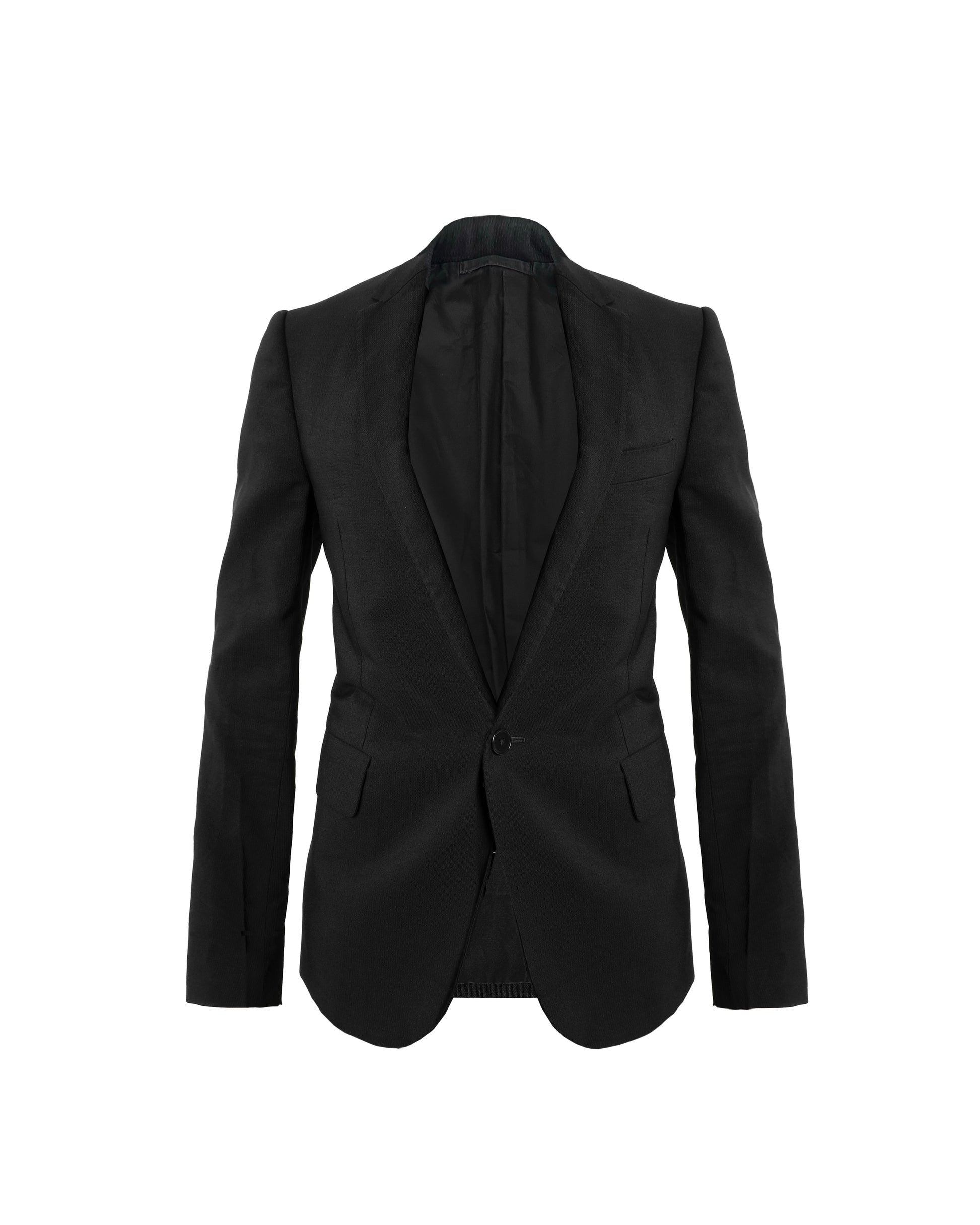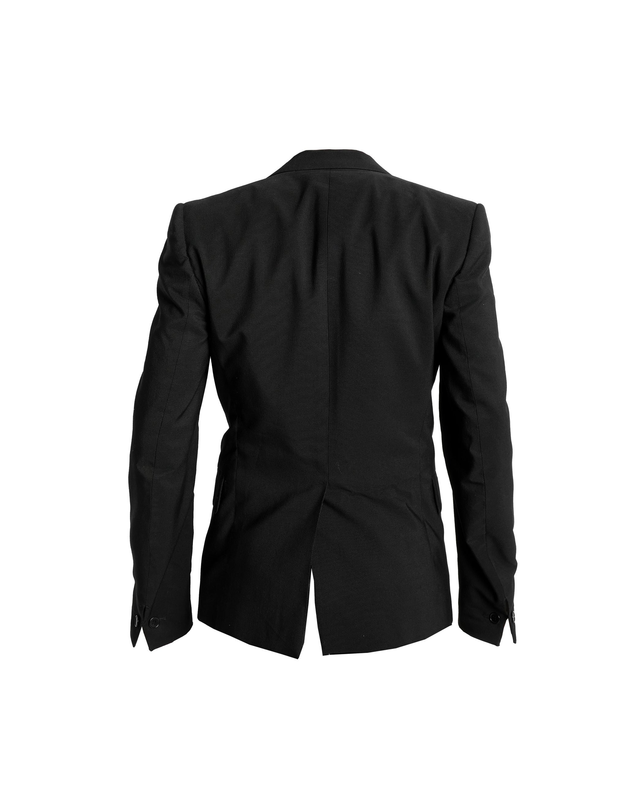 Crafted from his TEER/10 fabric—a densely woven, technical cotton blend treated for a dry, matte handle—the piece forms a structured, anatomical silhouette that moves with precision. The blazer features Poell’s hallmark exposed and “broken” seam construction, internally reinforced and bonded for durability while retaining its deconstructed visual character. A sharply contoured shoulder line, narrow waist, and elongated body create a refined yet avant-garde profile. Finished with tonal hardware, subtle darting, and a fully lined interior for a clean, architectural fit.