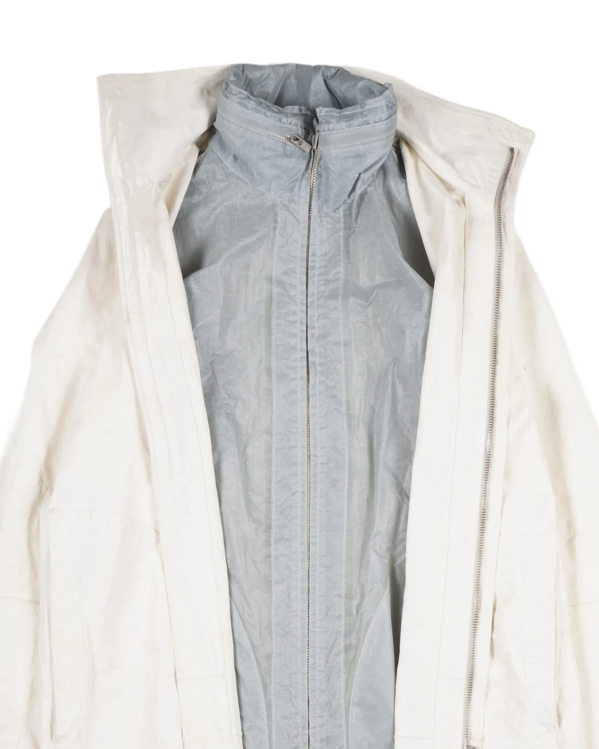 What sets this parka apart is its thoughtfully engineered kite-style lining—a lightweight, technical ripstop-like material originally developed for convertible windproof pieces that can function independently or layered under heavier outerwear for added versatility and weather protection. This lining enhances the parka’s utility while adding a contrasting visual texture and technical dimension to the classic leather exterior.