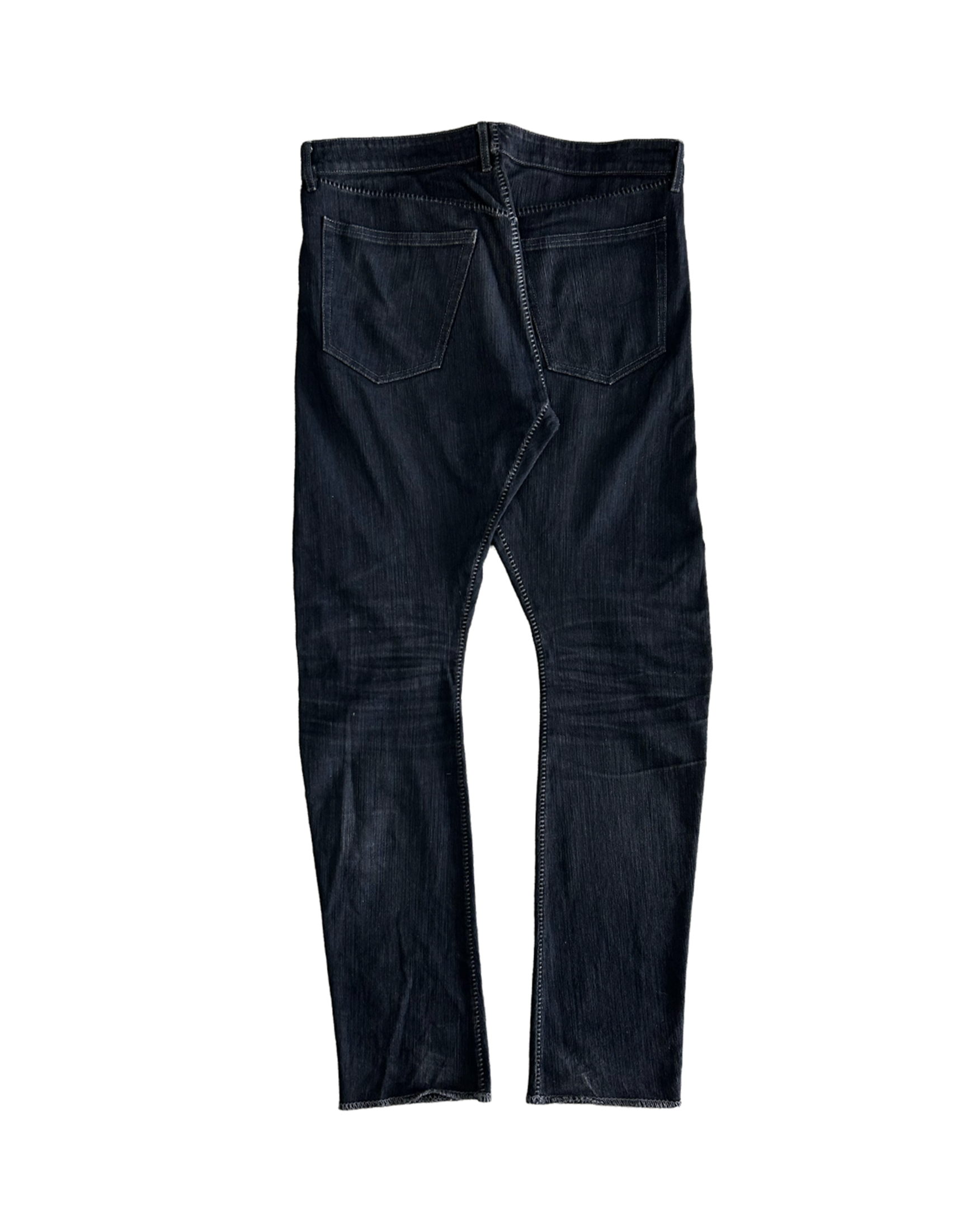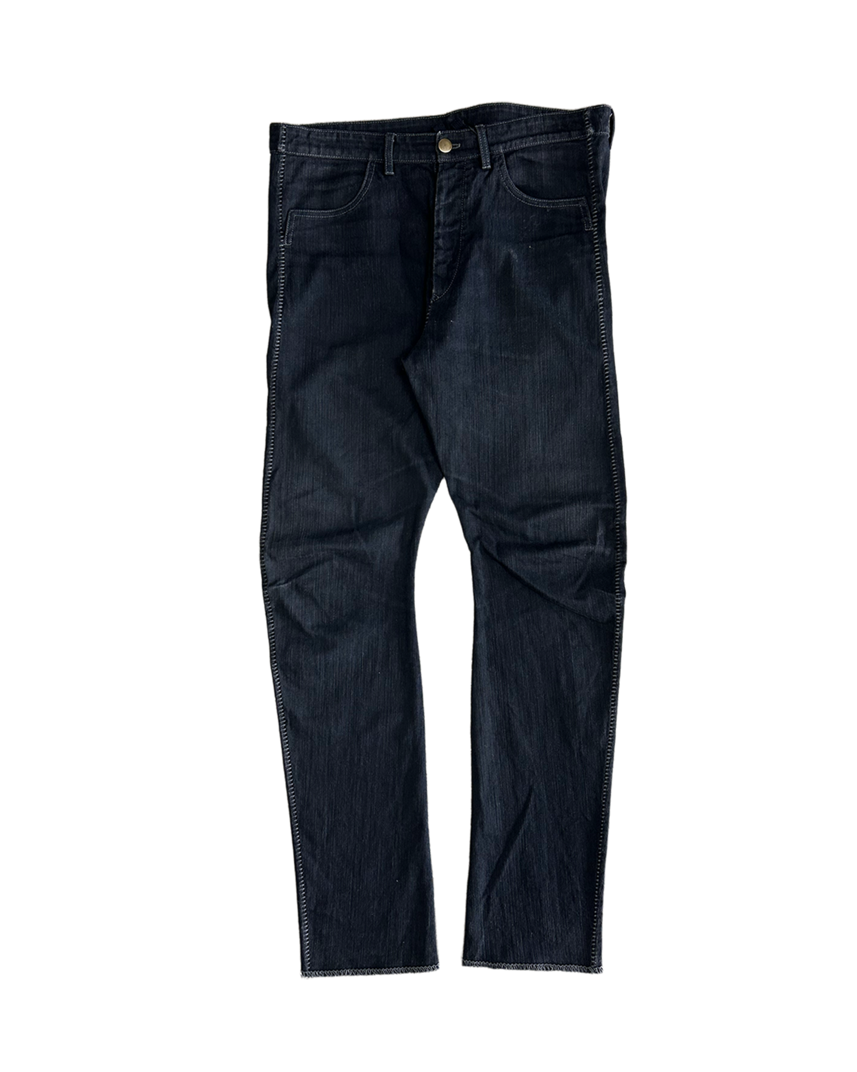 These denim pants feature distinctive overlock stitching and a front button closure.