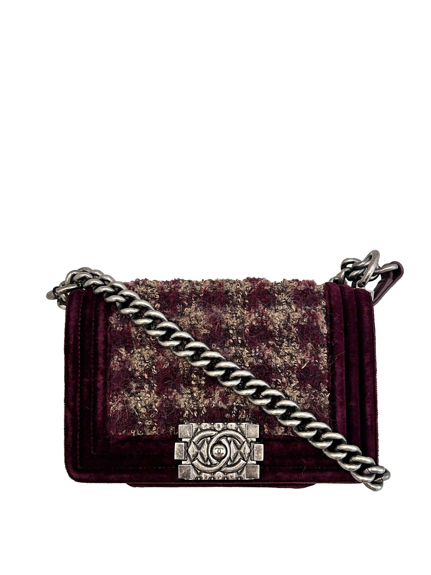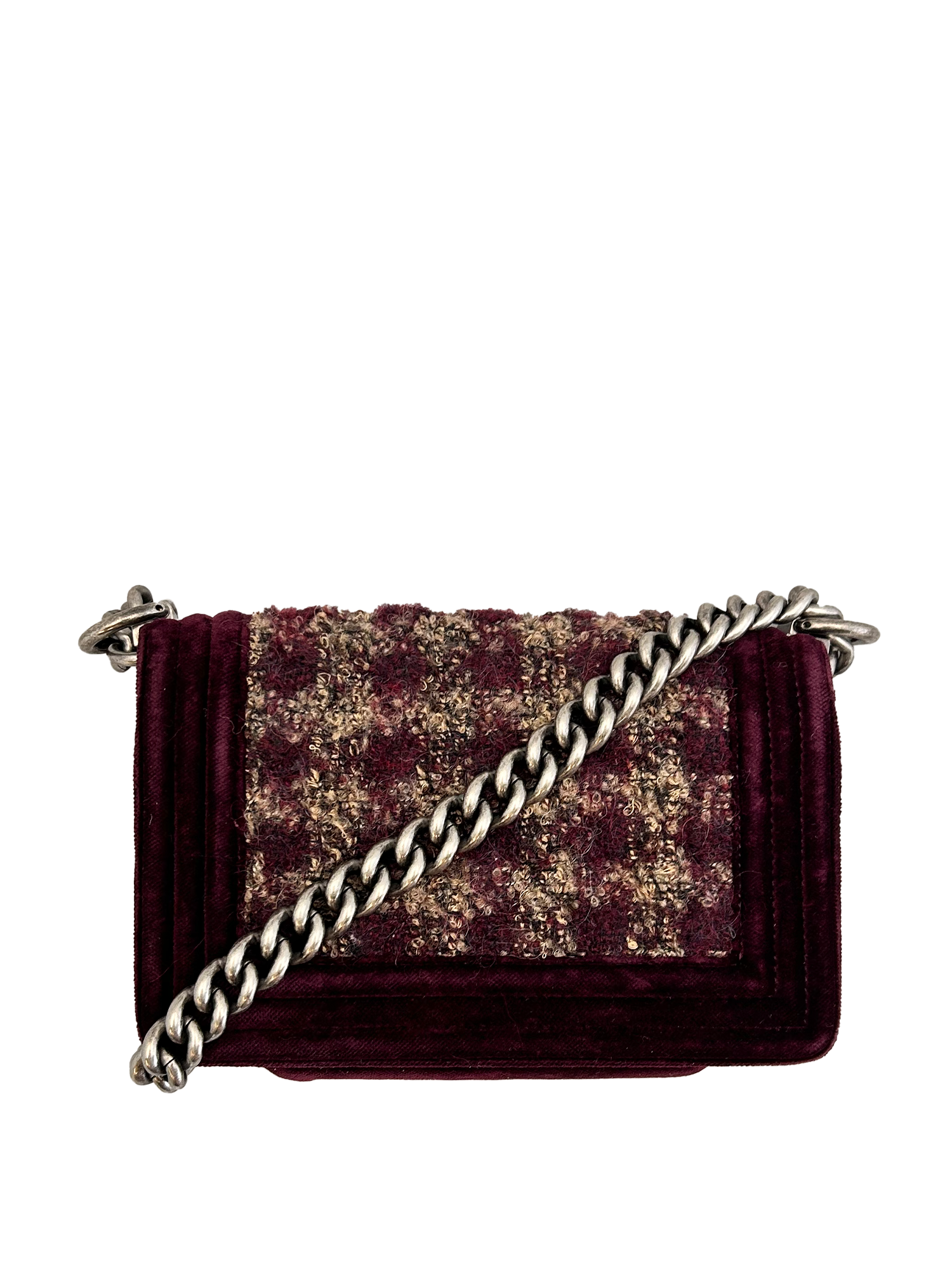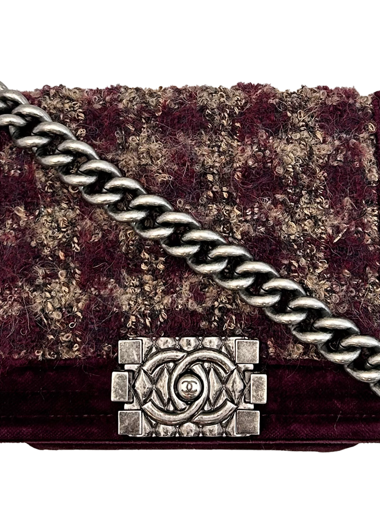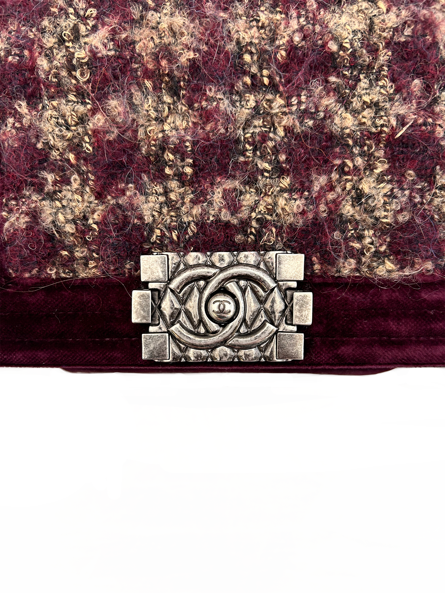 This woven tweed bag with black leather trimming features elegant ruthenium hardware and a secure turn lock clasp for easy access. The front flap opening reveals a sleek black nylon interior, complete with a small slit pocket