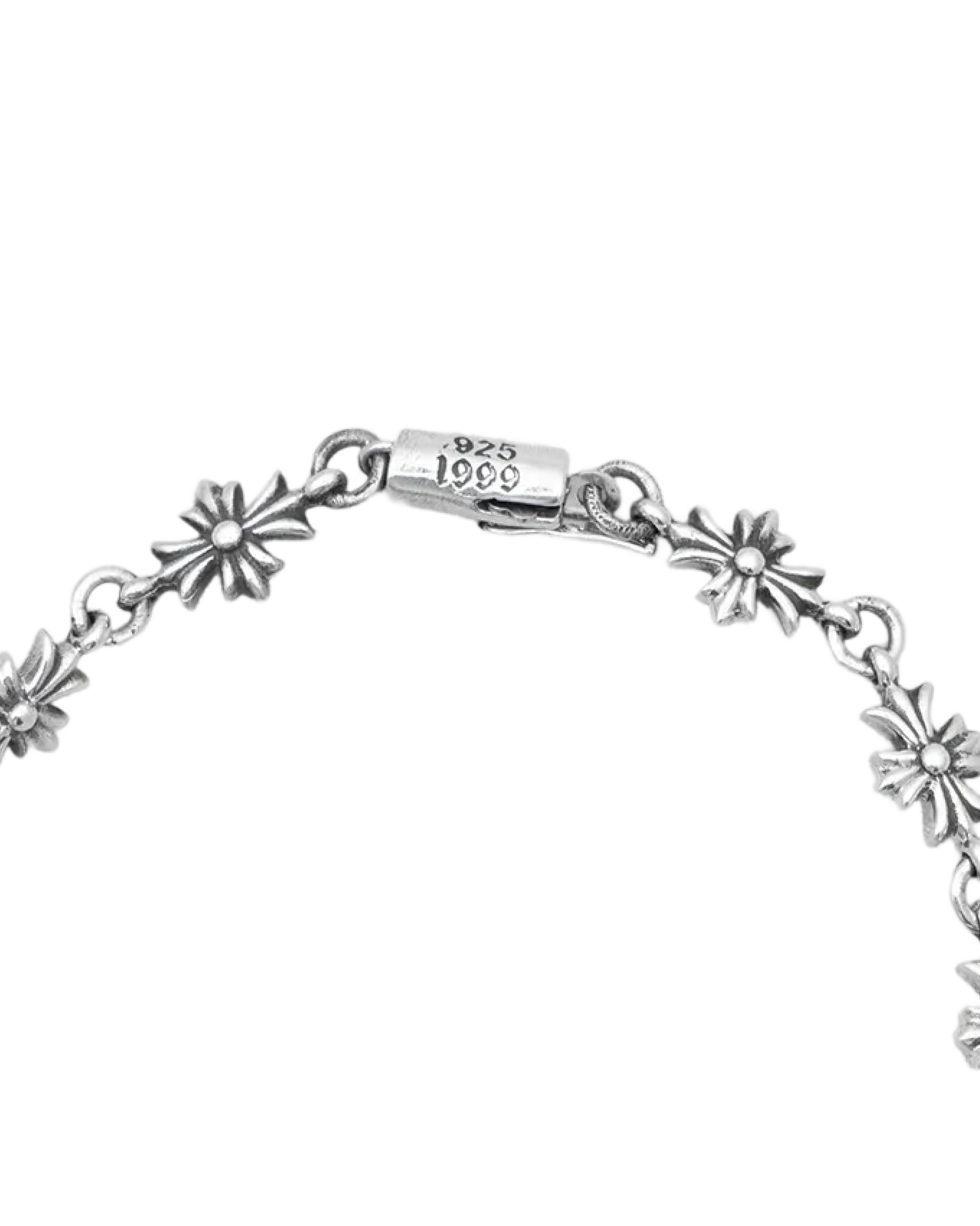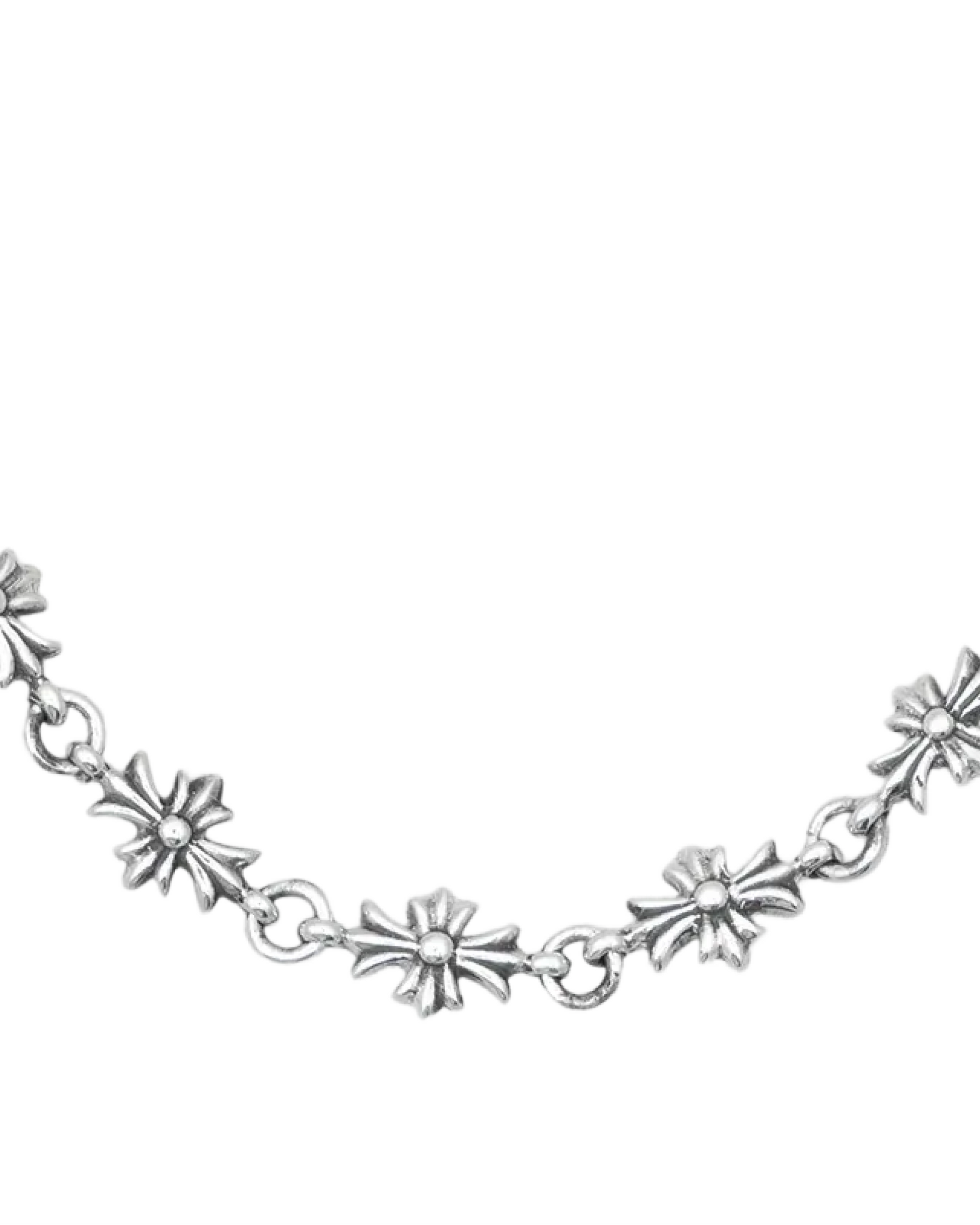 The Chrome Hearts Tiny E Bracelet is a subtle yet unmistakable expression of the brand’s handcrafted luxury. Made from solid .925 sterling silver, an architectural design element that reflects Chrome Hearts’ dedication to intricate metalwork. Each link is individually cast and polished, creating a smooth, cohesive chain with a distinctive gothic edge.