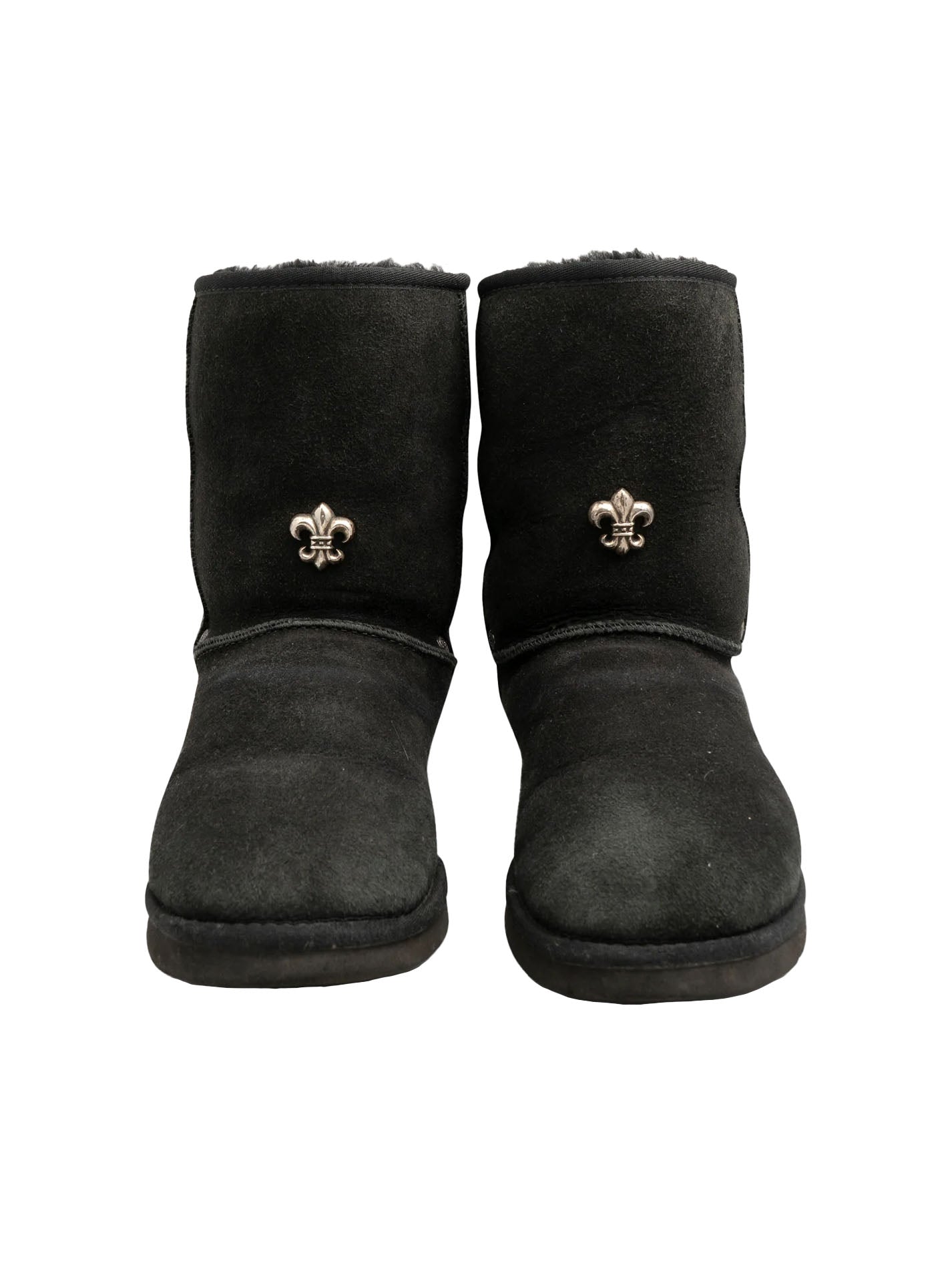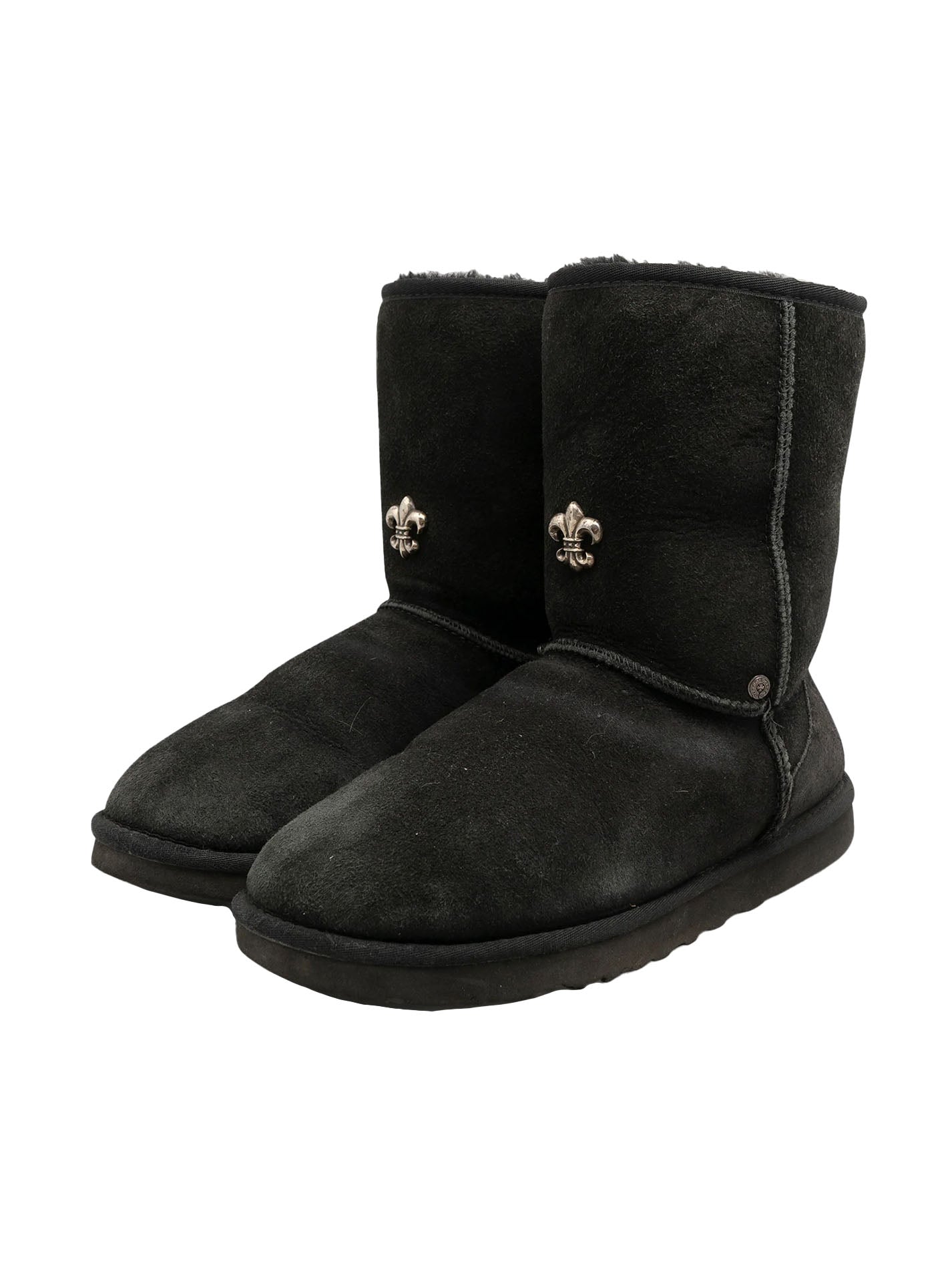 A pair of black fur Ugg boots with Chrome Hearts sterling silver hardware on the front and sides.
