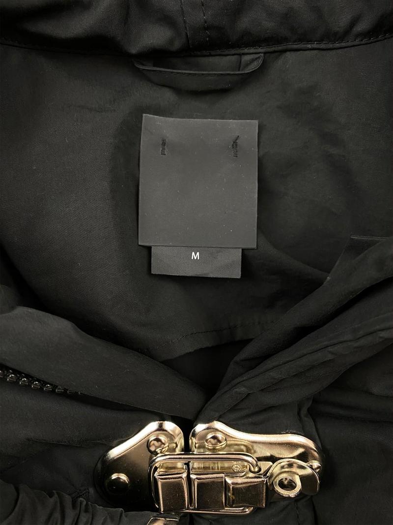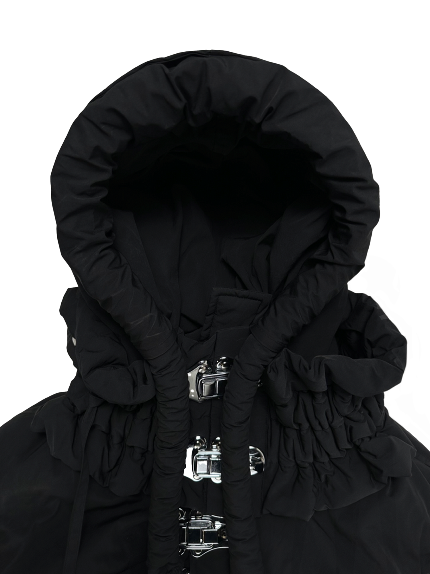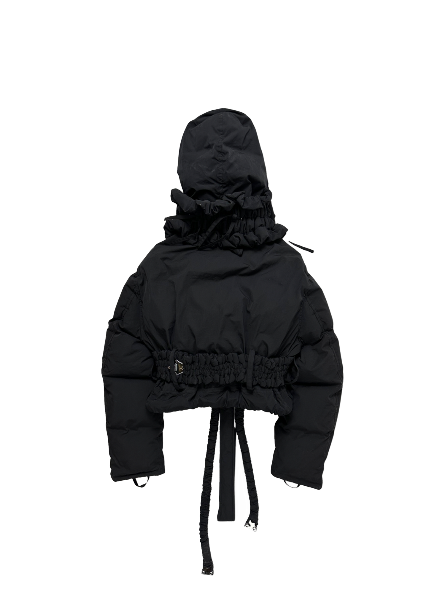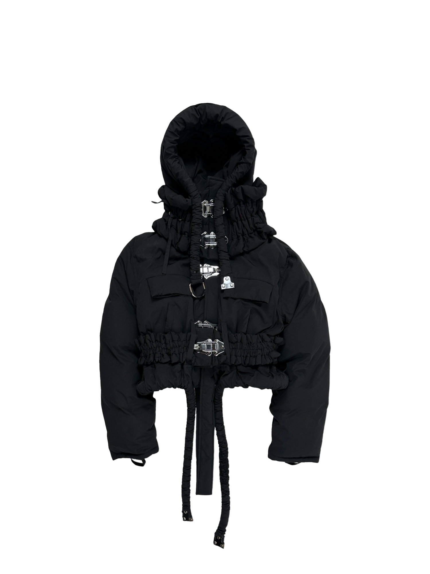 Crafted from a downfilled cotton fabric, this jacket features a high neckline, long sleeves, and a drawstring waist for a custom fit. The front of the jacket is adorned with heavy-duty hardware clasps. The jacket is finished with two side pockets and a drawstring hem for a secure fit. Customizable straps at the neck and waist with an exaggerated silhouette.