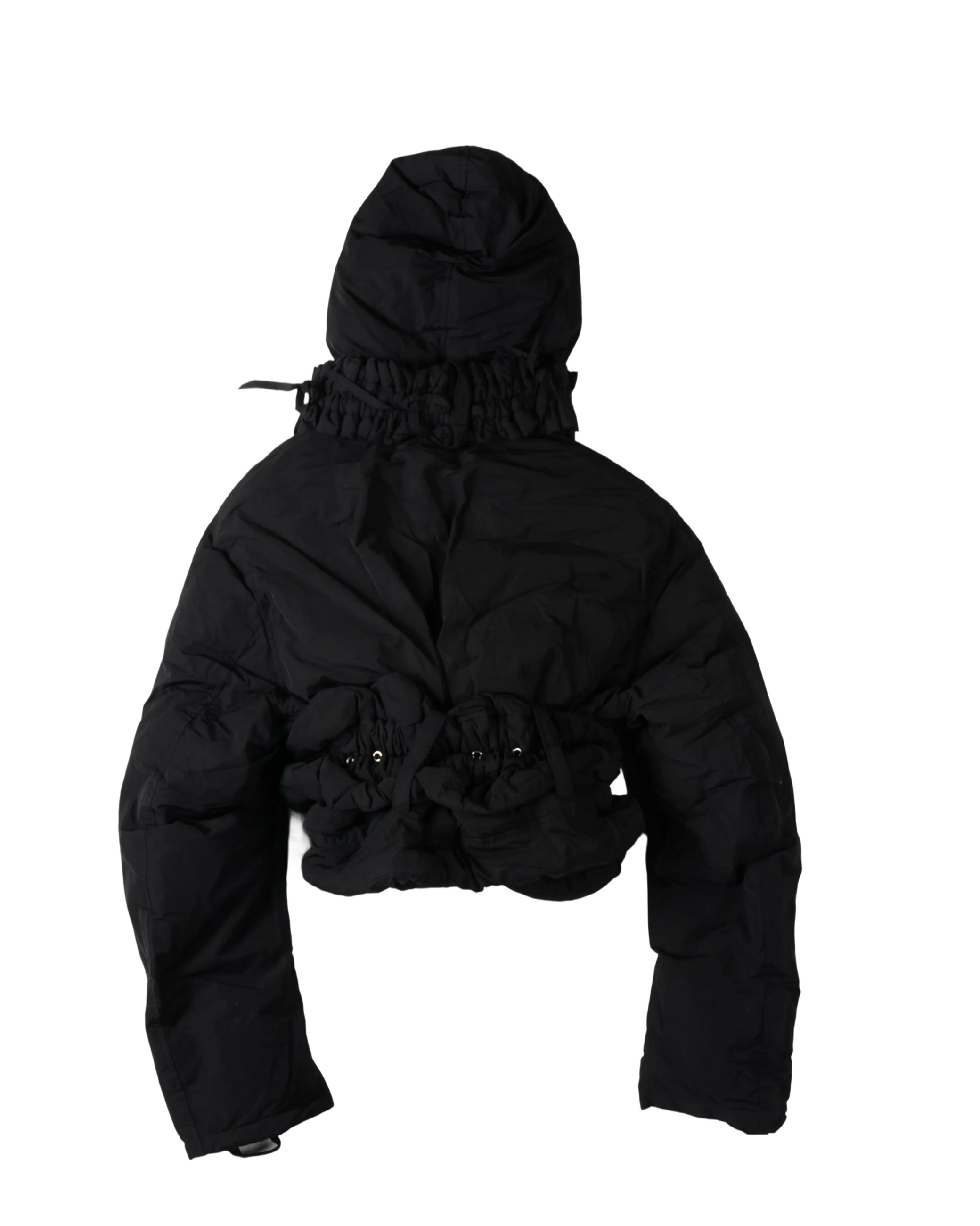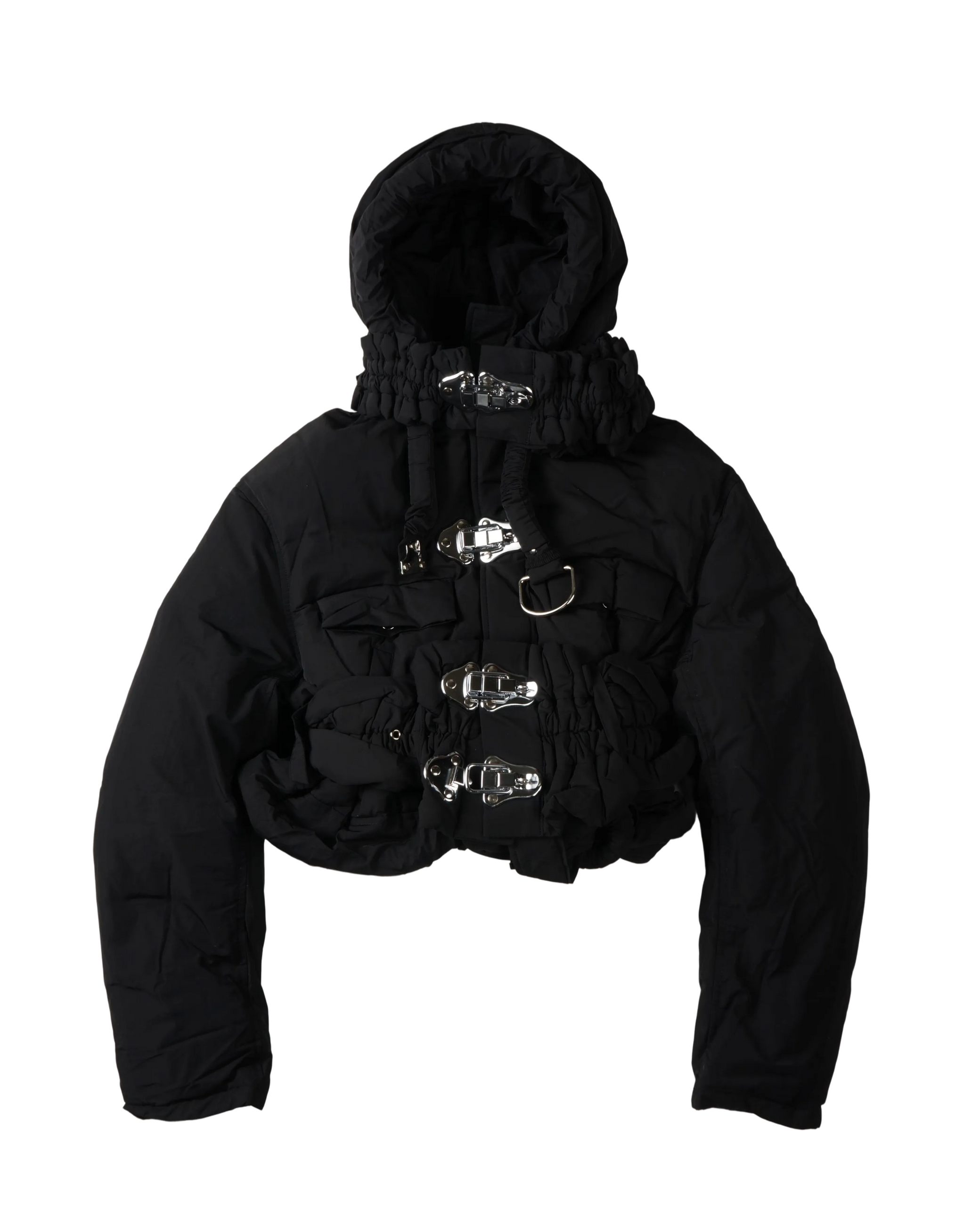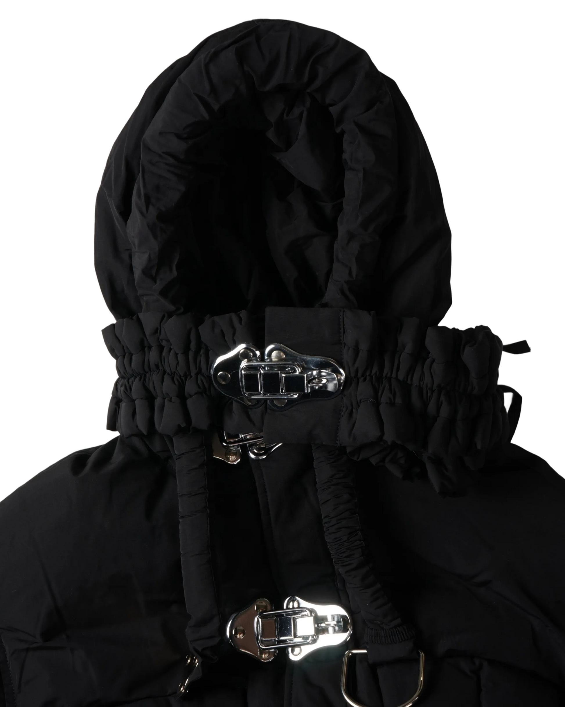 Crafted from a downfilled cotton fabric, this jacket features a high neckline, long sleeves, and a drawstring waist for a custom fit. The front of the jacket is adorned with heavy-duty hardware clasps. The jacket is finished with two side pockets and a drawstring hem for a secure fit. Customizable straps at the neck and waist with an exaggerated silhouette.