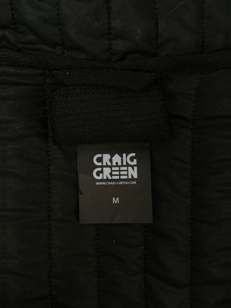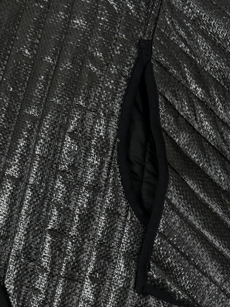 Constructed from a lightweight, water-resistant metallic fabric, the jacket has an oversized fit with large box back panels that are secured with adjustable snap straps. The voluminous cut is complemented with oversized sleeves, and laces on the sides and sleeves. The jacket is enhanced by hints of geometric detailing on the front and shoulder, adding a contemporary touch to the traditional samurai silhouette. The look is finished with an understated black trim, creating a look that is both modern and sophisticated.