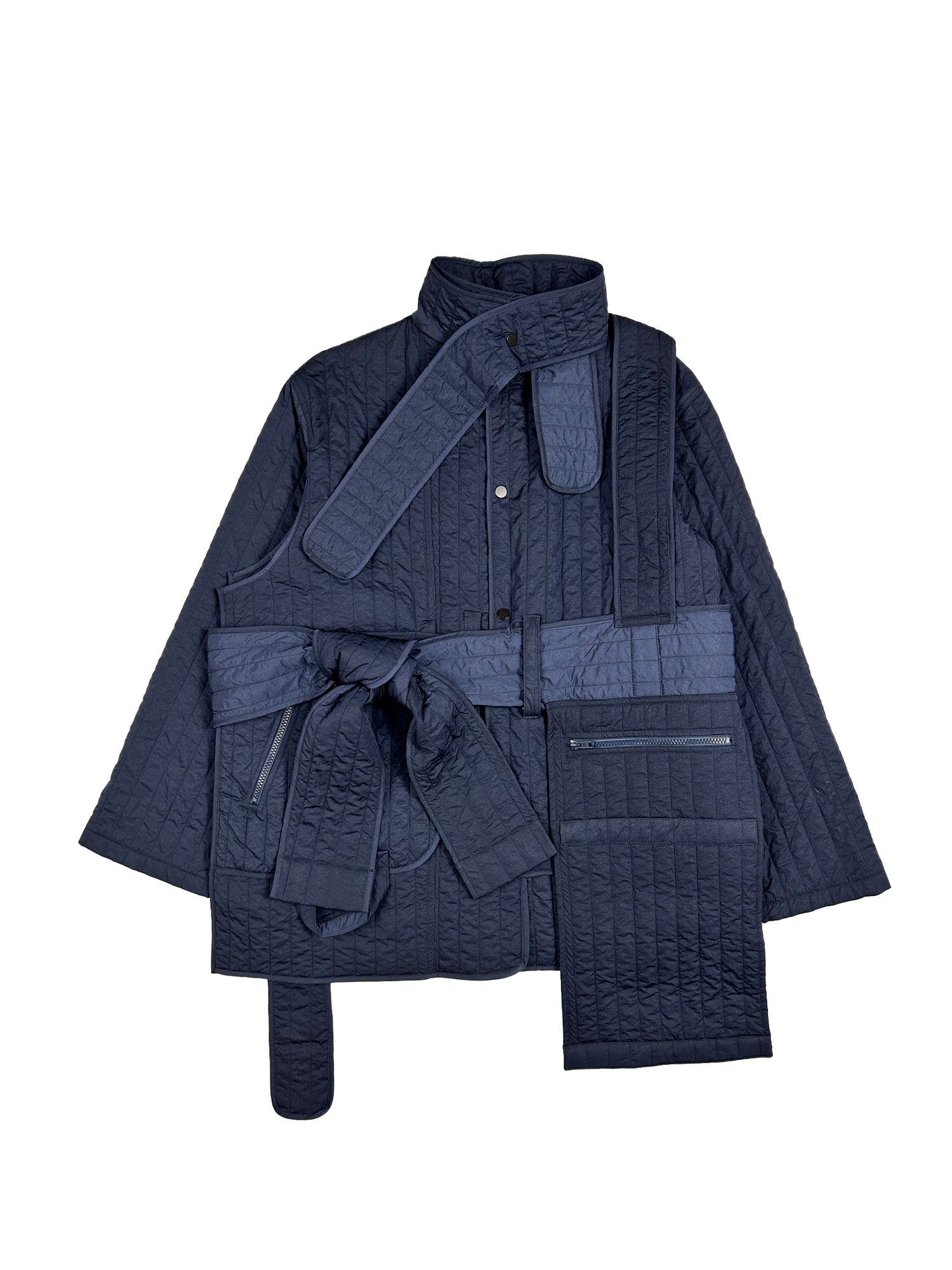 The jacket, influenced by samurai aesthetics, includes an adjustable waist strap and three zipped pockets. On the left side, the jacket is entirely detached, held in place solely by the belt when fastened.