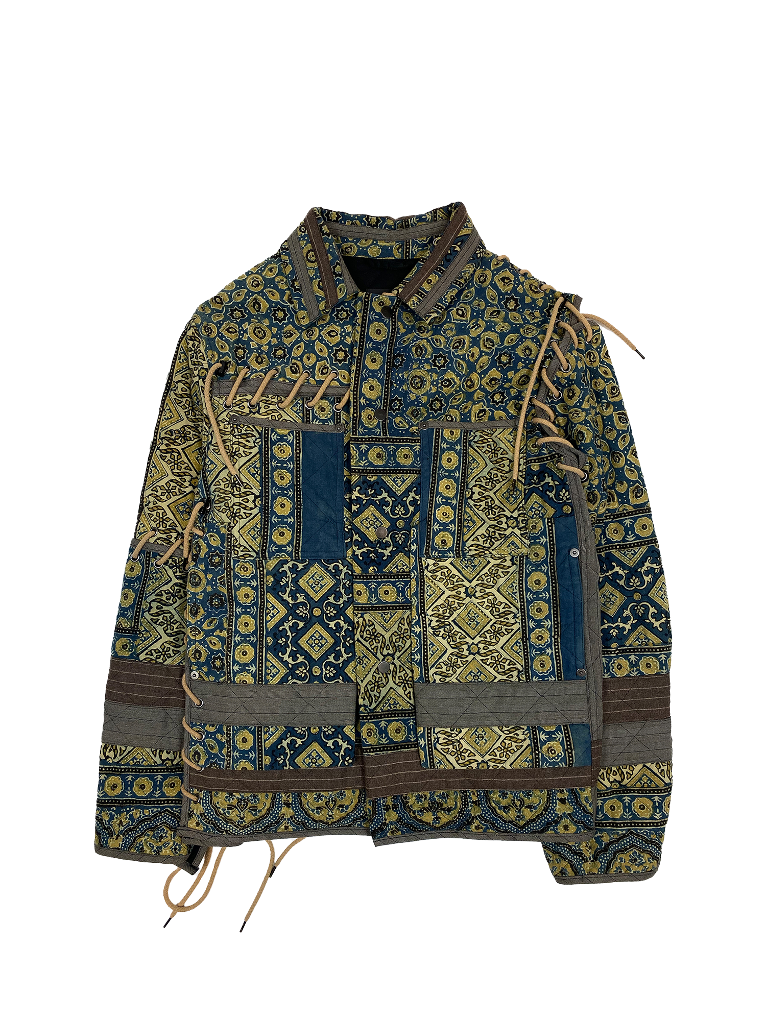 The jacket seen on the runway feature a quilted textile with deconstructed elements tied together with cord and eyelets.