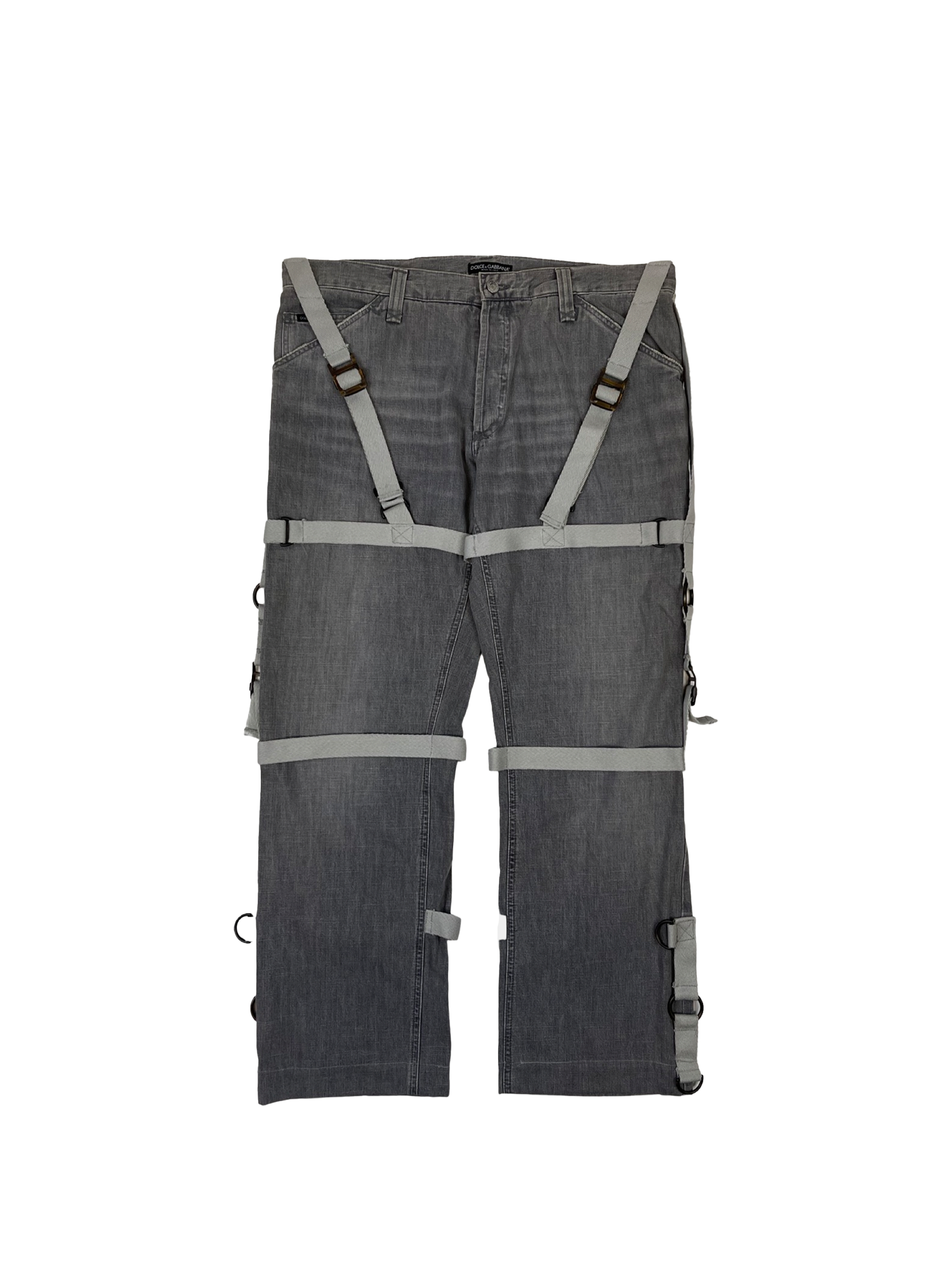Denim jeans outlined with adjustable bondage straps throughout, with oversized silver hardware logo patch on the waist.