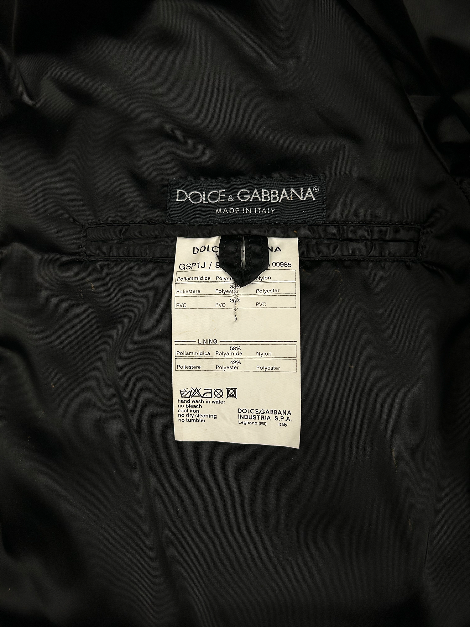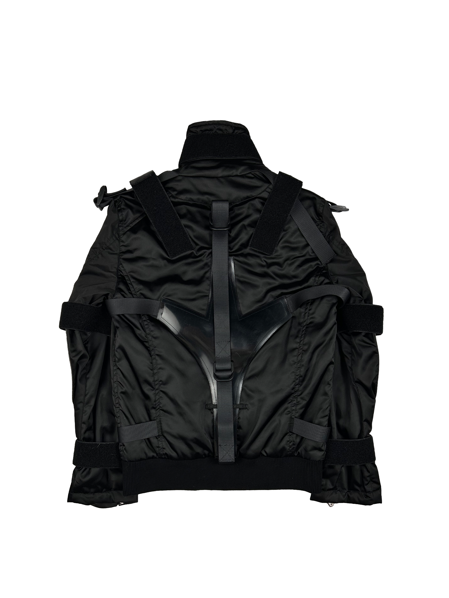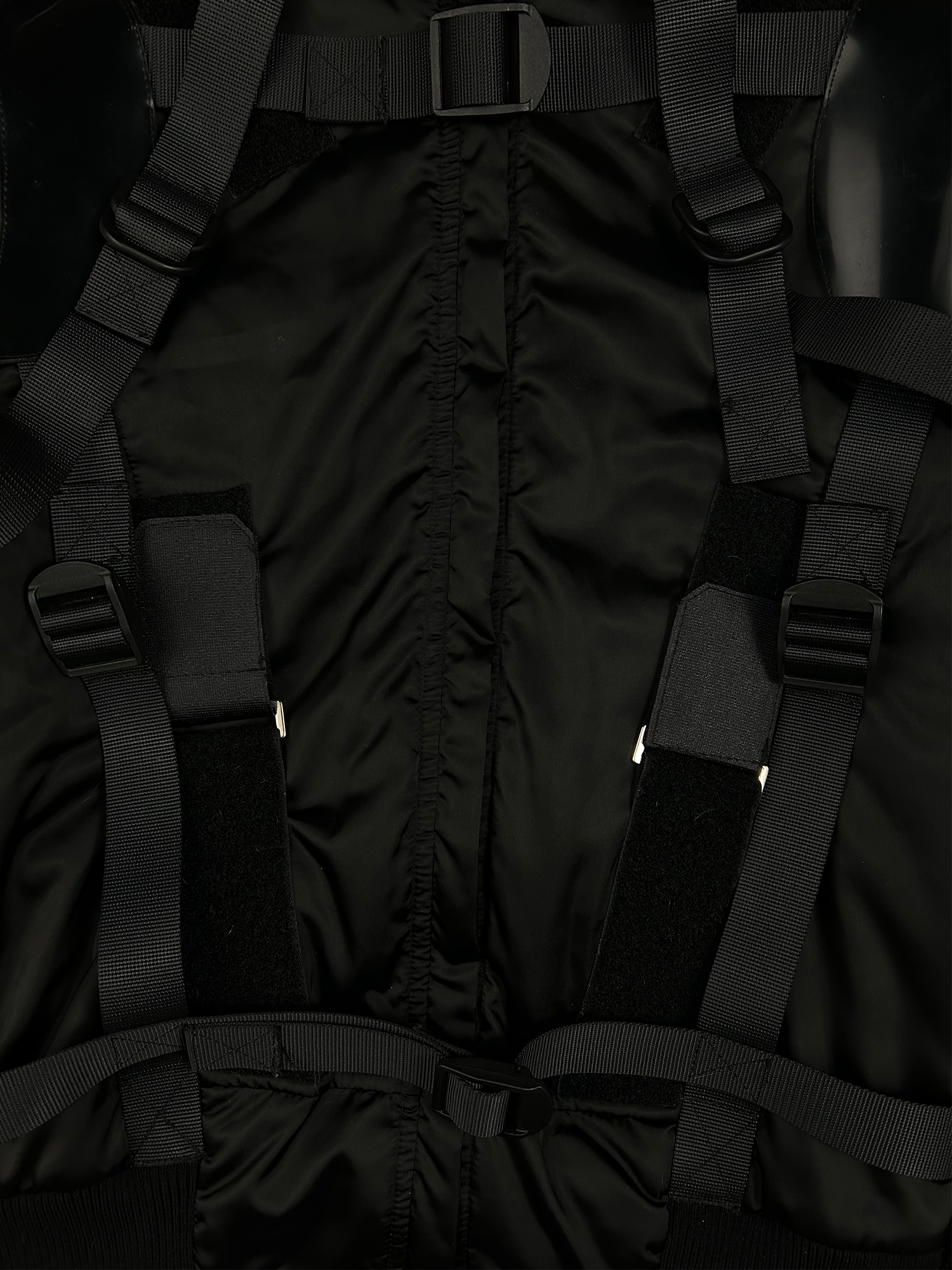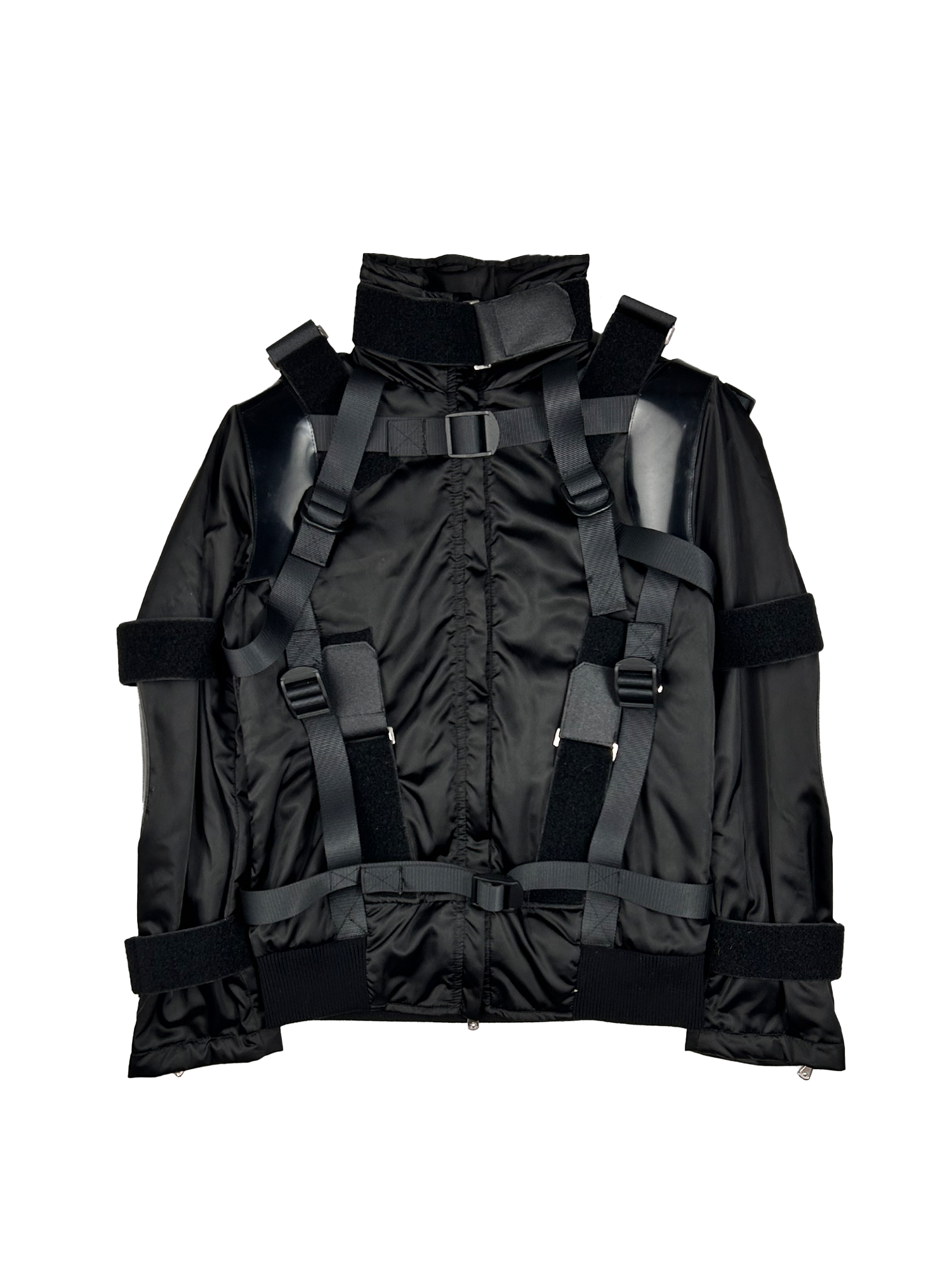 This nylon jacket showcases intersecting bondage straps secured with buckles. Additionally, it includes a parachute harness-style fastening below the straps and double strapped cuffs on each sleeve for added detail.