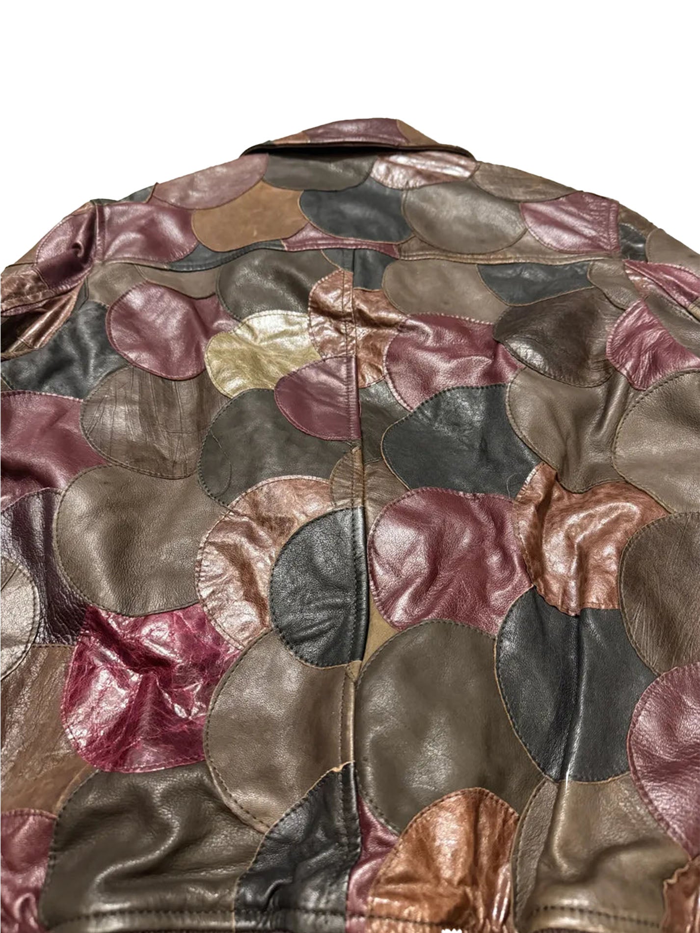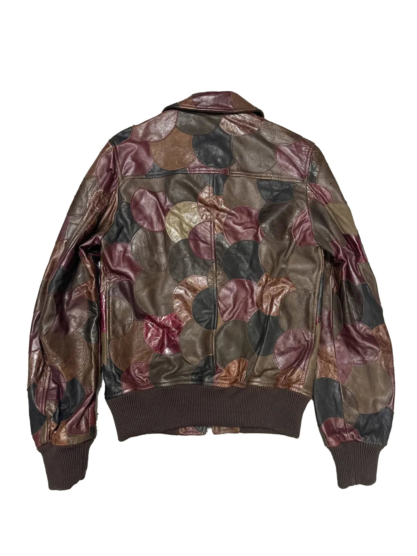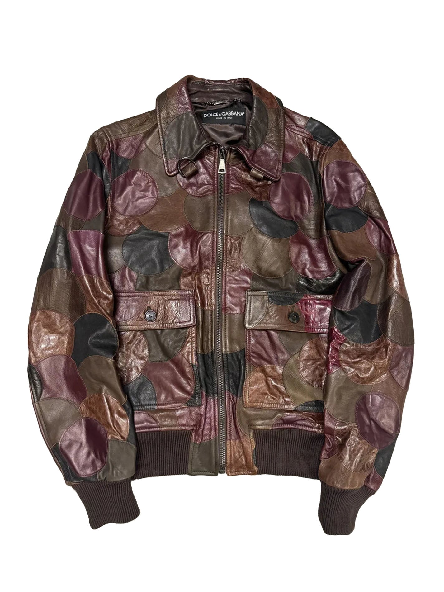 This AW2008 Dolce & Gabbana Patchwork Circle Burgundy Leather Jacket showcases artisanal craftsmanship with its intricate patchwork design crafted from rich burgundy leather. The circular panel details create a dynamic texture that adds depth and character to the jacket’s classic silhouette. Thats such a rare jacket.