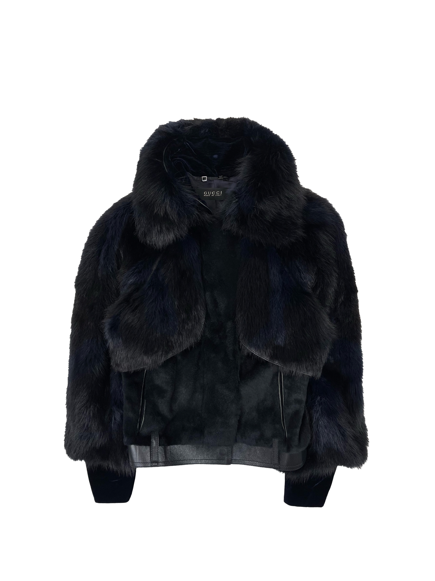 Weasel and rabbit fur jacket from Tom Ford’s tenure at Gucci. Outlined with a leather trim, concealed zip and button closure, belt loops, and fully lined.