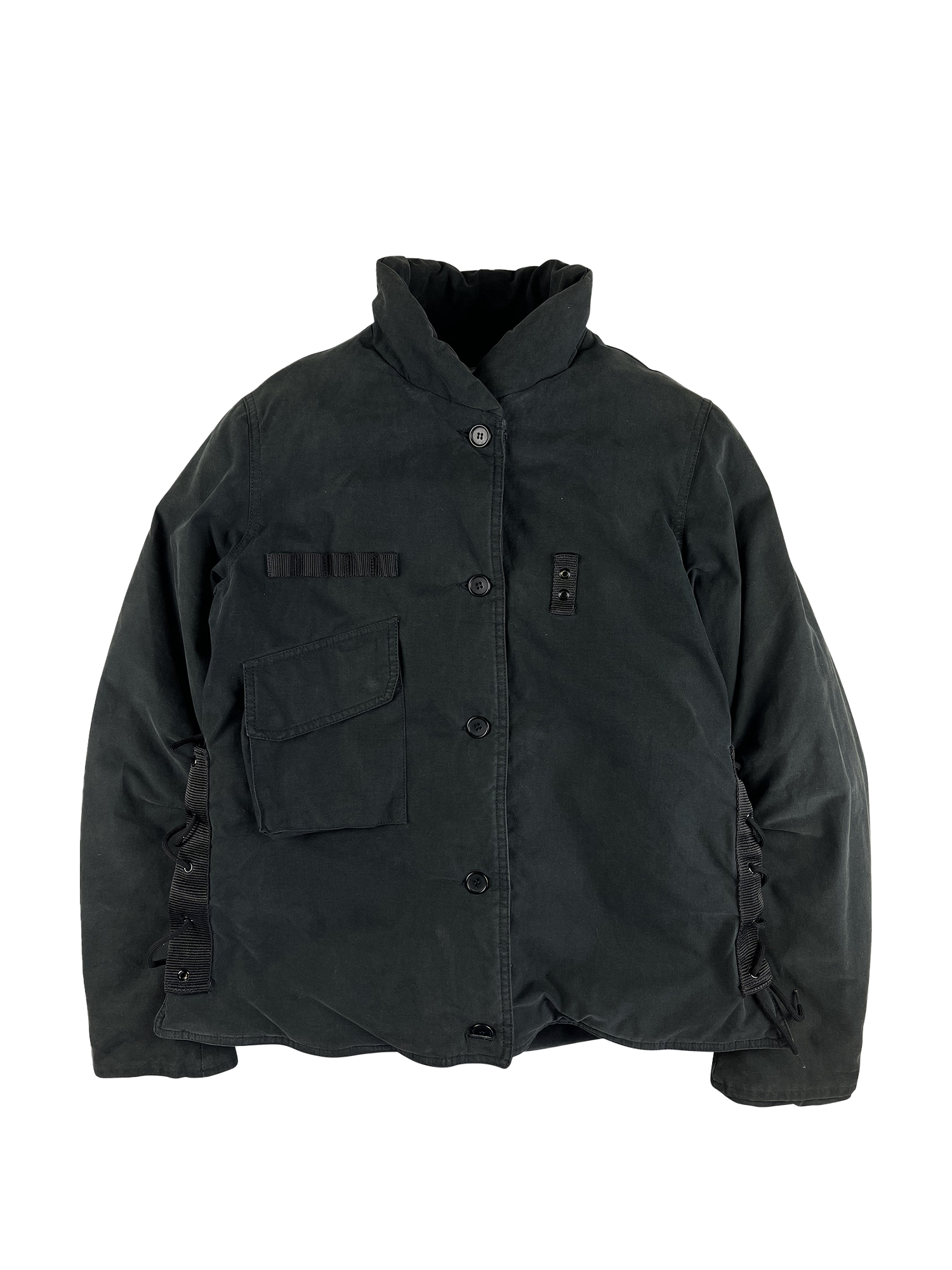 Inspired by the US Army M69 Flak vests, this jacket is one of the most coveted Helmut Lang pieces, as it encapsulates both his militaristic and bondage inspired work. It is made from densely woven cotton and nylon fabric, filled with pure goose down, allowing it to be windproof and water-resistant. It also features bondage carrying straps on the interior so the jacket can be carried like a backpack.