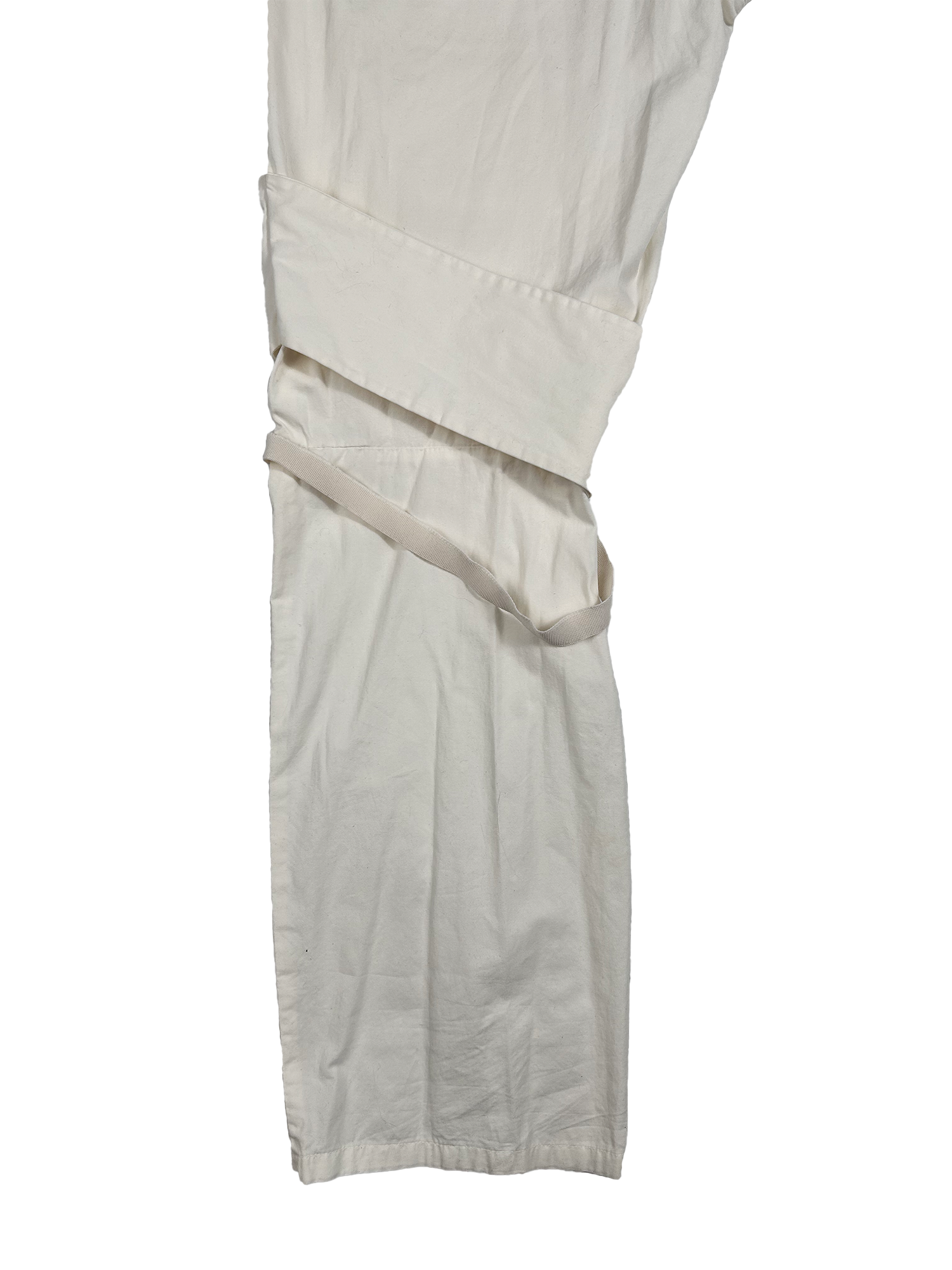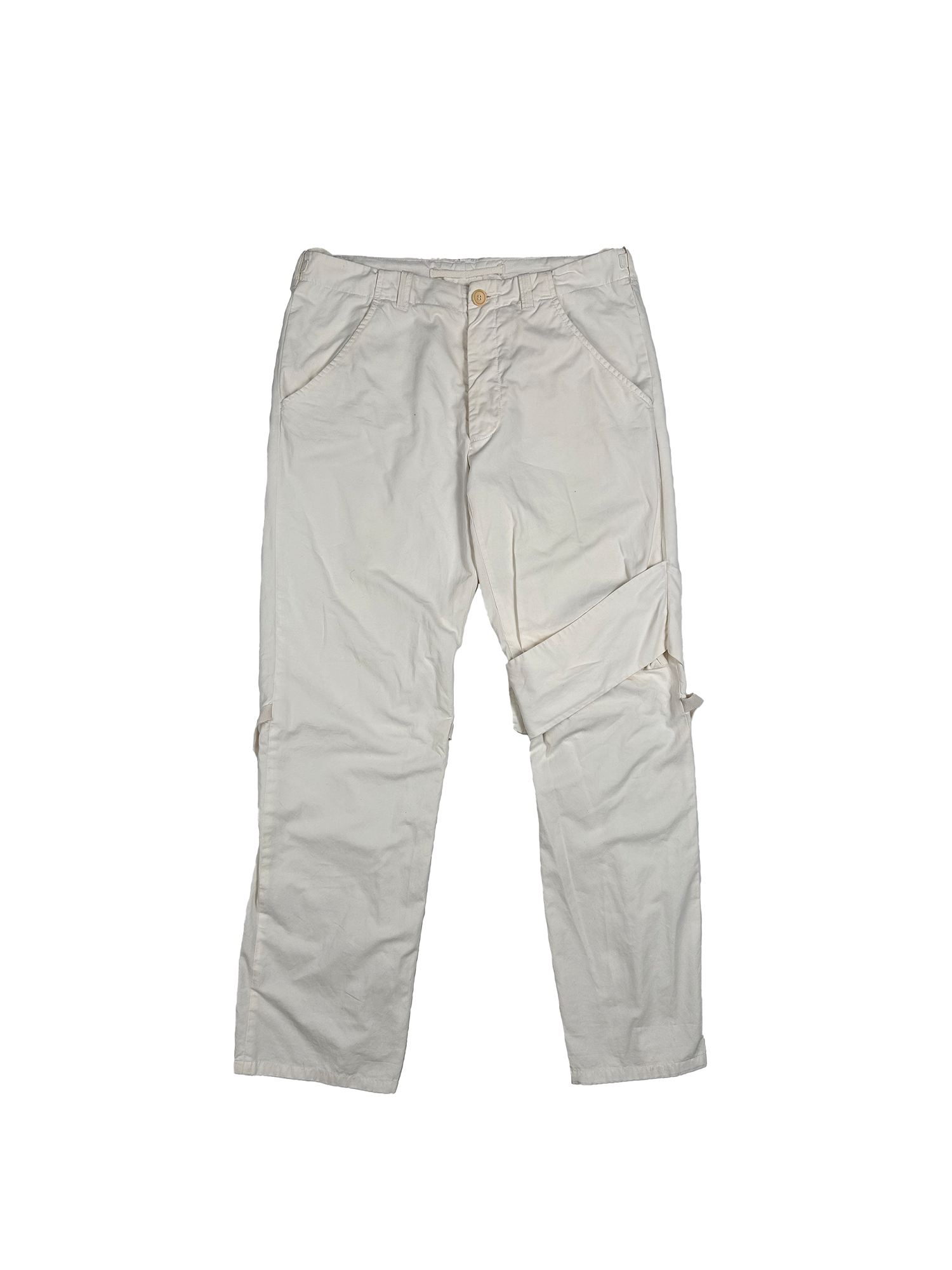 Crafted from a lightweight brushed cotton in an off-white hue, these pants feature a wide double velcro strap on the left knee, an elongated left cargo pocket, and matching rear off-white elastic bands on both knees. They are designed in a straight leg fit.