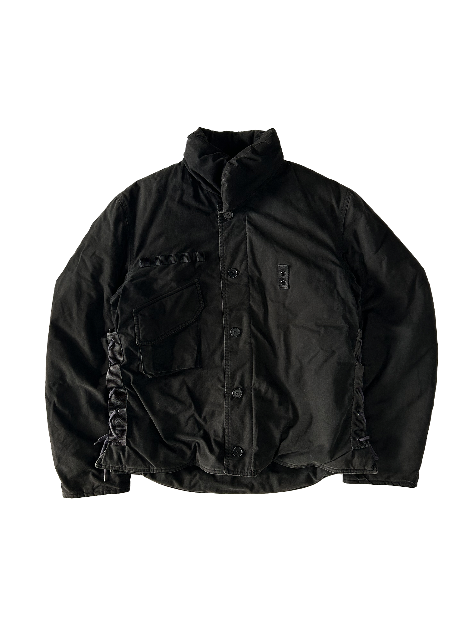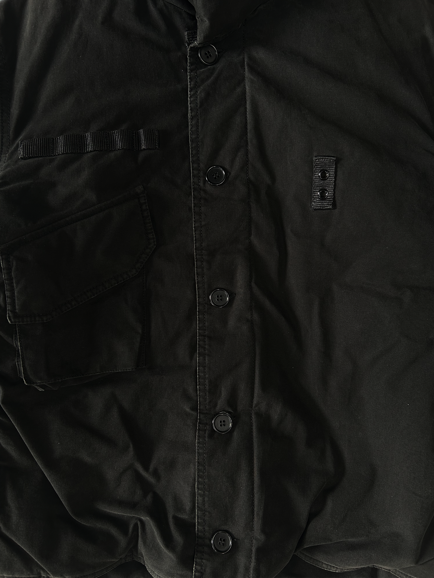 Inspired by the US Army M69 Flak vests, this jacket is one of the most coveted Helmut Lang pieces, as it encapsulates both his militaristic and bondage inspired work. It is made from densely woven cotton and nylon fabric, filled with pure goose down, allowing it to be windproof and water-resistant. It also features bondage carrying straps on the interior so the jacket can be carried like a backpack.