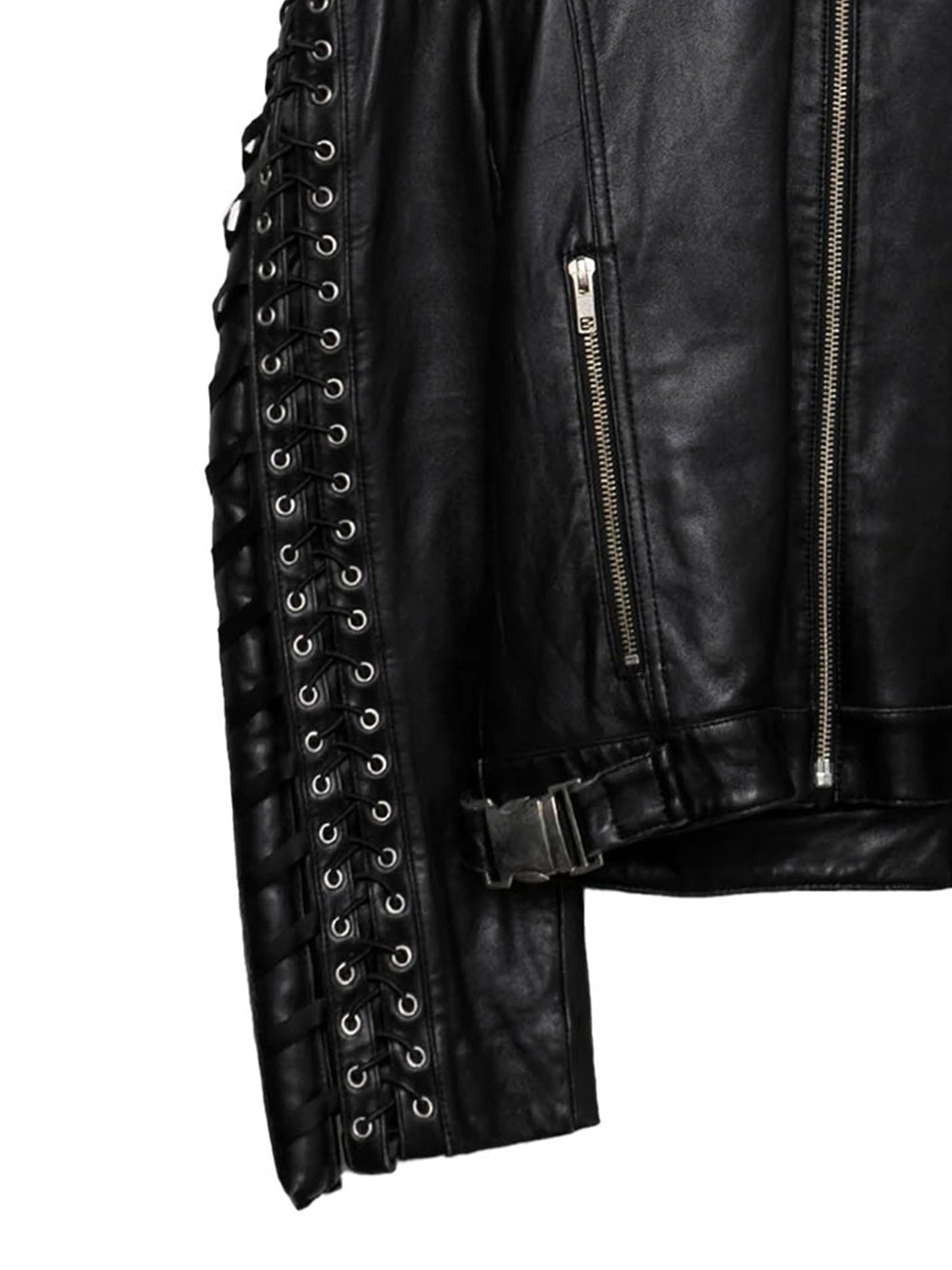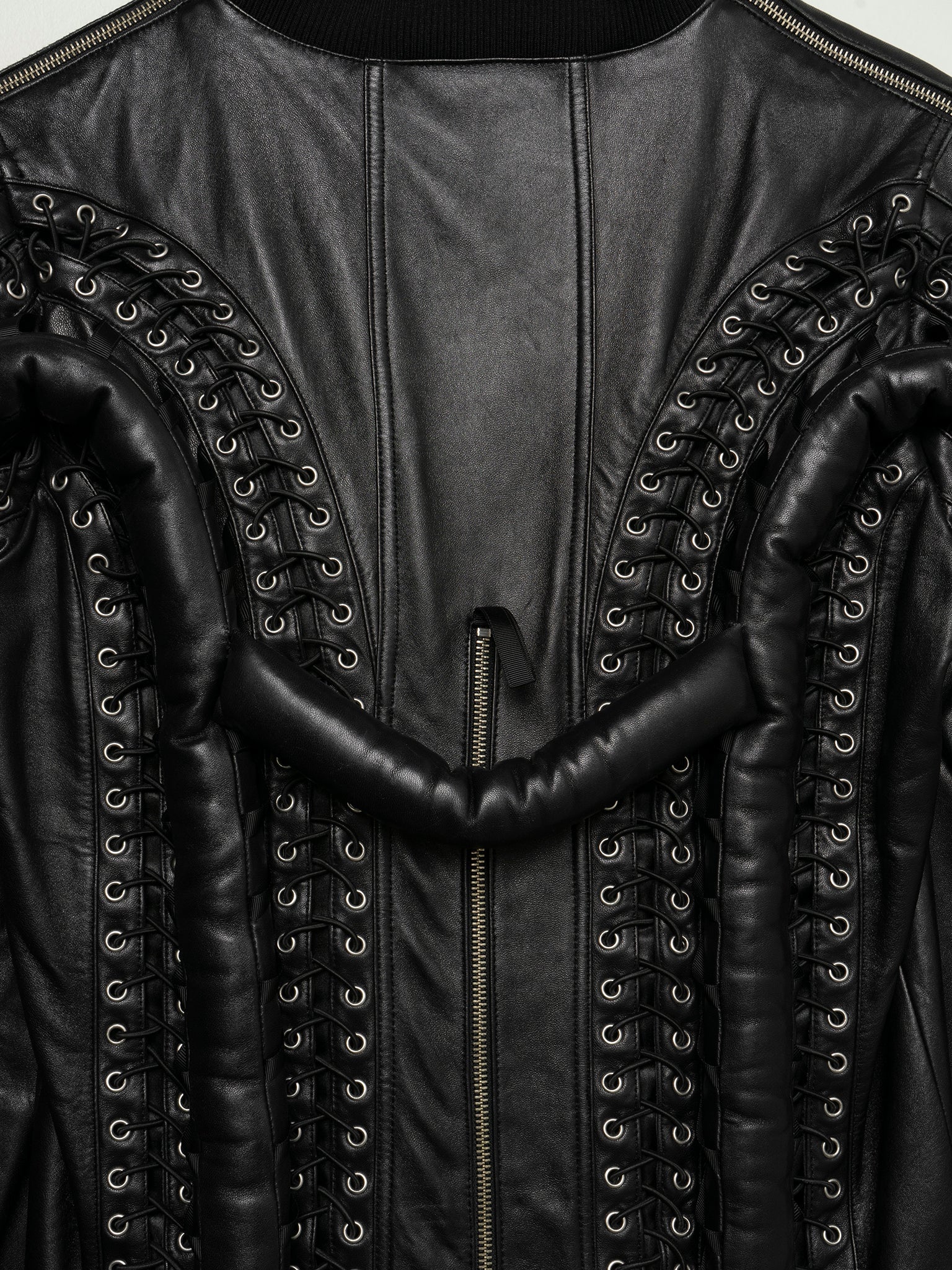 An incredibly intricate lamb leather flight jacket from Shayne Oliver's Hood By Air with intense metal and rope details as well as double front zip.