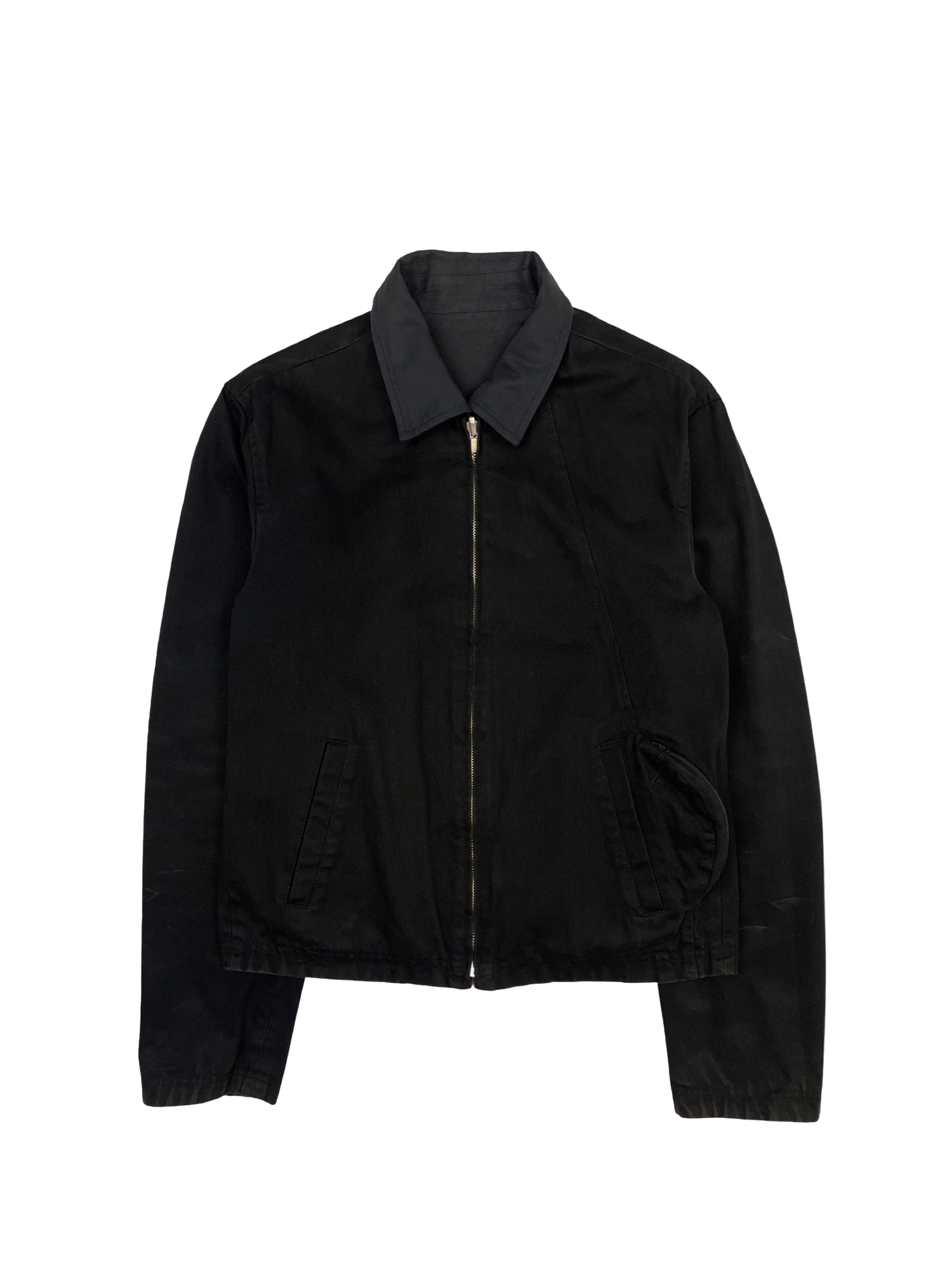 Reversible work jacket from Autumn 2004 collection titled “Anthropology of Solitude”. Signified by its unique 3-D pocket formation which is to be used as a CD holder, classic pointed collar, and front zip closure.