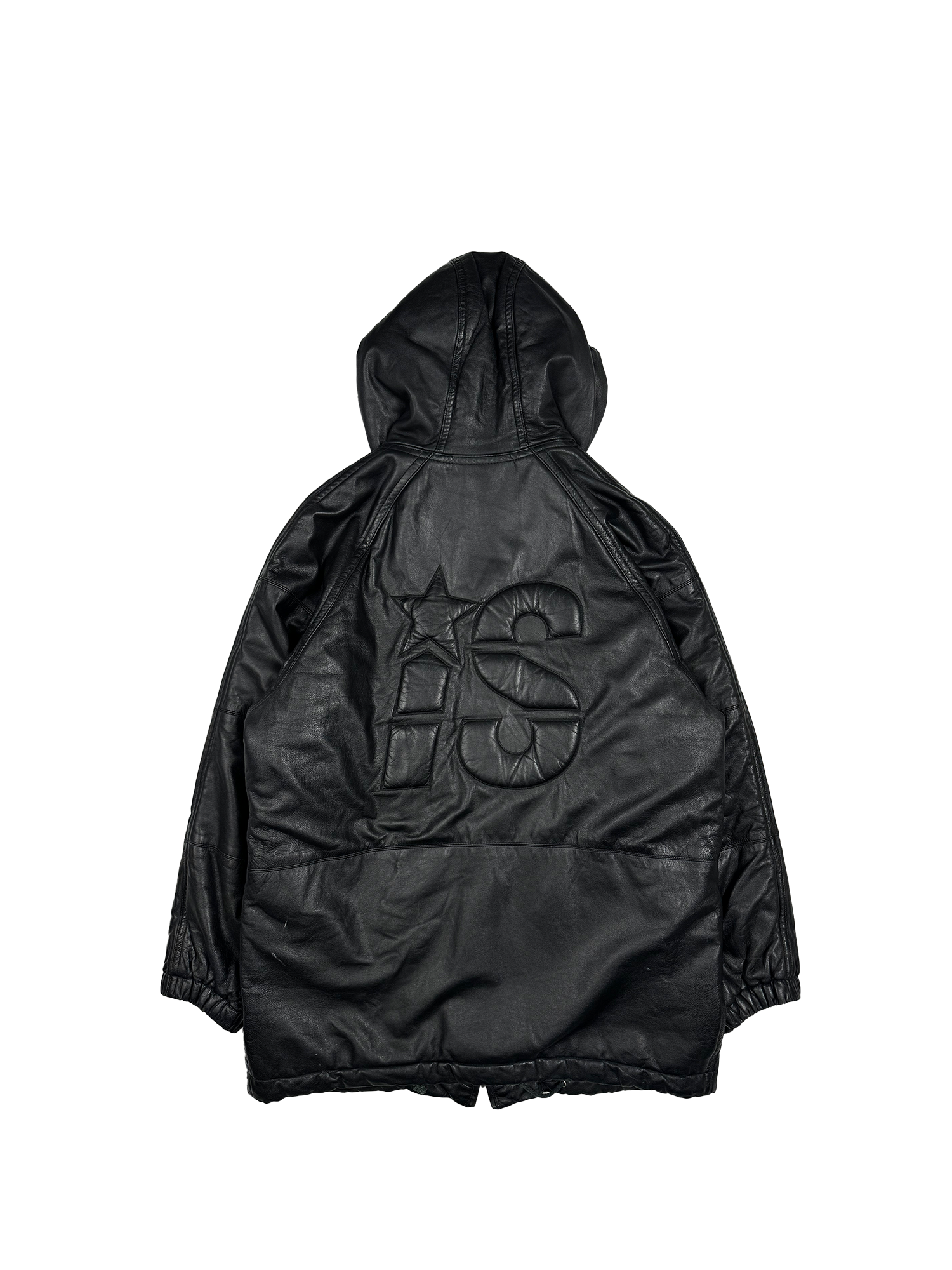Black sheepskin 1980's Sport Line padded logo leather jacket from Issey Miyake featuring a drawstring hood, a front zip fastening, long length raglan sleeves, elasticated cuffs, front zipped pockets, a drawstring hem, a padded logo on the back and padded symbols on the chest.