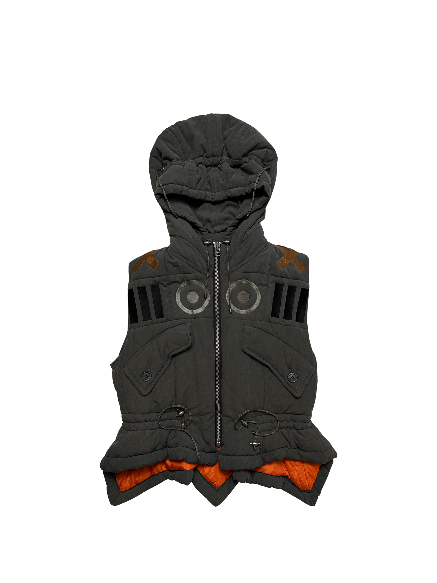 This vest from the Issey Miyake 1991 collection is distinguished by its abstract design complimented with a padded silhoutte. It features a diaphanous, off-white fabric, with a geometric pleated design. The finishing touches of a brim and zip-up closure give it a unique, modern look.