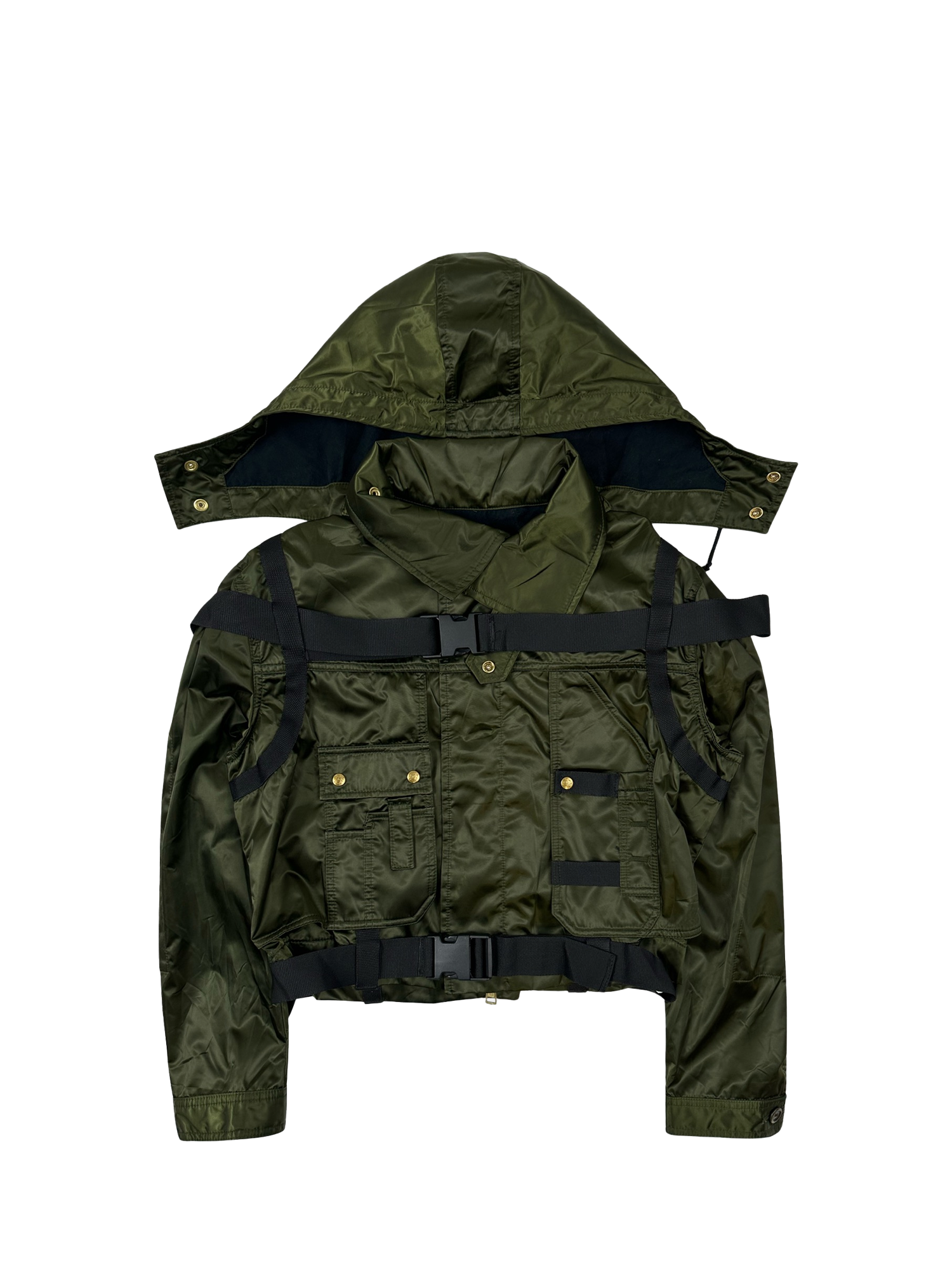 Unique piece of garment that features a hooded silhouette, long sleeves, and is crafted from a parachute-style fabric. The jacket is fastened with a two-way zip and includes two half-zip pockets, as well as drawstring waistband and a velcro closure at the neck.