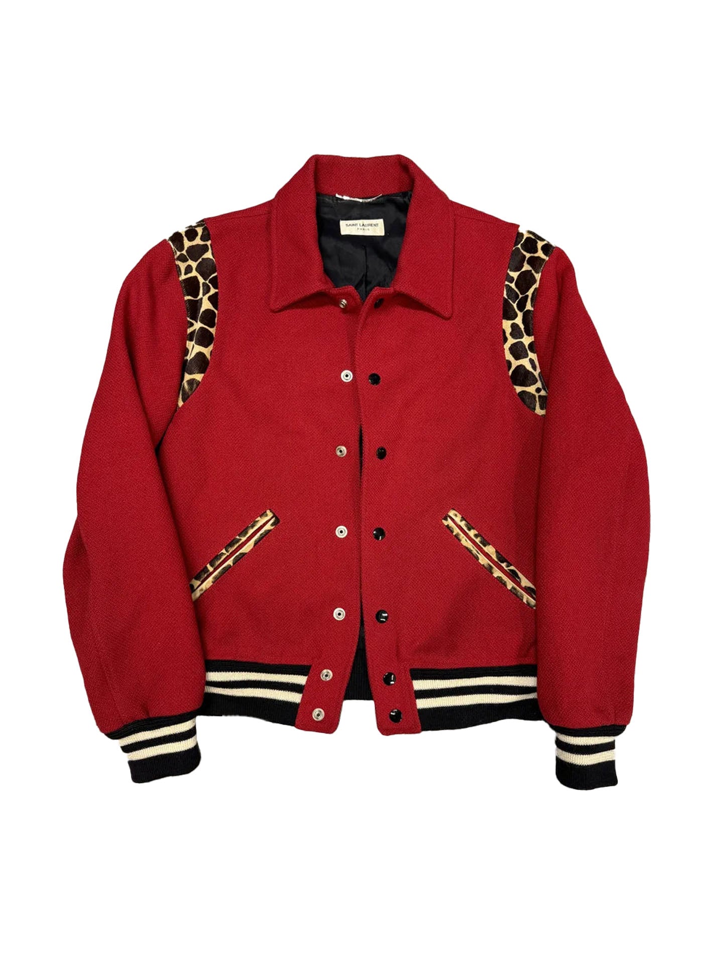 The SS2014 Saint Laurent Red Cheetah Pony Hair Varsity Teddy Jacket is a distinctive archive piece emblematic of the mason’s daring use of texture and bold prints. Crafted from luxurious pony hair with a striking red cheetah pattern, this jacket juxtaposes classic varsity silhouette with high-fashion edge. This design features ribbed trims and snap-button closures, enhancing its vintage varsity authenticity.