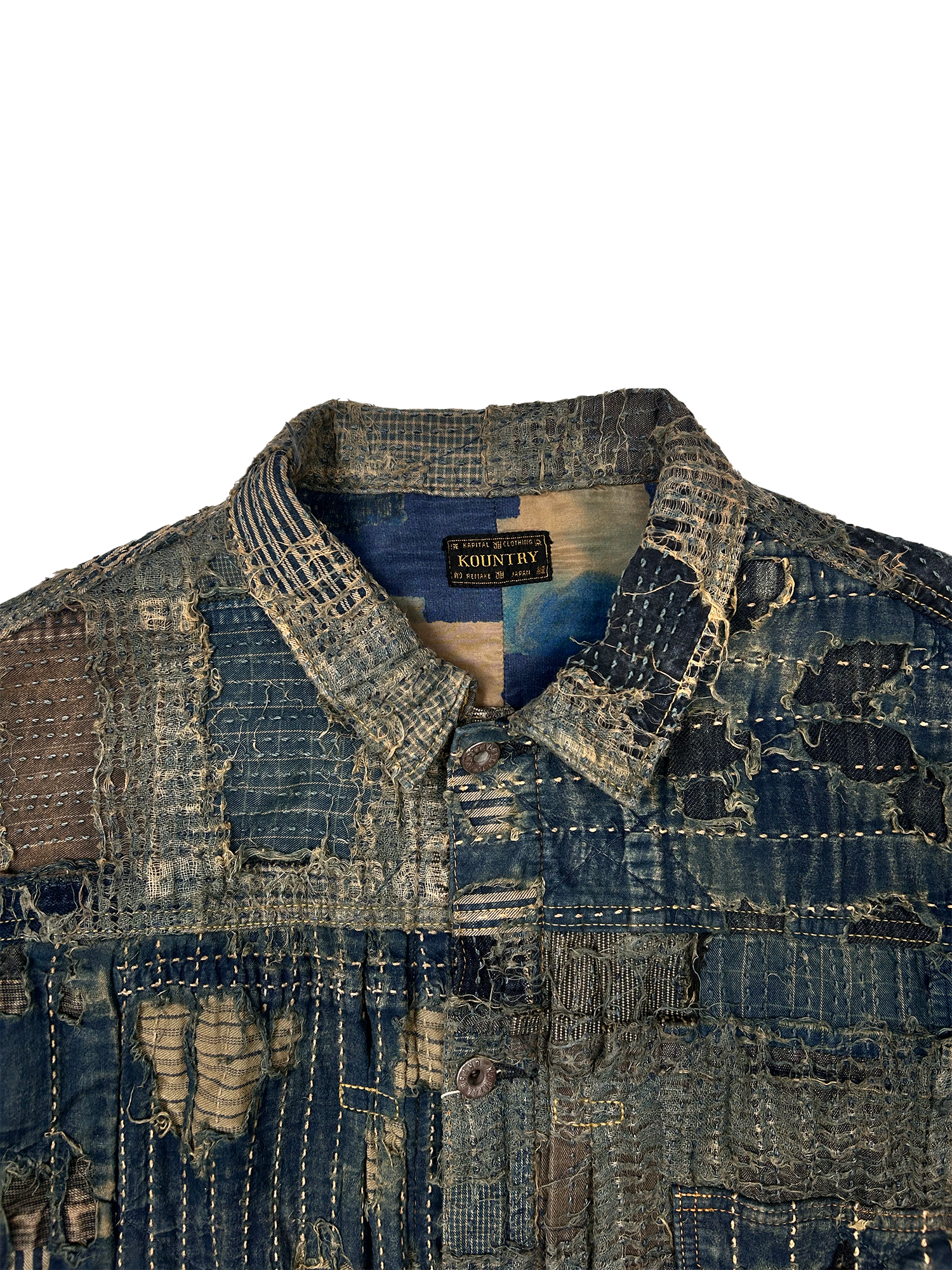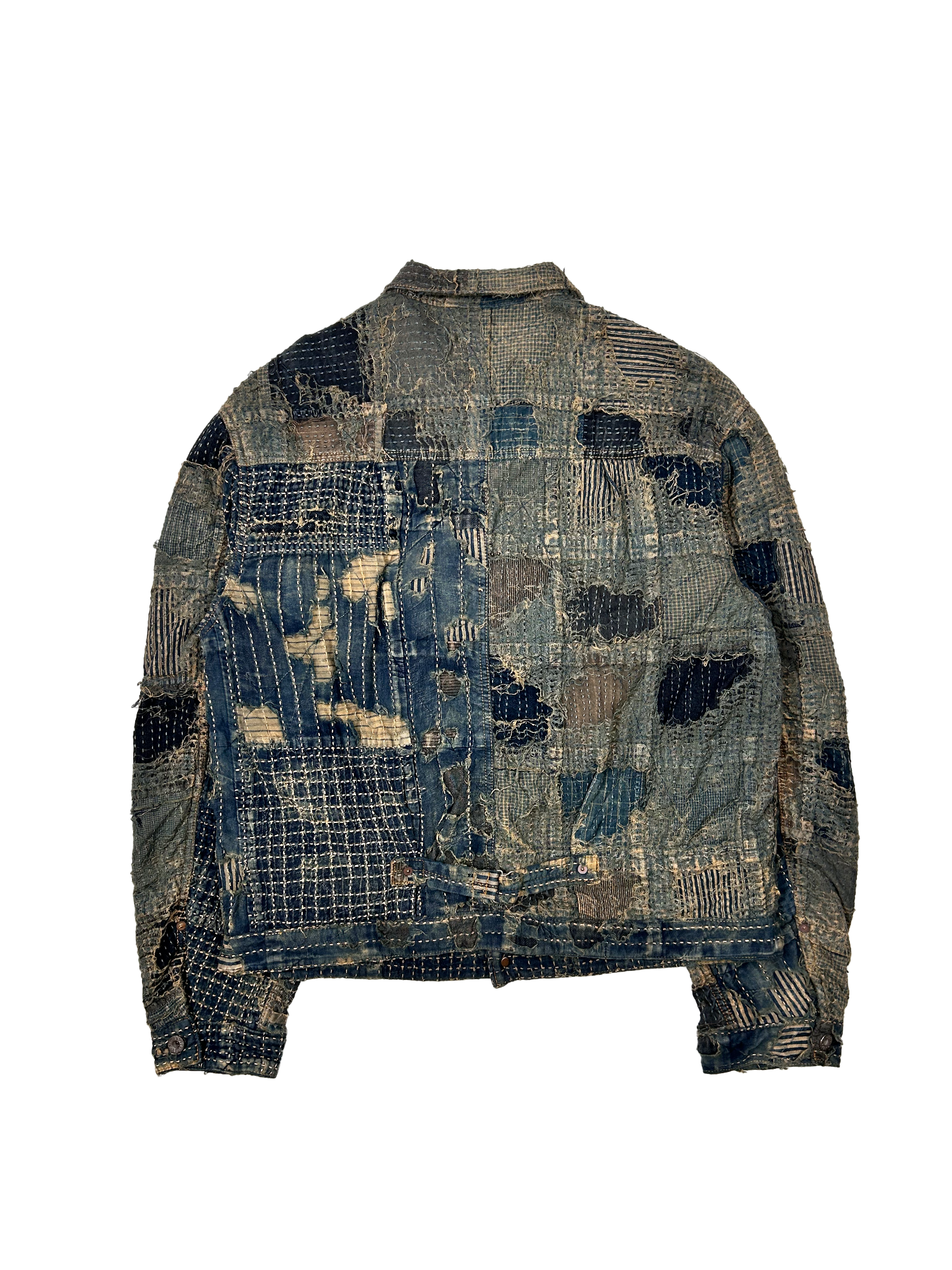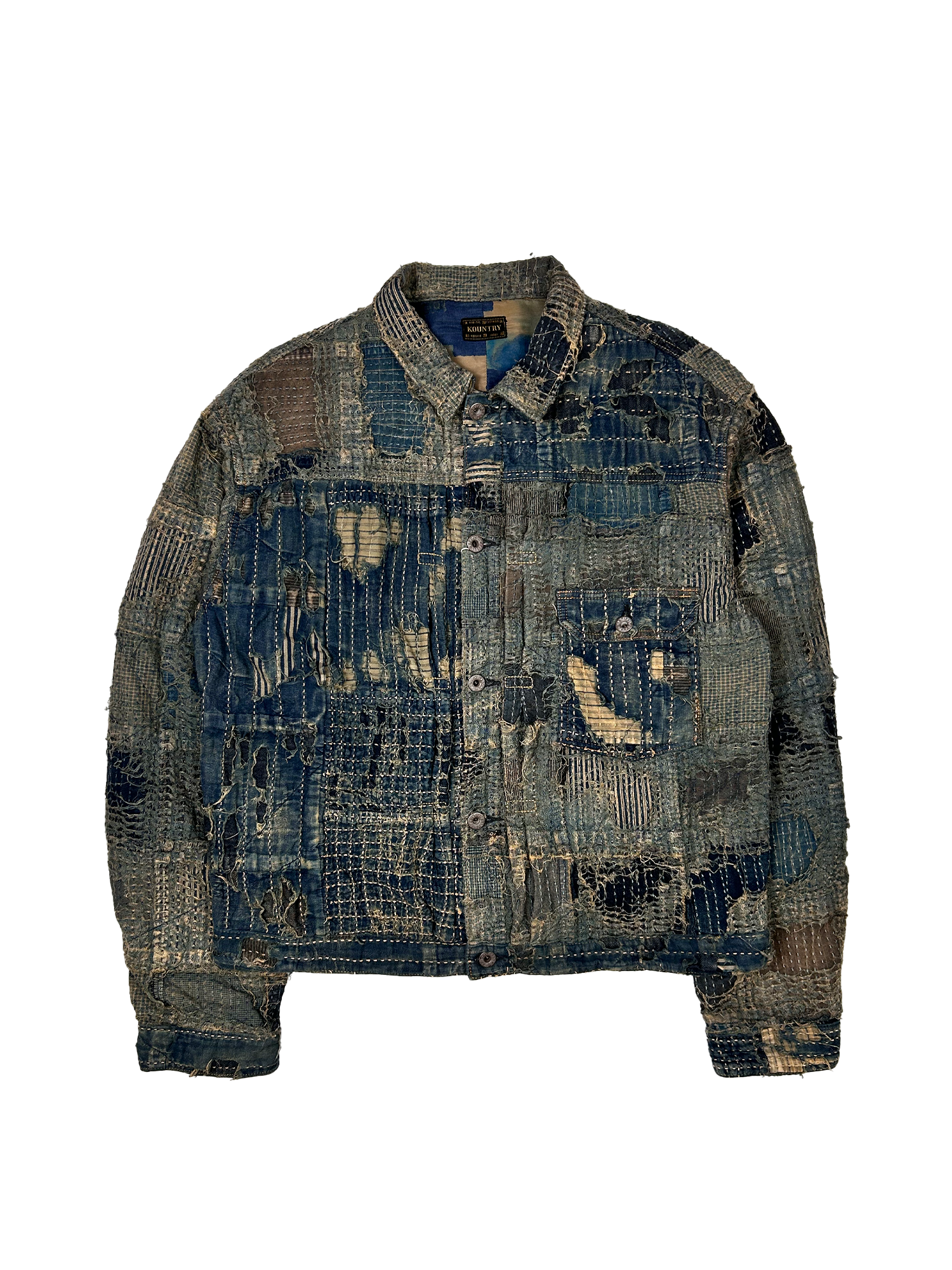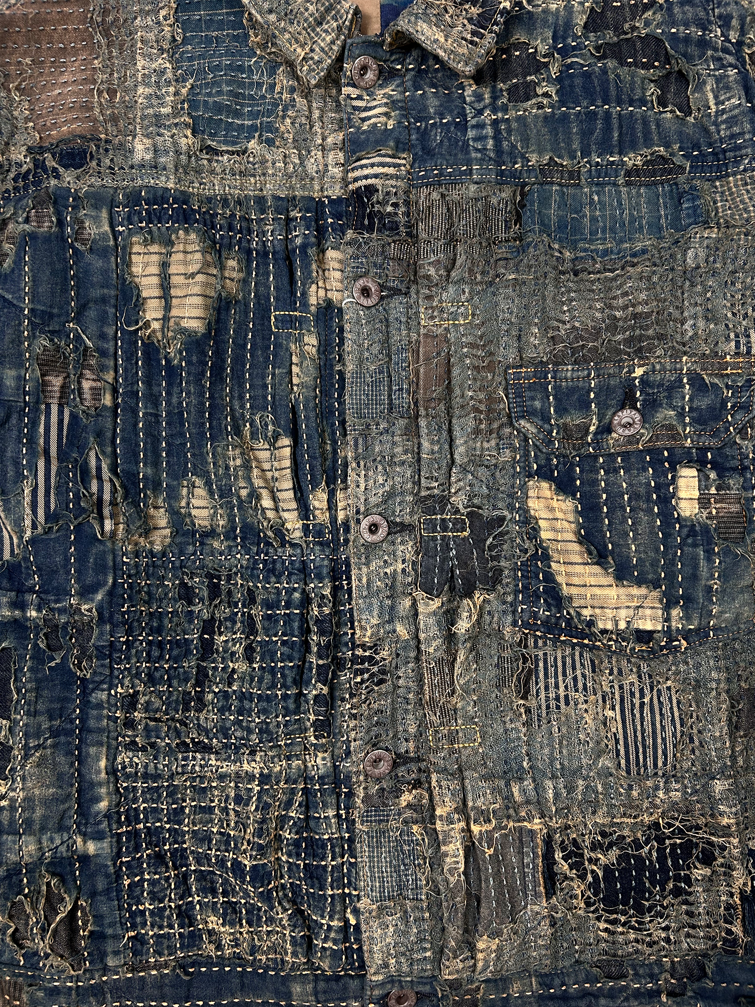 This unique denim jacket featuring distressed and repaired fabric boasts a boxy, cropped fit with a pleated front, ensuring both style and comfort. Fully lined for added quality, this garment showcases intricate Sashiko stitching, reflecting traditional Japanese craftsmanship. Made in Japan from 100% cotton.