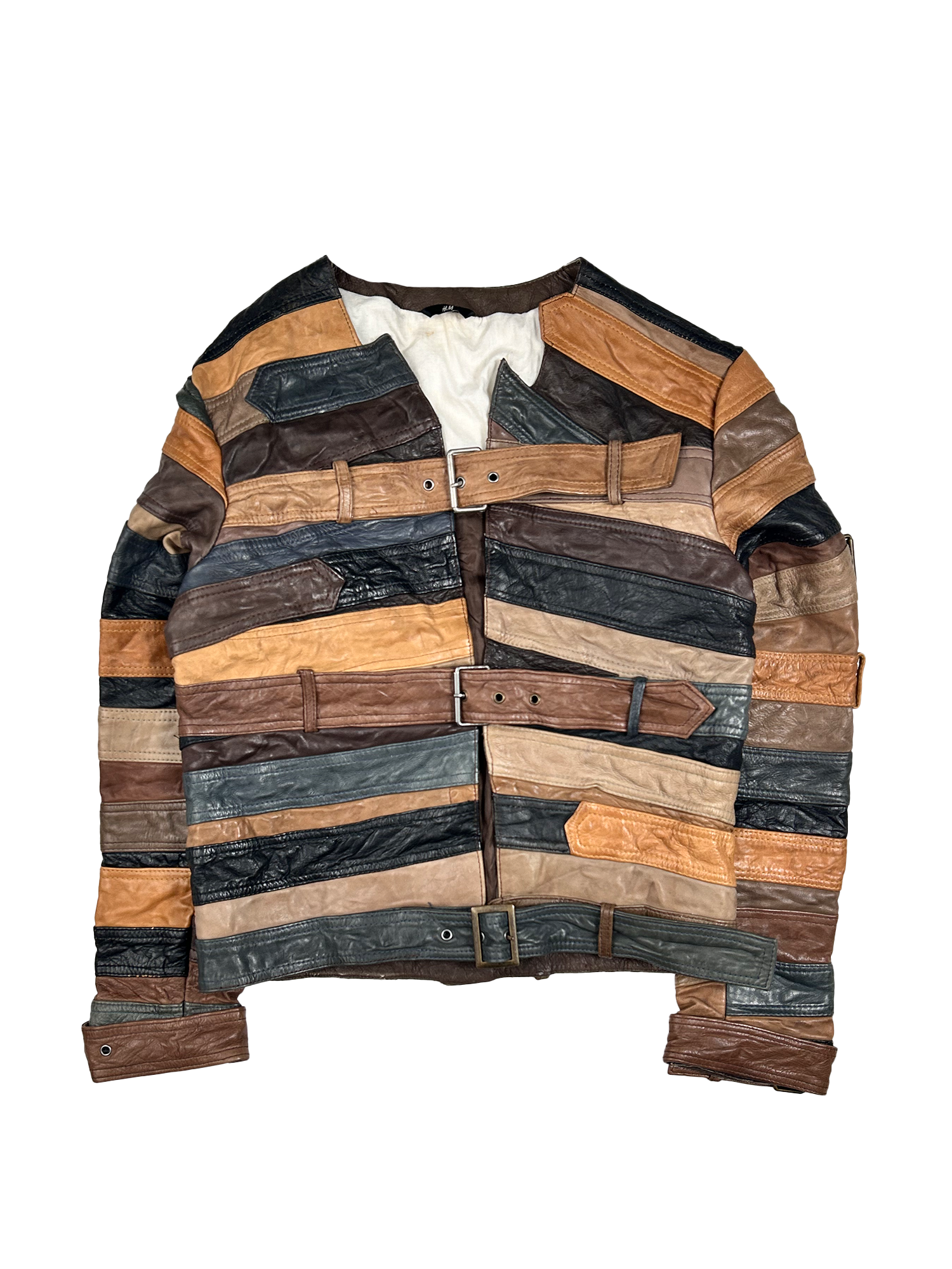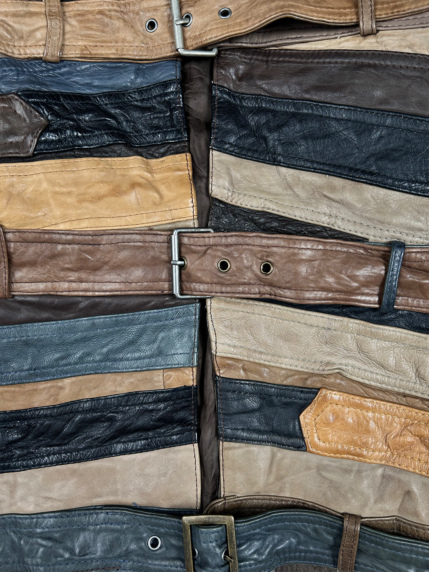 This jacket is crafted from a series of leather belts, intricately sewn together to form a torso and sleeves. The design showcases a striking silhouette, with functional belt straps strategically placed at the front, back, and sleeves, offering versatile button and style options. The overall look features a boxy fit