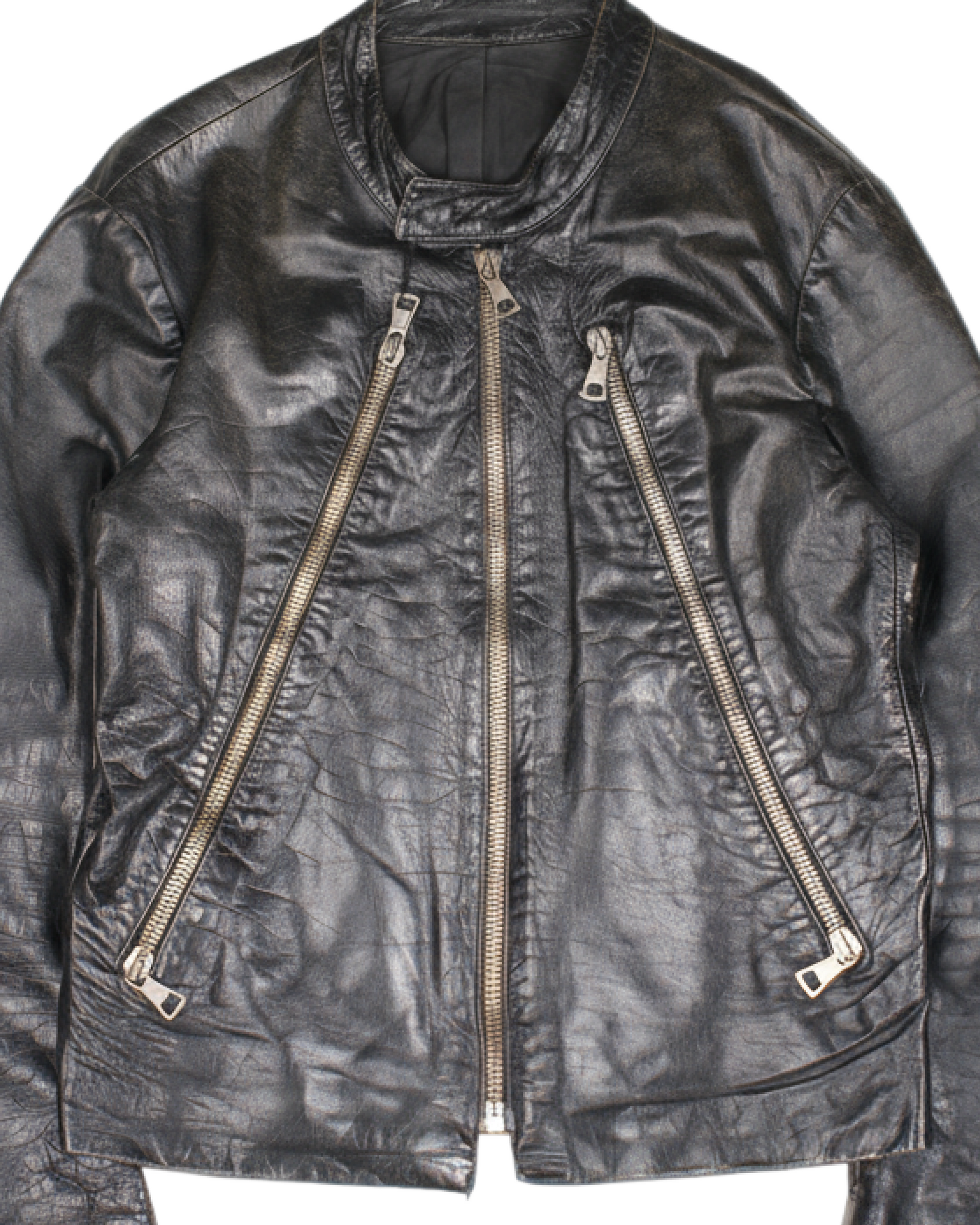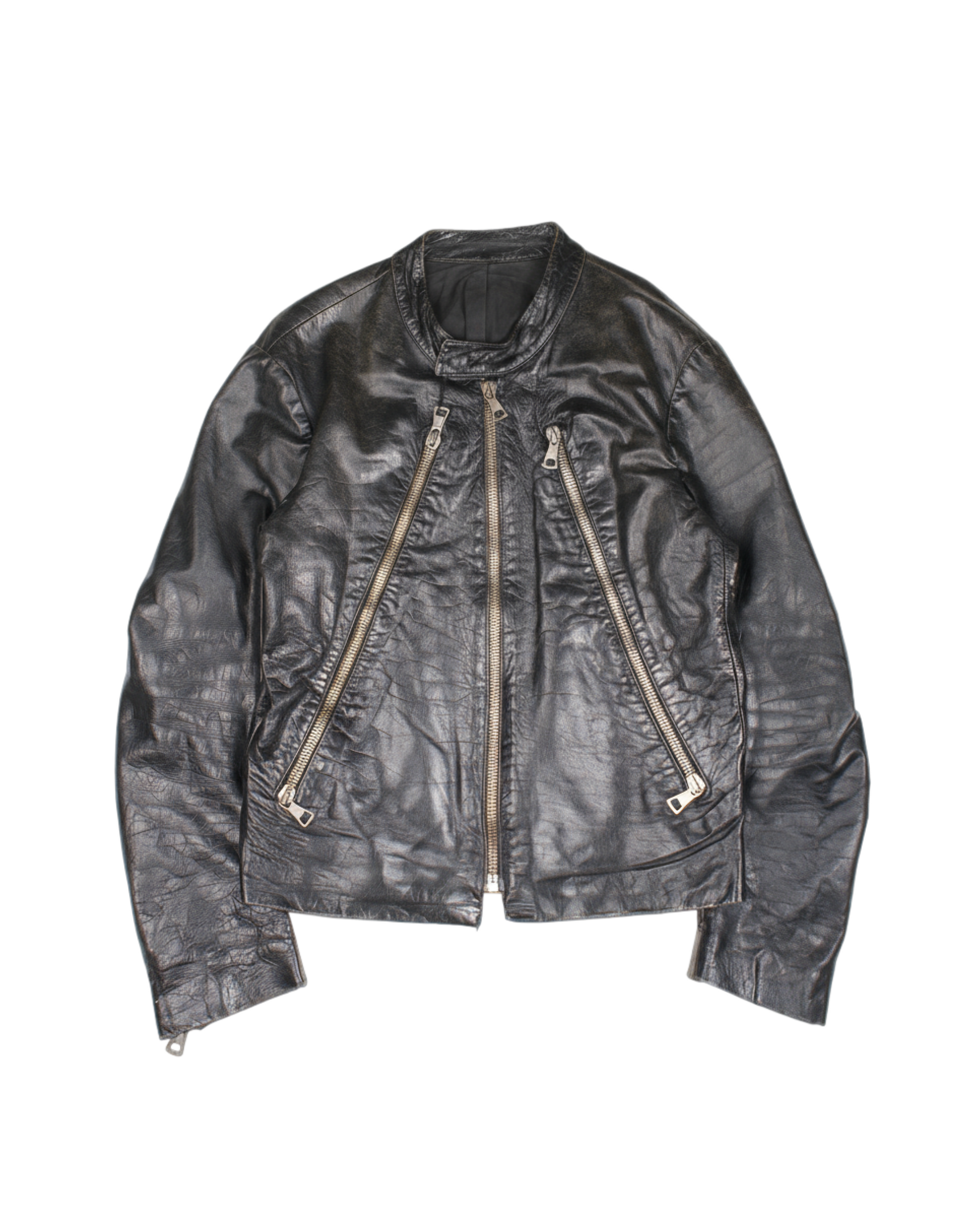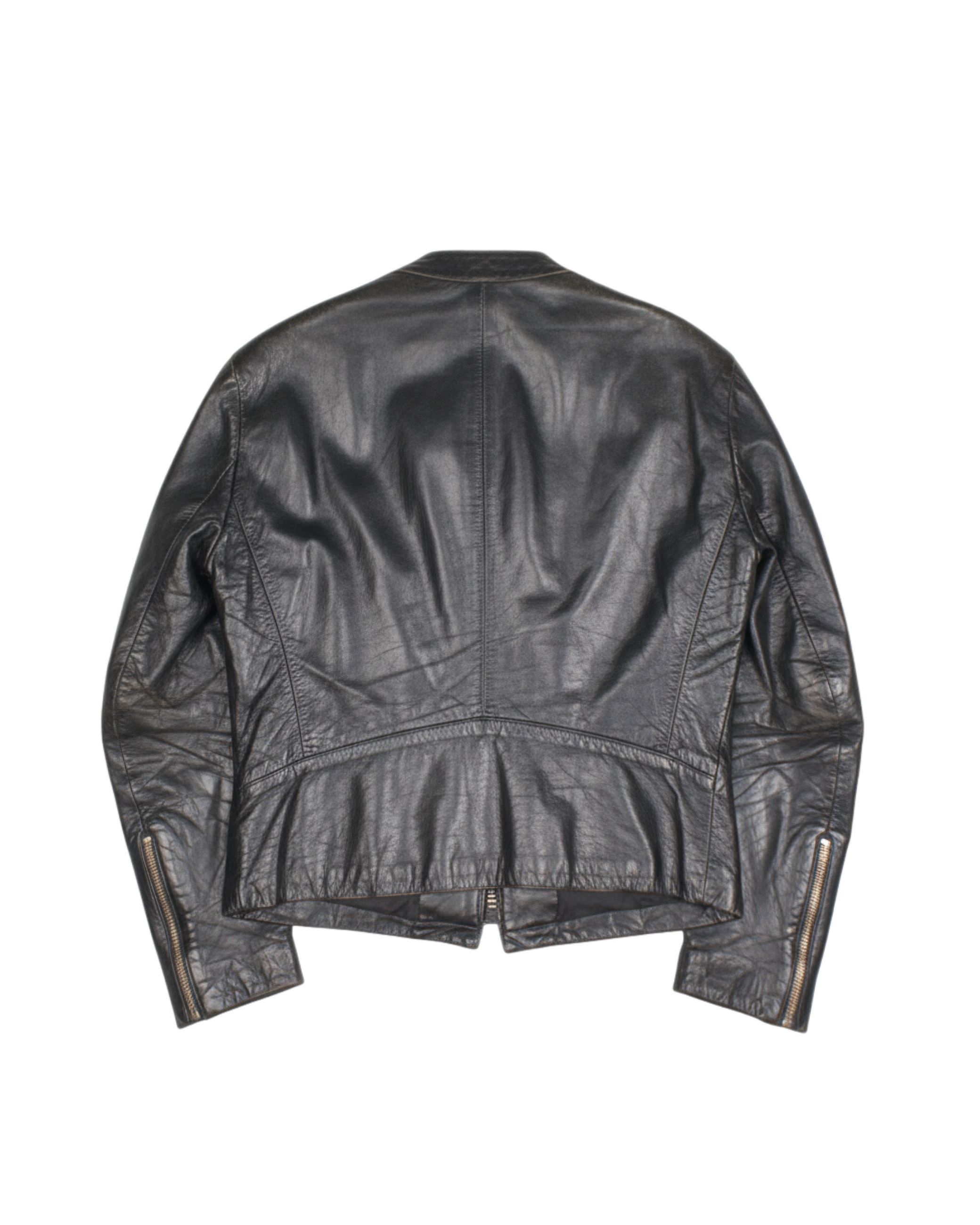 The Maison Margiela 5-Zip Biker Leather Jacket exemplifies the maison’s avant-garde approach to classic silhouettes. Crafted from supple navy leather, this archive piece features a distinctive five-zip fastening detail that redefines traditional biker aesthetics with a contemporary edge. The structured cut is complemented by angular seams and a slightly cropped silhouette, hallmark traits of Margiela’s conceptual design language.