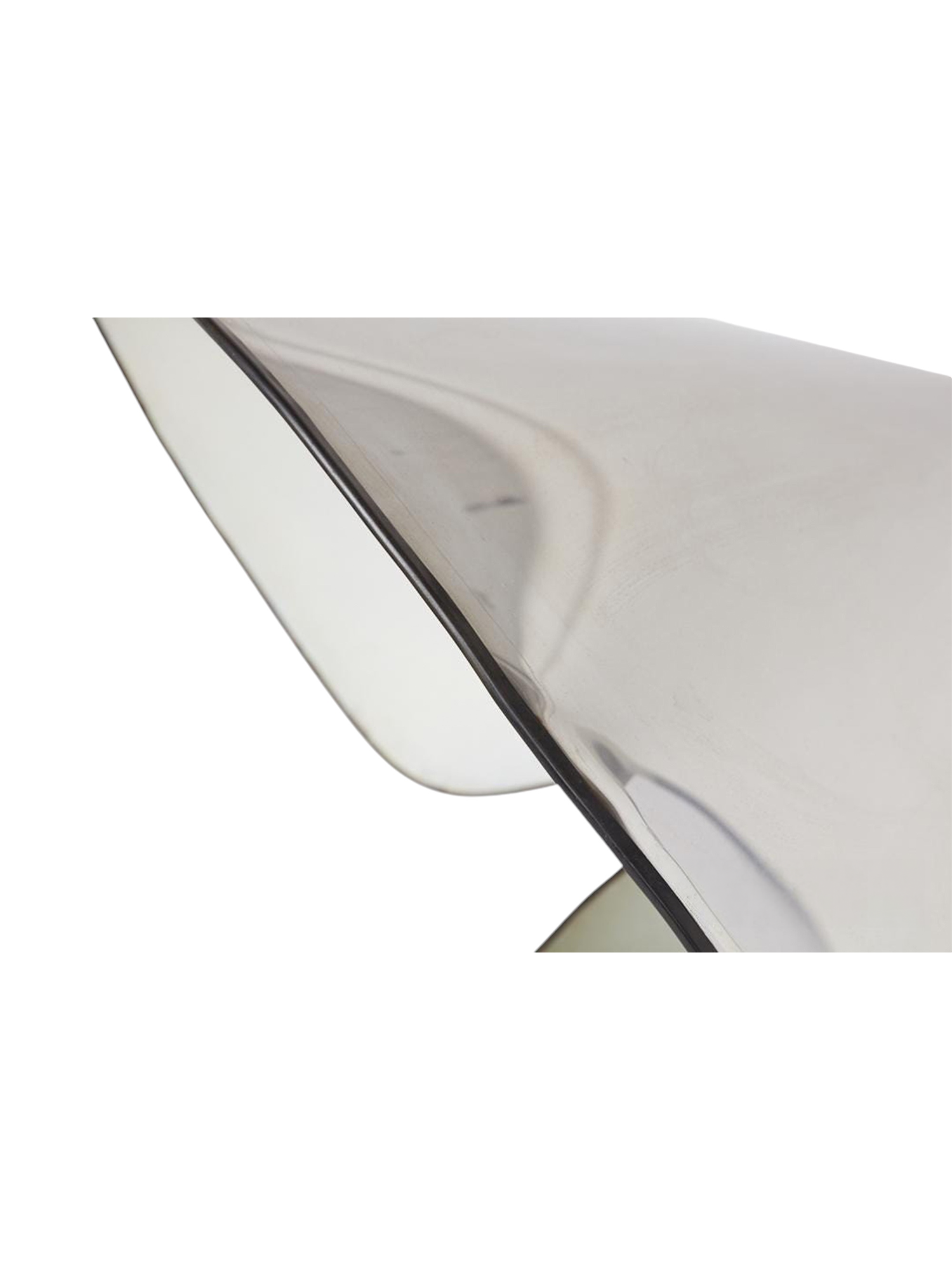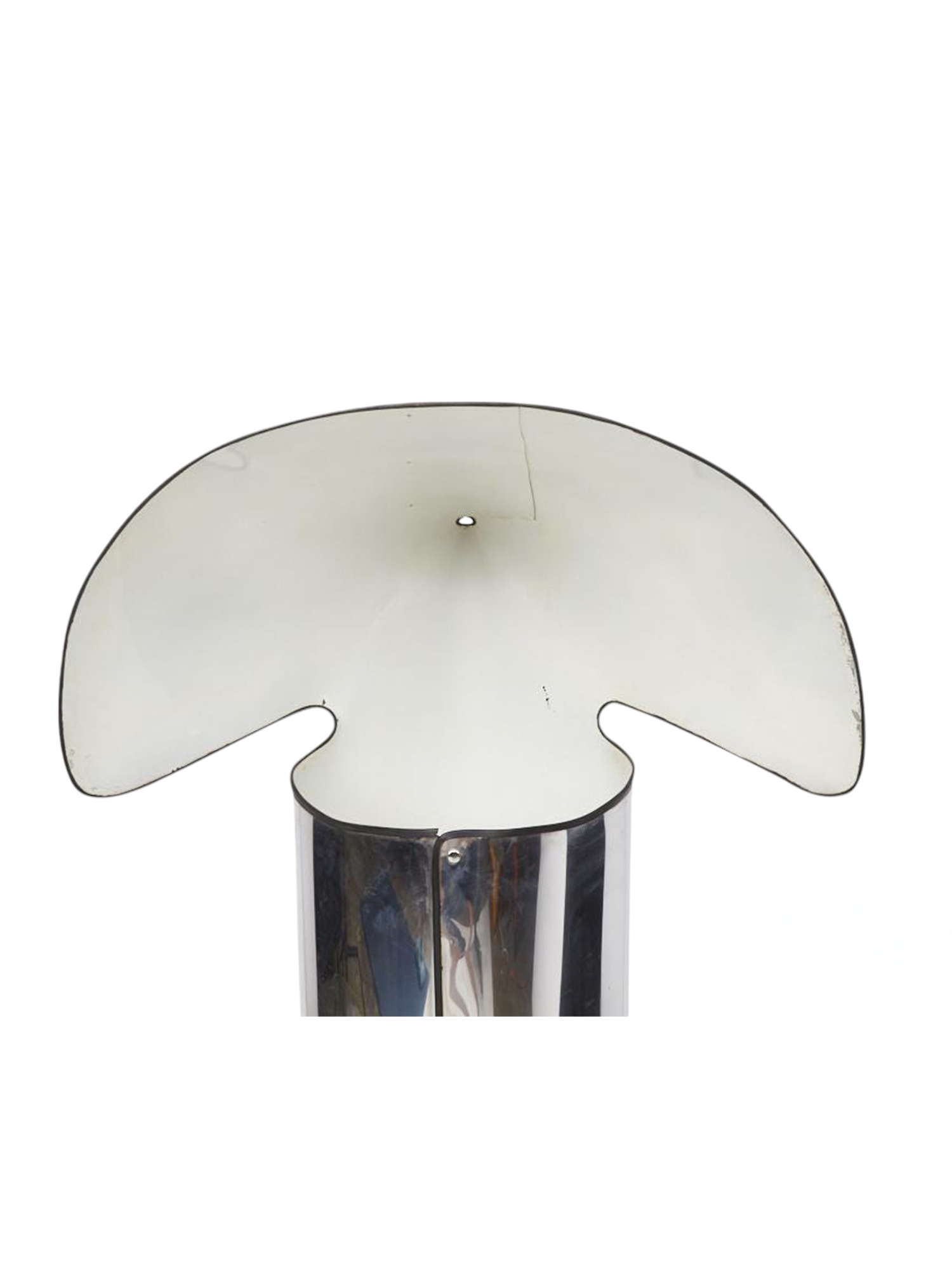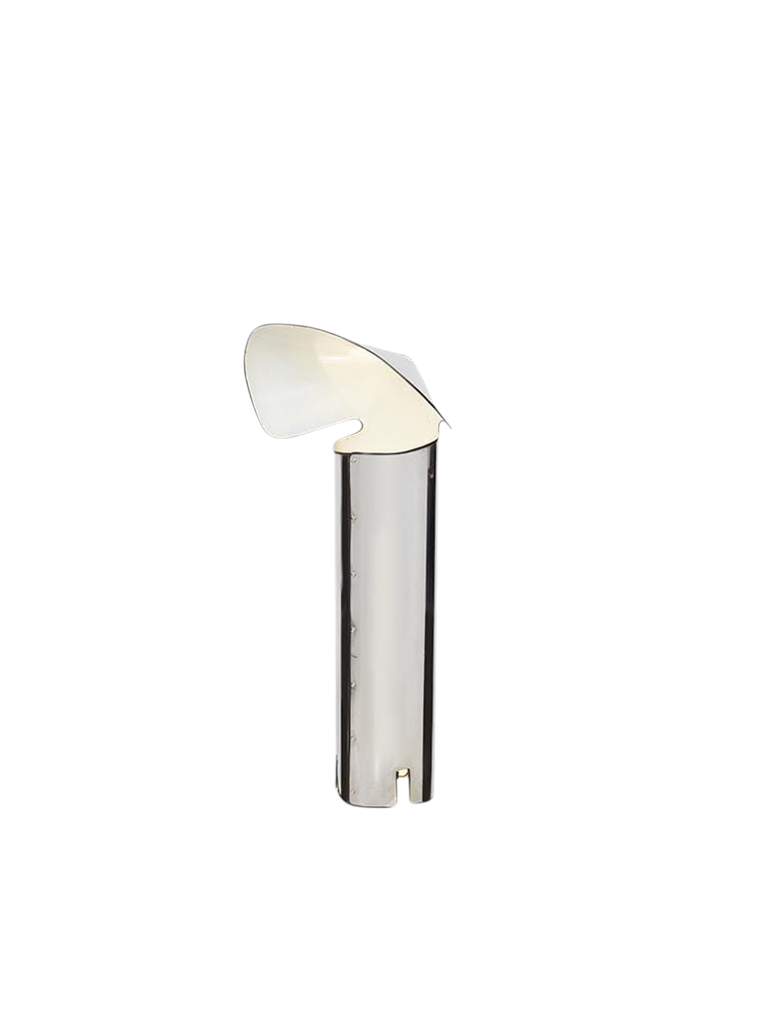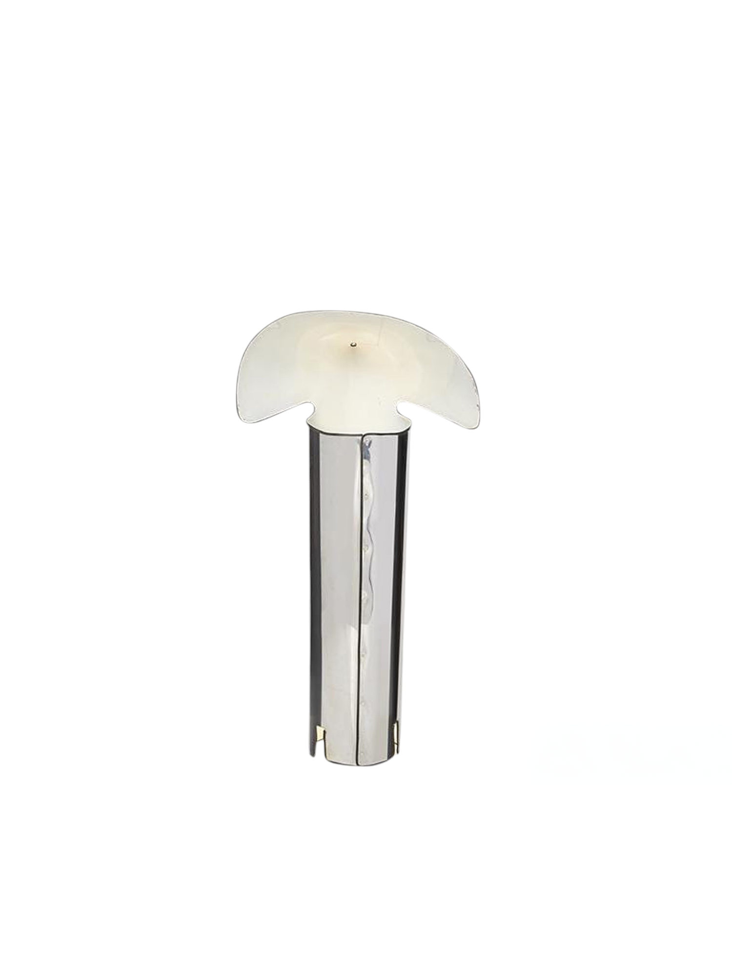 A folded and rolled sheet of stainless steel creates this iconic floor lamp, allowing light to be guided and reflected, originating from the concealed light source at the base. This origami-like structure is modeled after a nun’s headdress or wimple.
