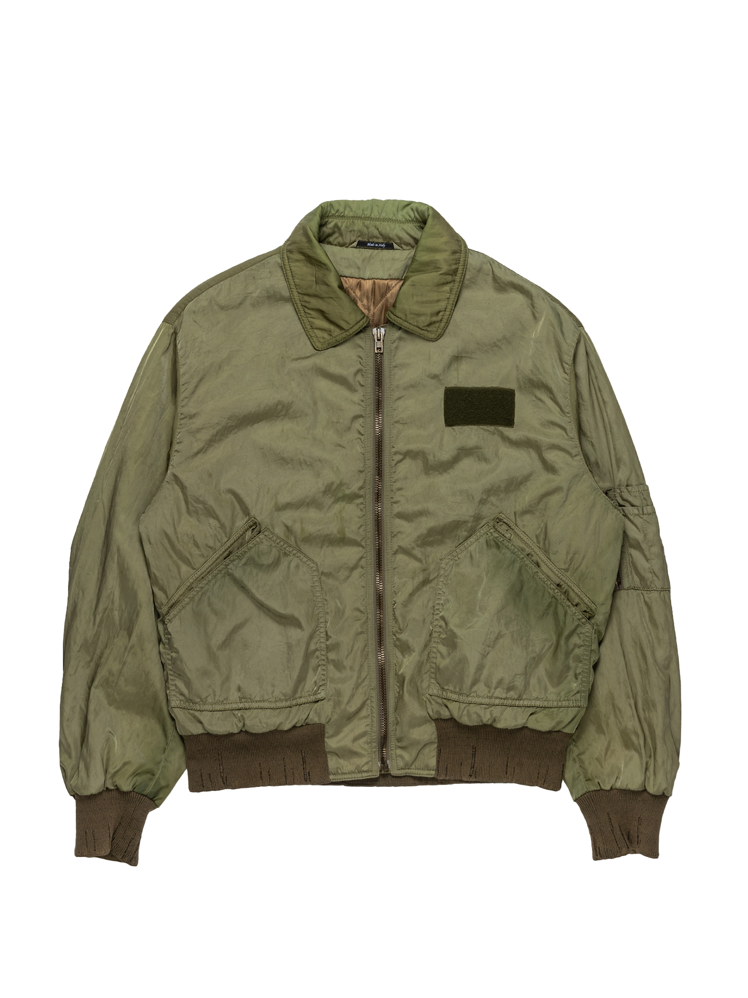 From the Spring 2013 collection, a washed bomber jacket constructed in olive nylon, with distressing treatment to create a unique vintage effect. Knit waistband and cuffs with quilted satin lining. Two front cargo pockets and velcro patch to resemble a military flight jacket.