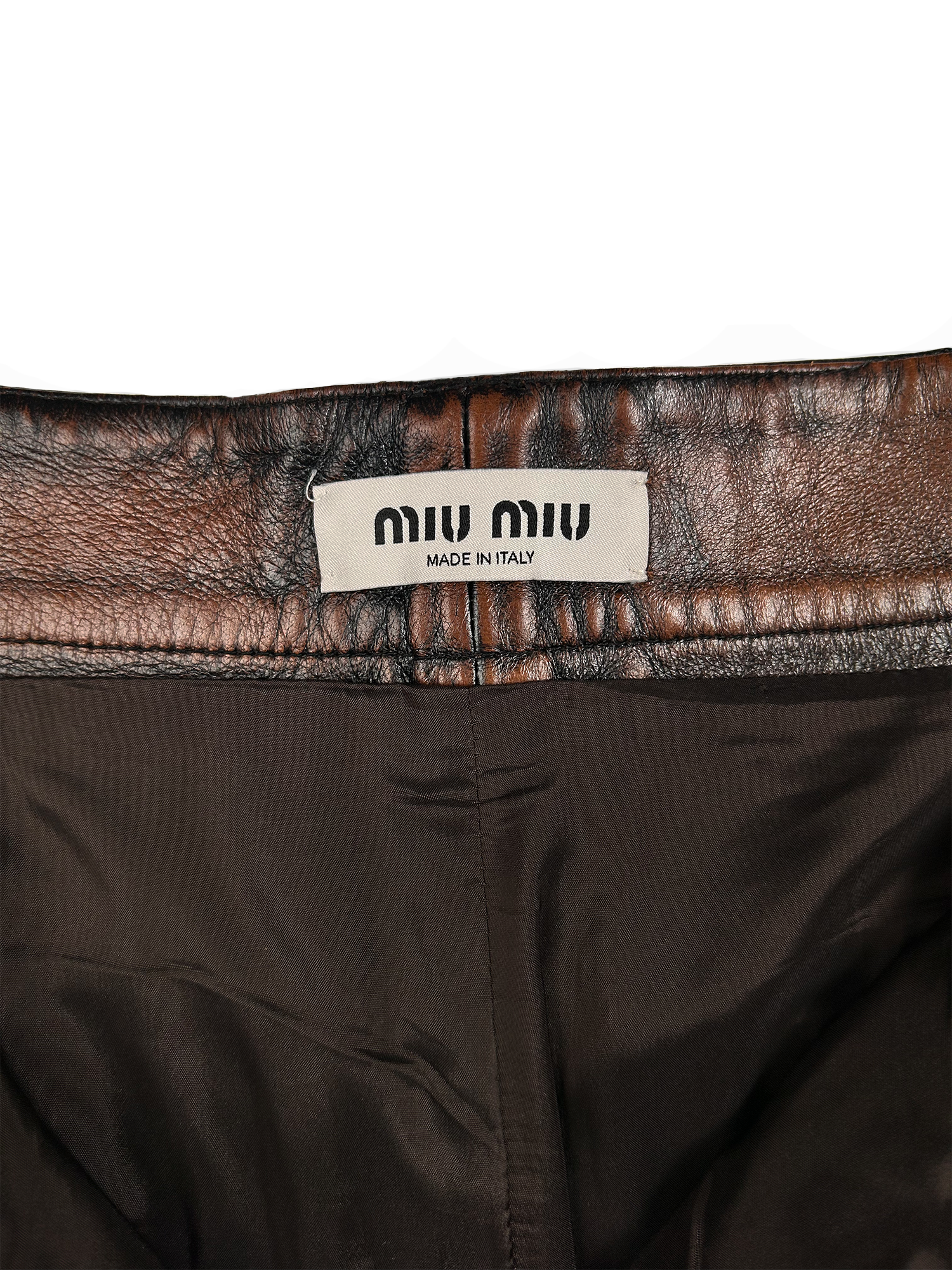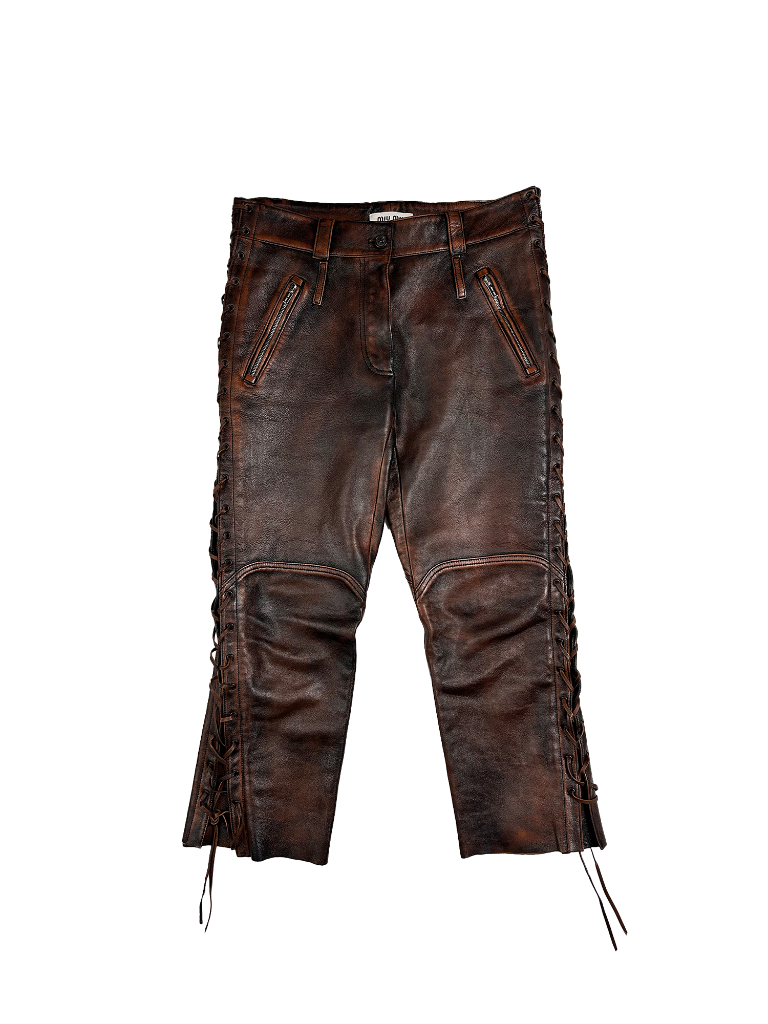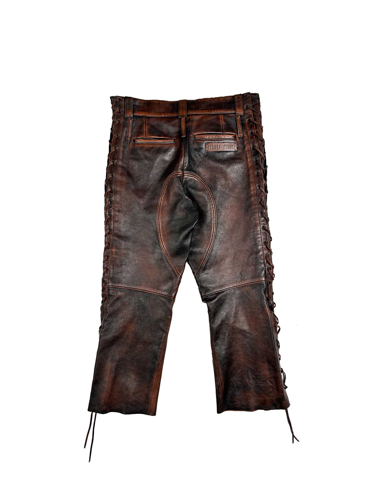 One of the highlights from Miu Miu FW2022 runway. The leather lace-up pants feature two sets of belt loops and an embossed logo for a branded detail, while laces on the side add a unique and versatile flare.