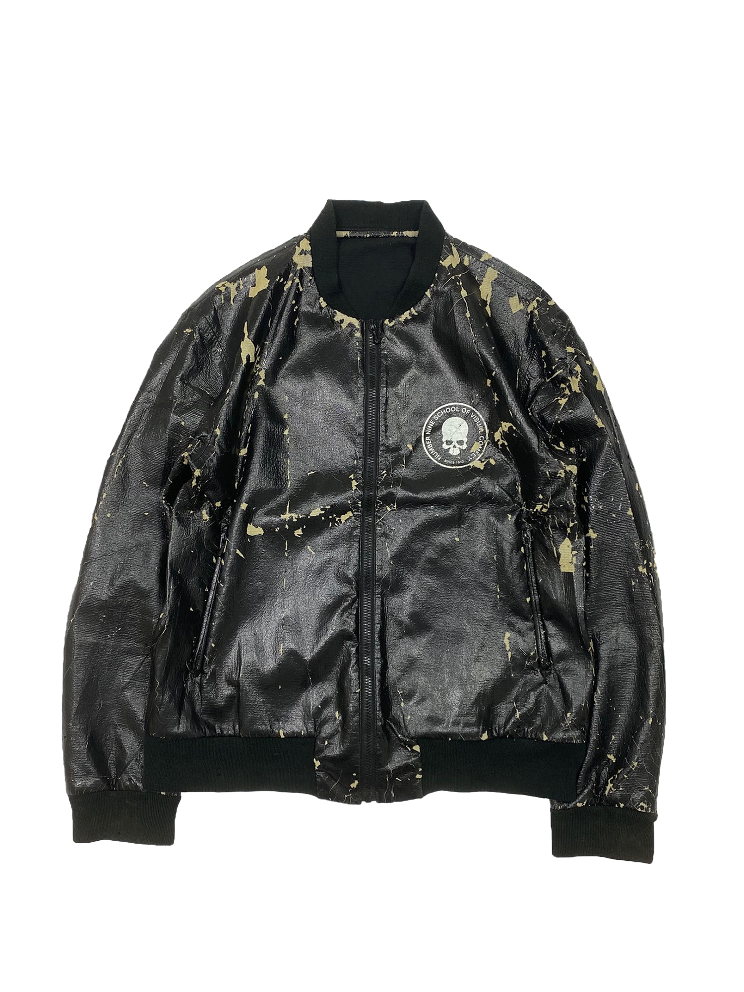 The exterior of this jacket is painted in a glossy dry paint, with the intention of peeling off through wear. Through deterioration, the tan underlying weave of the jacket becomes exposed. Features emblematic school of visual comedy logo.