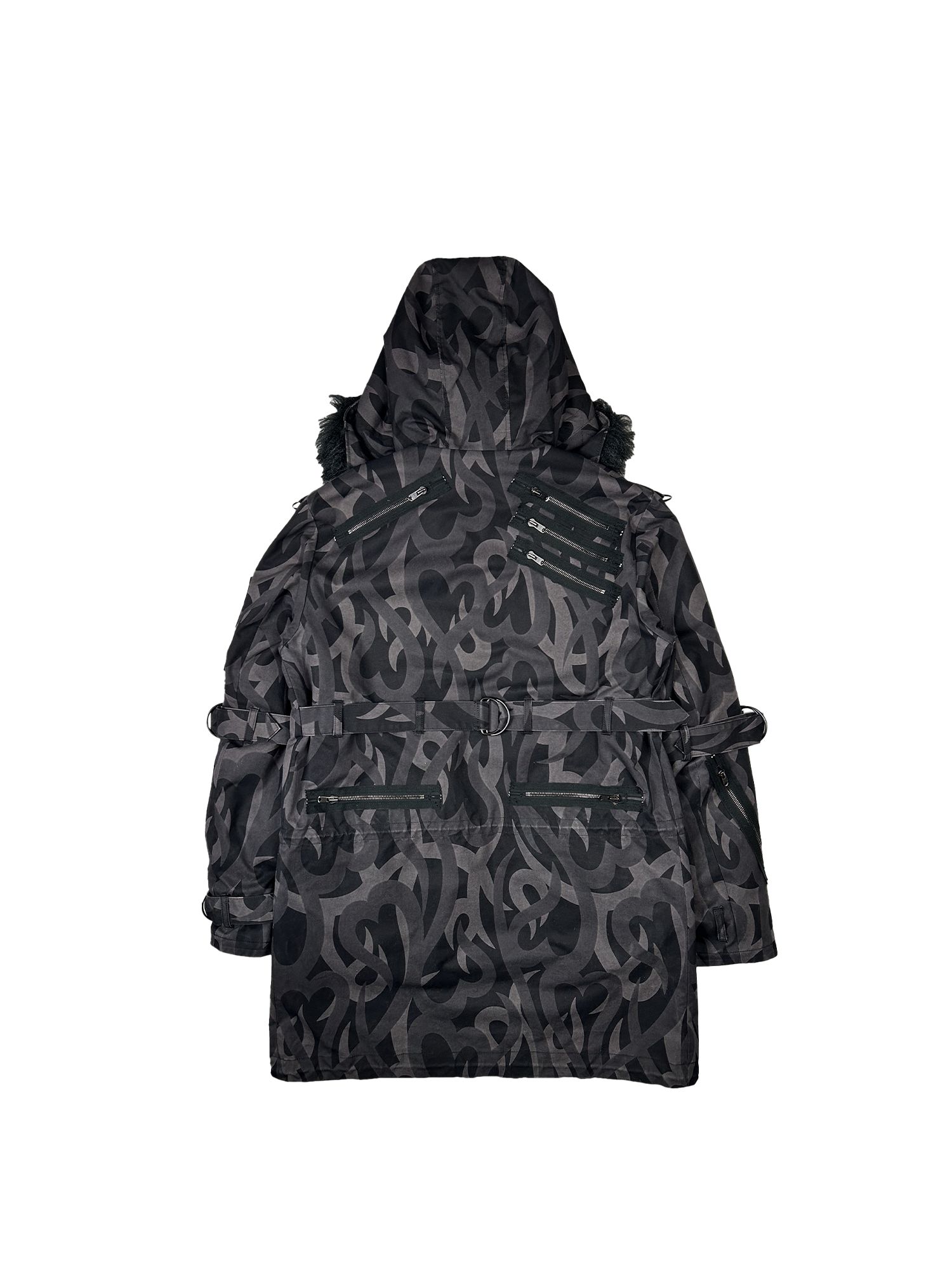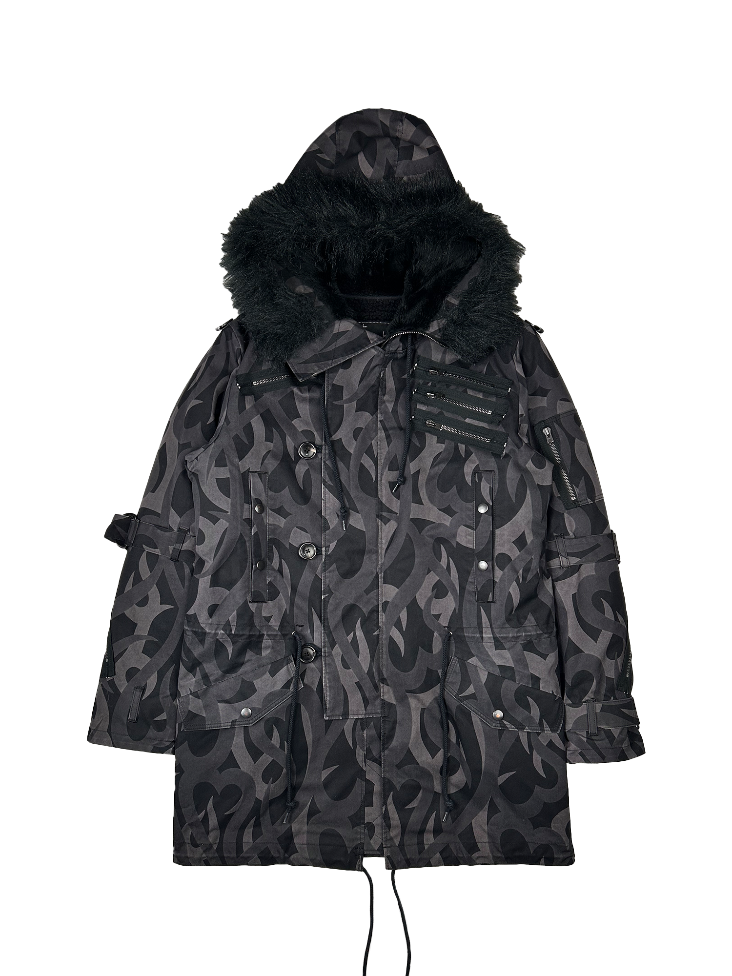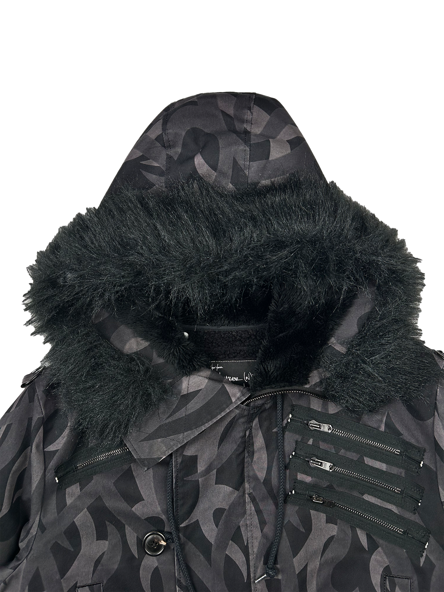This parka features a black and gray tribal heart camouflage pattern, crafted from thick cotton canvas. Filled with down feathers for warmth, it showcases exposed Riri zippers for a bondage look.