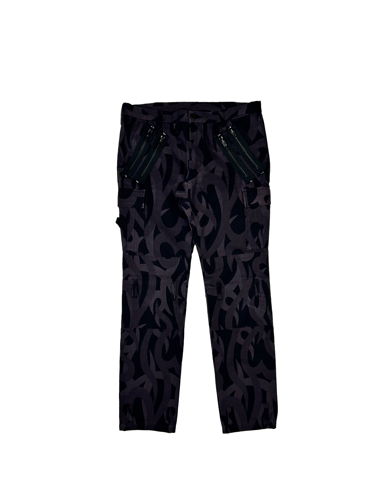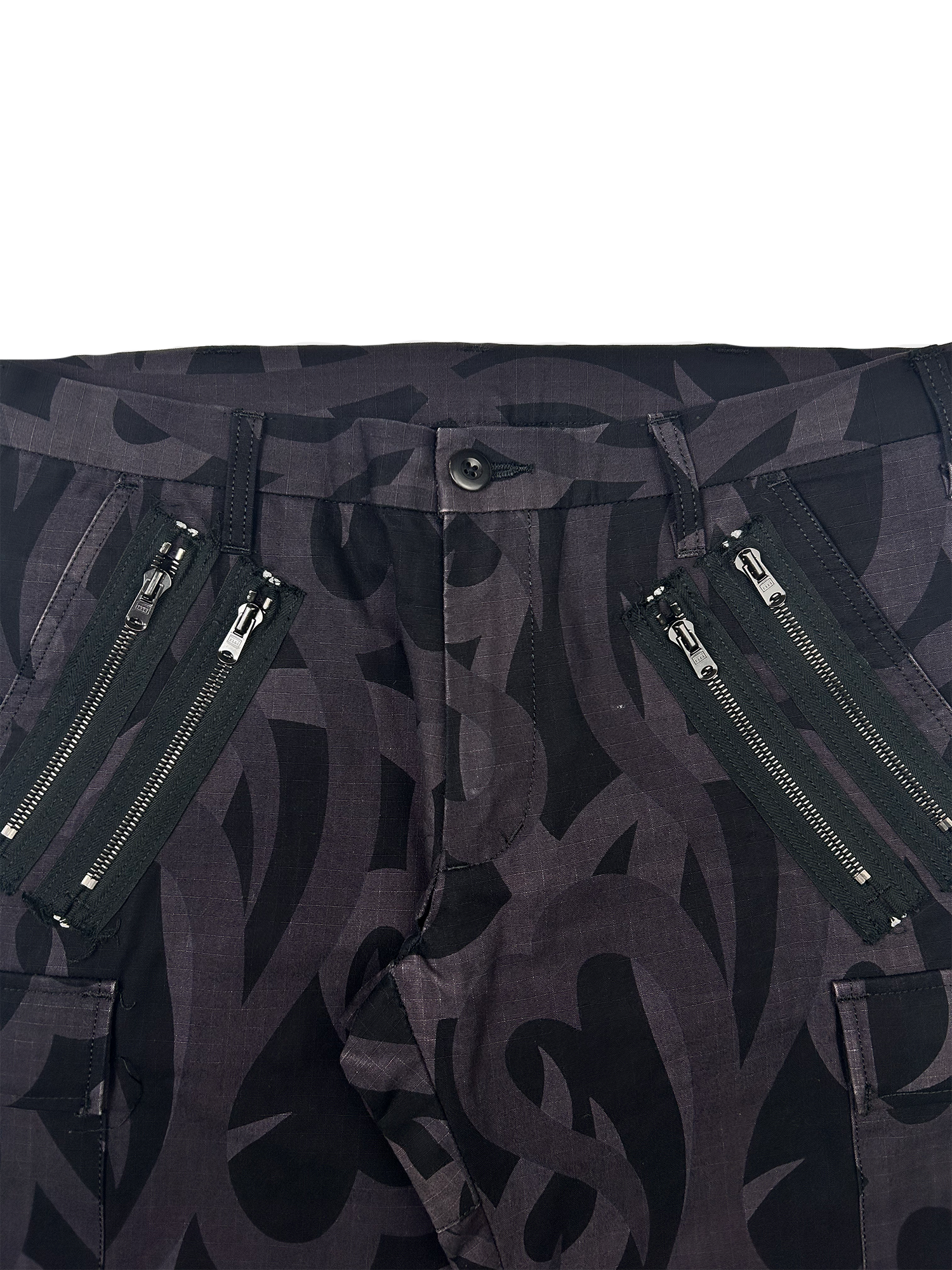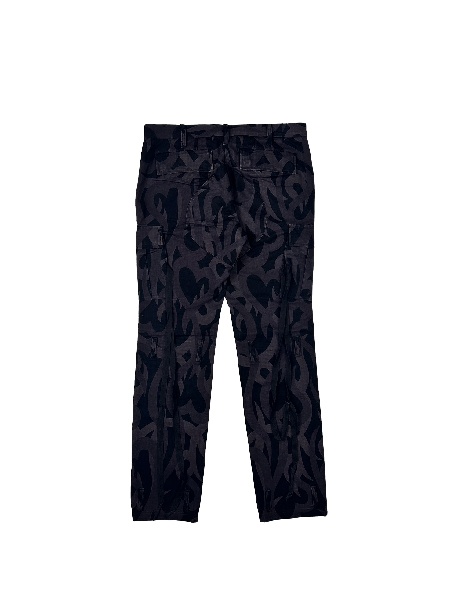 These cotton pants showcase N(N)'s unique tribal heart camouflage pattern in monochrome print all over. The 4-pocket design includes black Riri zippers on the legs and pockets for added detail.