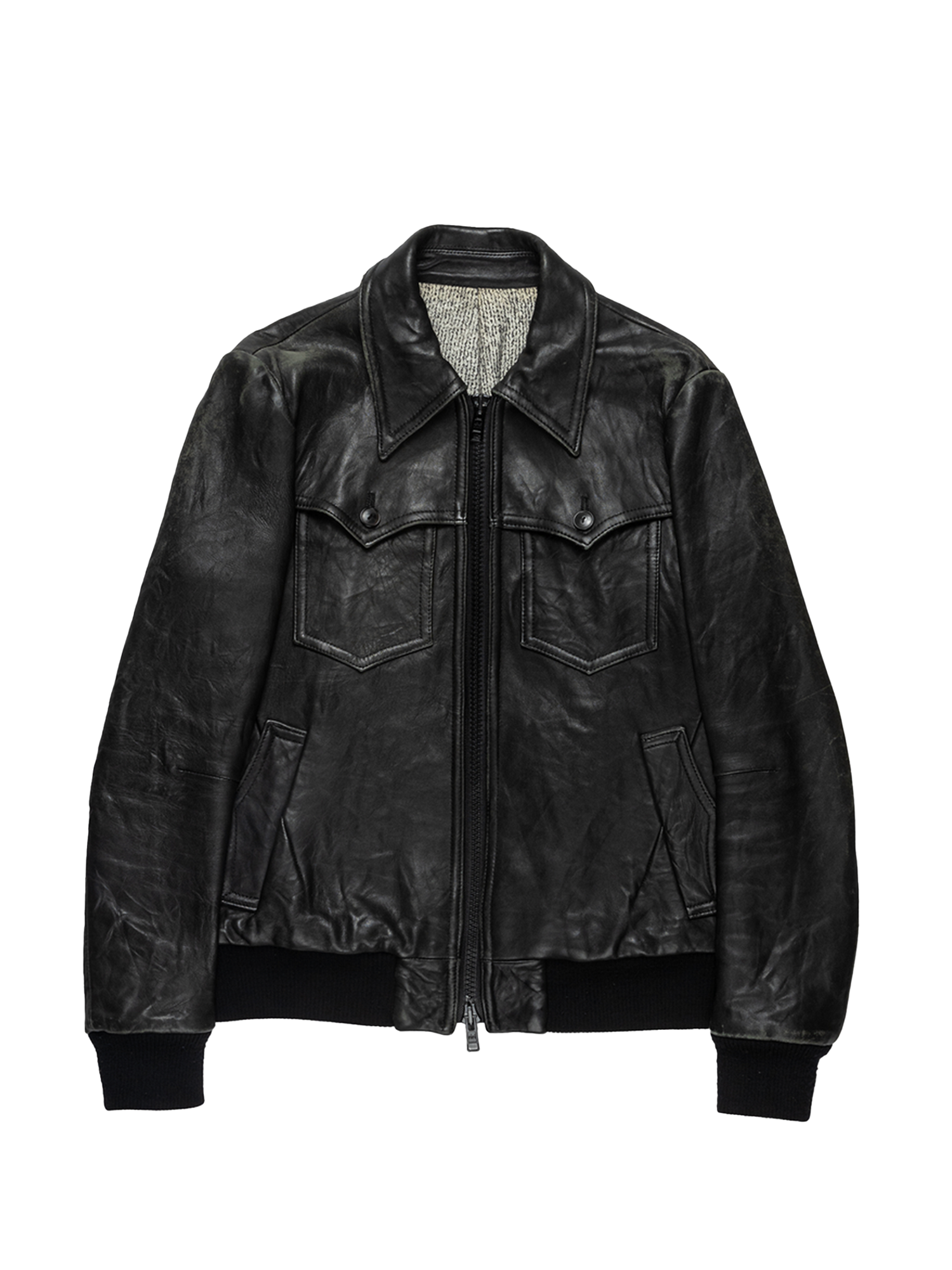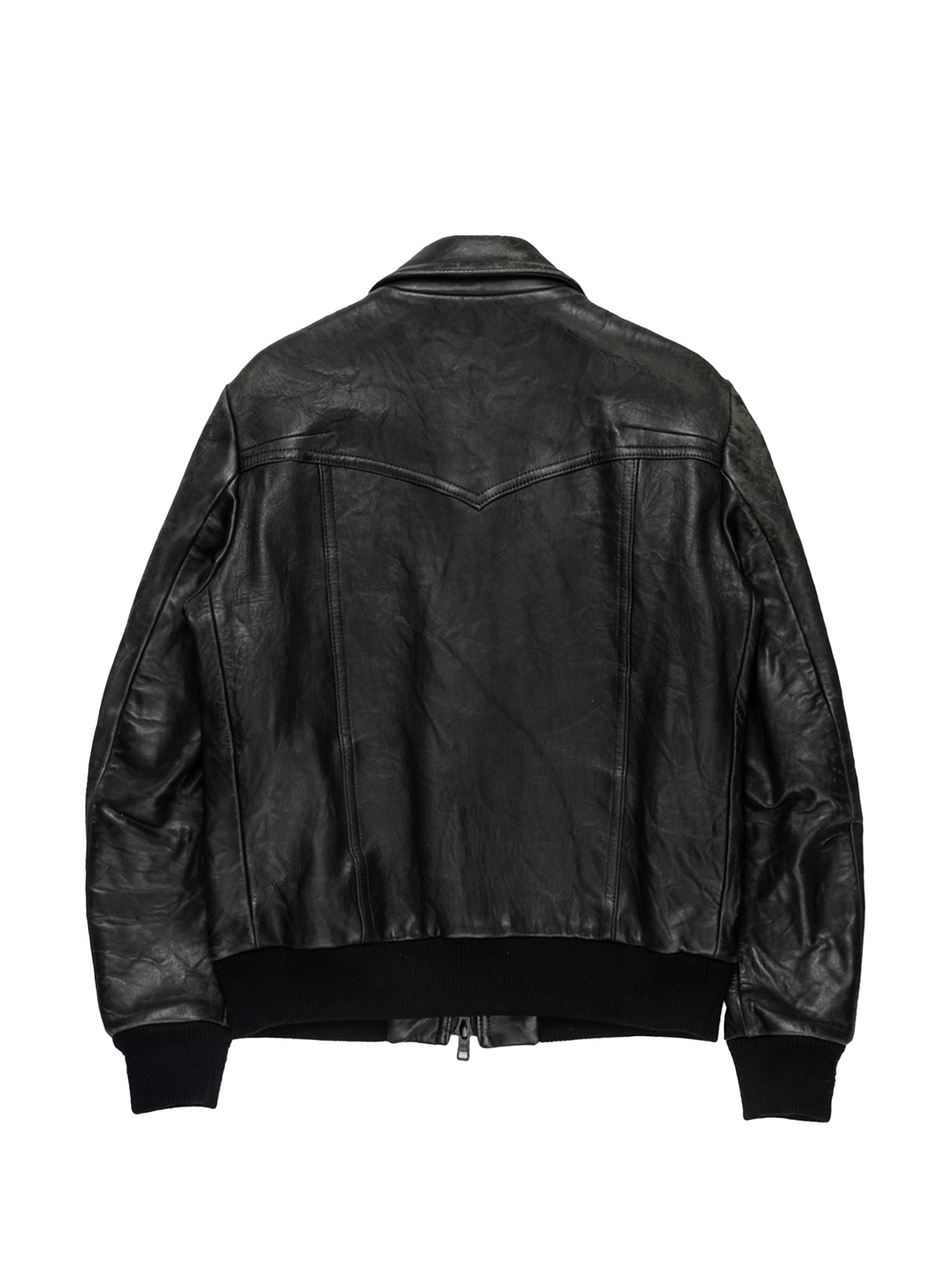 Inspired by Johnny Cash, this classic western-style jacket features durable yet soft leather, ribbed knit hems, pointed collar, front zip closure, four front pockets, and is fully lined.