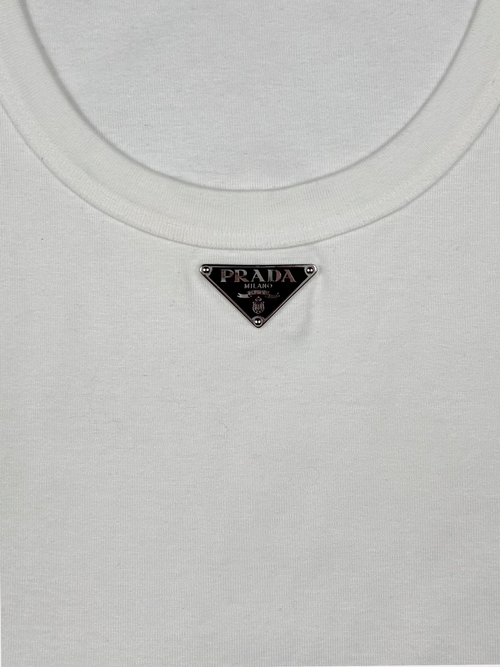 This fitted cotton tank top showcases the brand’s signature minimalist elegance, highlighted by the enameled metal triangle logo on the front.
