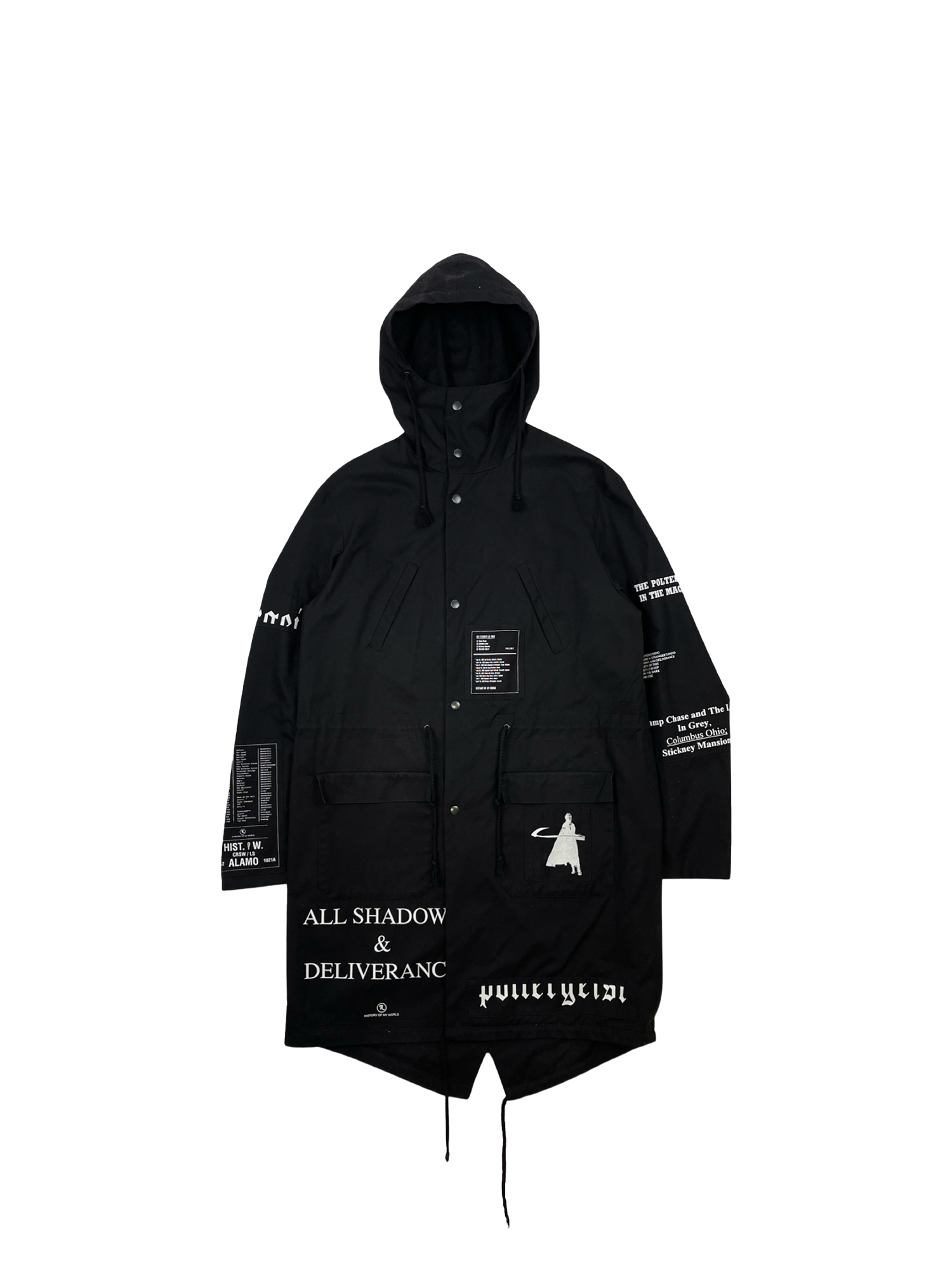 A monumental piece from Fall 2005, this iconic parka is collaged with graphic patches related to haunted Poltergeist locations, The Cure tour dates, John Cage, Robert Smith, Peter De Potter, and lyrics. Trench silhouette featuring a hood with concealed zip and exposed button closure.