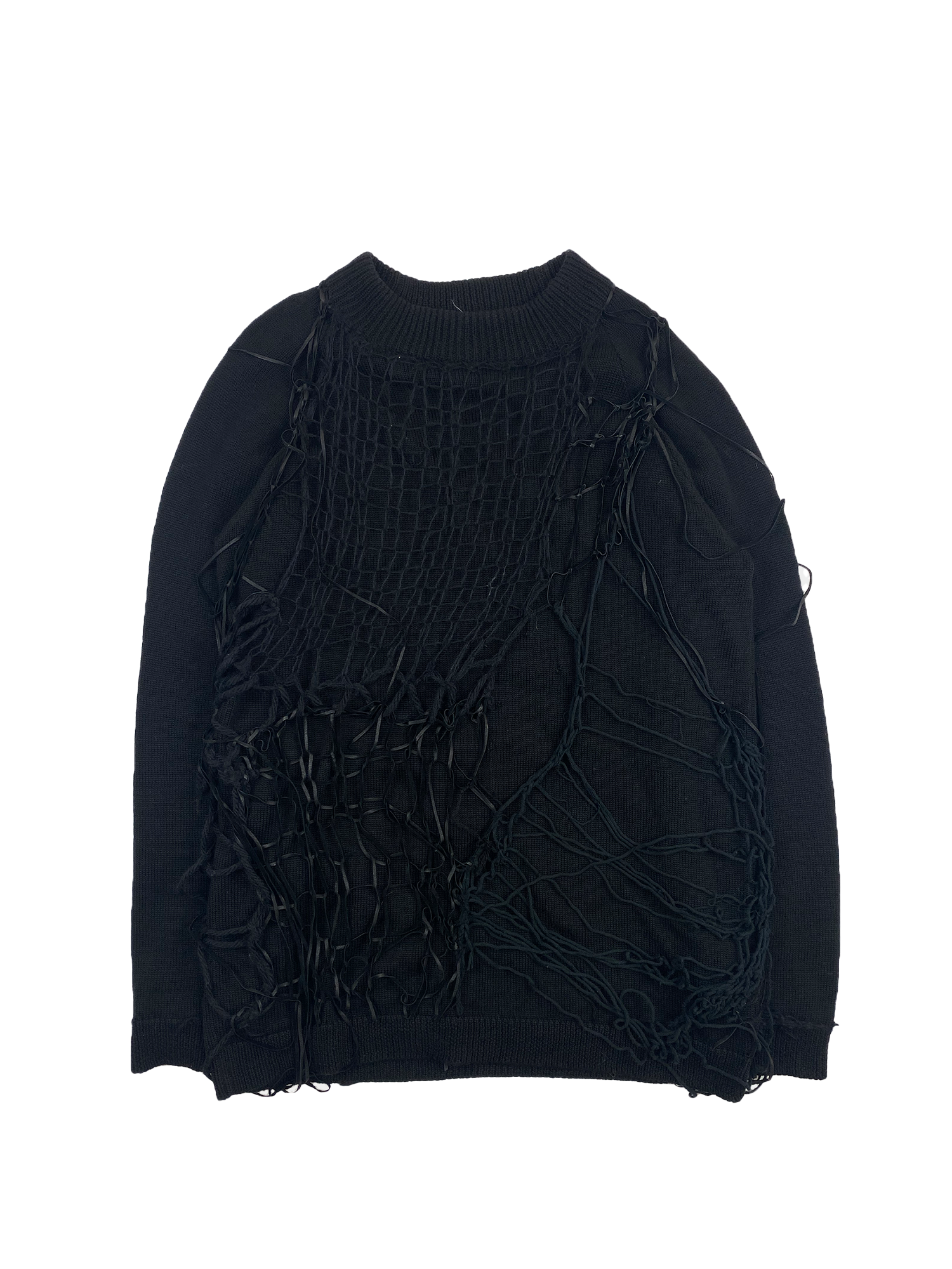 Wool sweater knit with cotton, mohair, and leather web overlay.