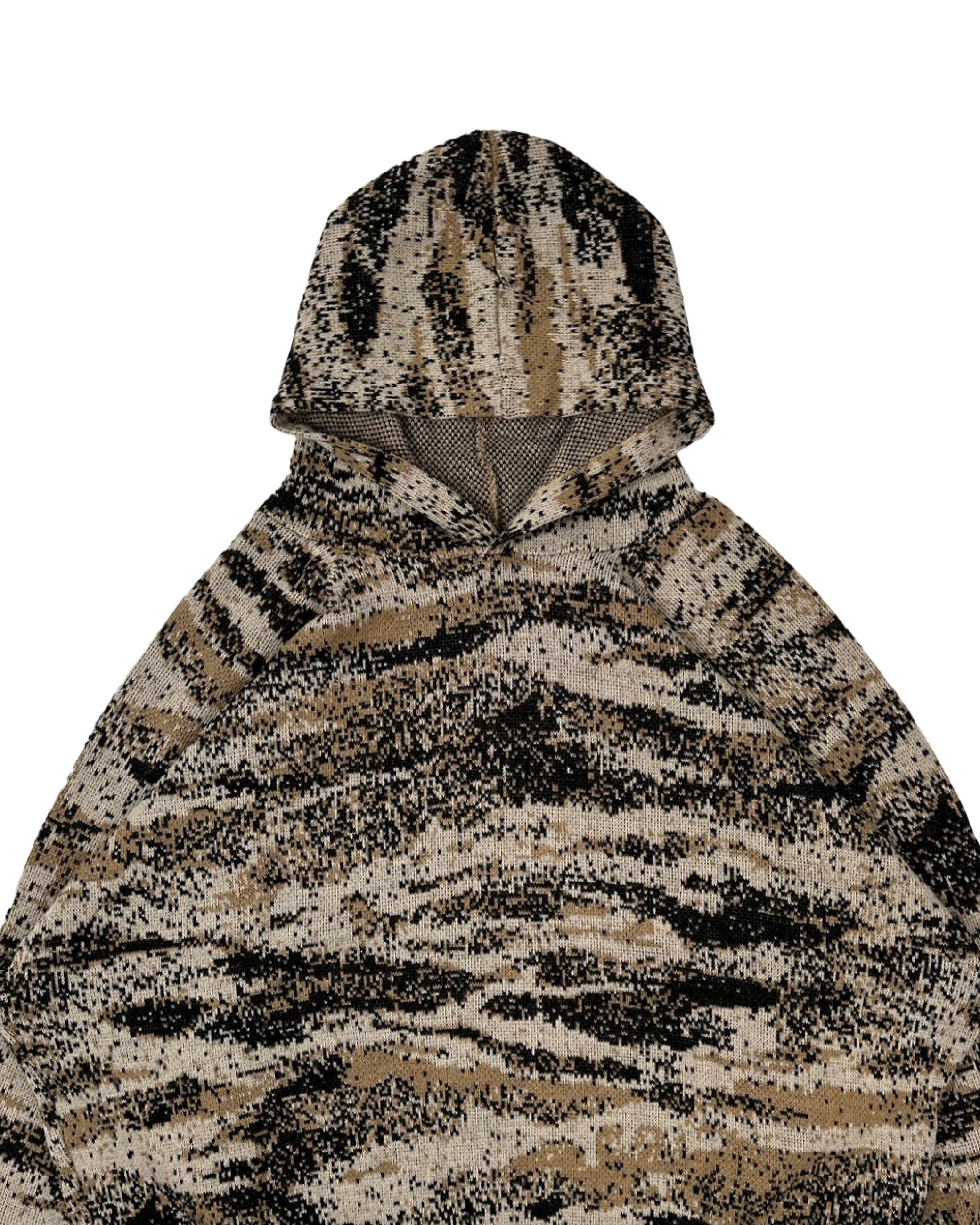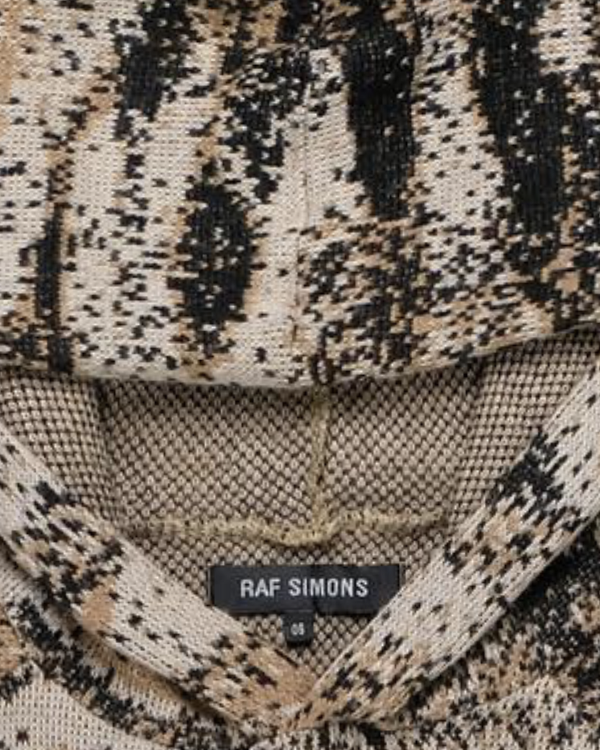 The Raf Simons Digicamo Hoodie reimagines classic military-coded camouflage through the designer’s signature lens of youth culture, subversion, and futurism. Crafted from a heavyweight cotton fleece, the piece features a digitally rendered camouflage print that blends distorted pixels, abstract color shifts, and textural depth—creating a pattern that feels both industrial and cyber-inspired.