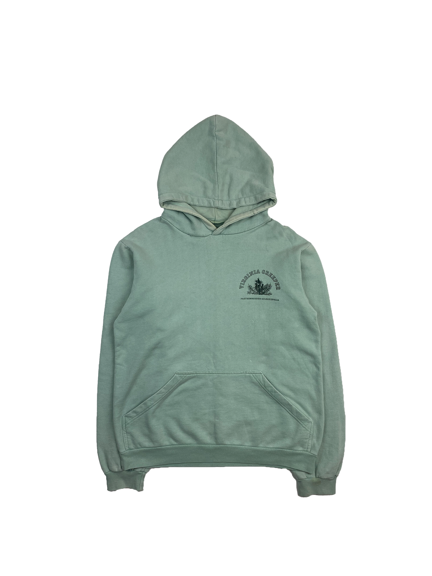 The ideas presented around Raf’s AW02 collection were set out to explore the relationship between humans and nature. The Virginia Creeper hoodie illustrates just that, being named after a five-leaved ivy plant found across the Americas. Each piece of clothing from this collection went through special chemical treatments. This hoodie in particular was dyed in the scarce teal colorway.. The Virginia Creeper graphic on the front is done in a collegiate school font with the scientific term for the plant, Parthenocissus quinquefolia.