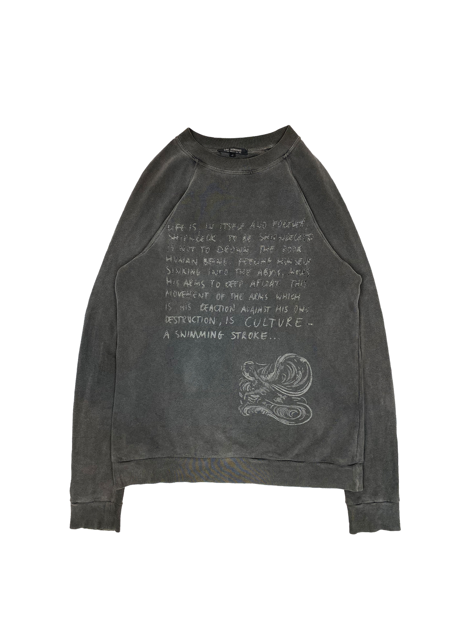 The poem is rendered in a distinctly loose handwriting style, printed with a thick layer of ink that contrasts the over-dyed grey silhouette. The poem is complemented by an equally unbalanced sketch underneath, depicting a human figure struggling against the ocean’s current. Shipwrecked on Strange Shores “LIFE IS, IN ITSELF AND FOREVER, SHIPWRECK. TO BE SHIPWRECKED IS NOT TO DROWN. THE POOR HUMAN BEING, FEELING HIMSELF SINKING INTO THE ABYSS, MOVES HIS ARMS TO KEEP AFLOAT. THIS MOVEMENT OF THE ARMS WHICH IS HIS REACTION AGAINST HIS OWN DESTRUCTION, IS CULTURE — A SWIMMING STROKE.” -Jose Ortega y Gasset (1883-1995)