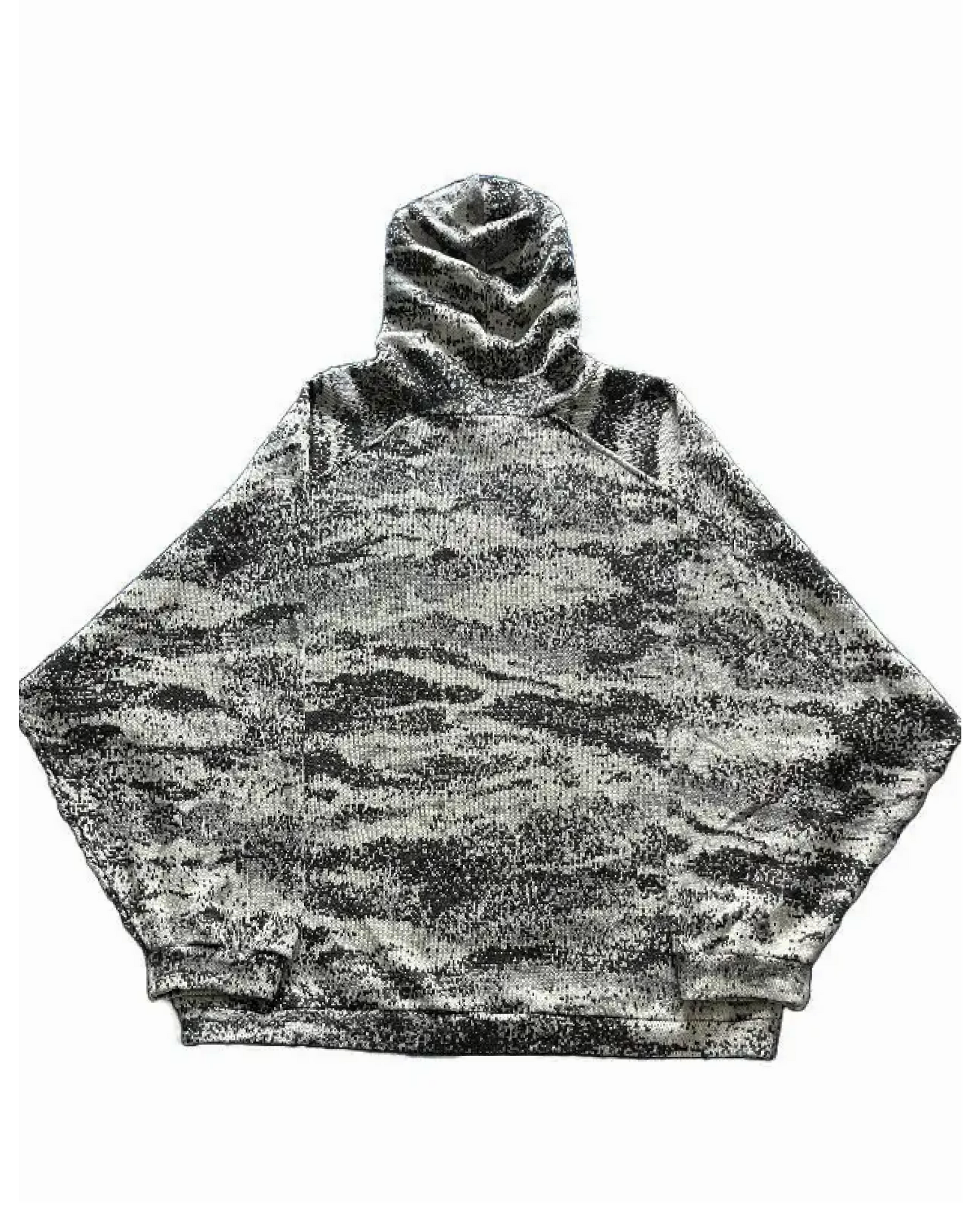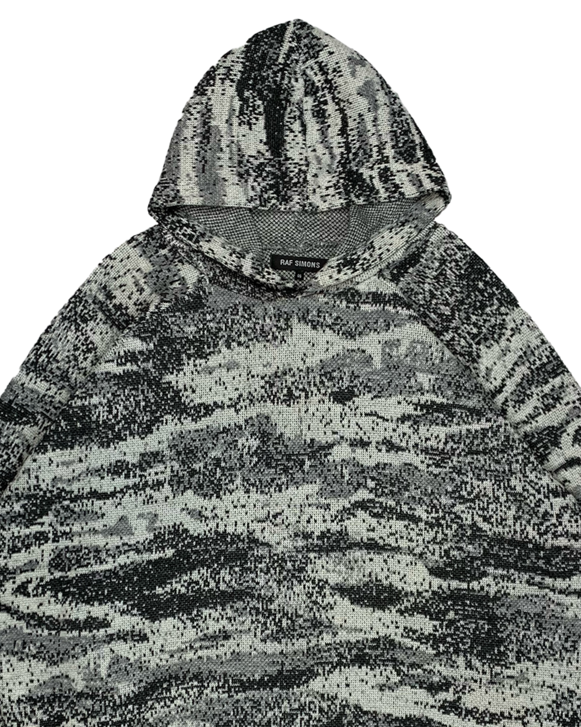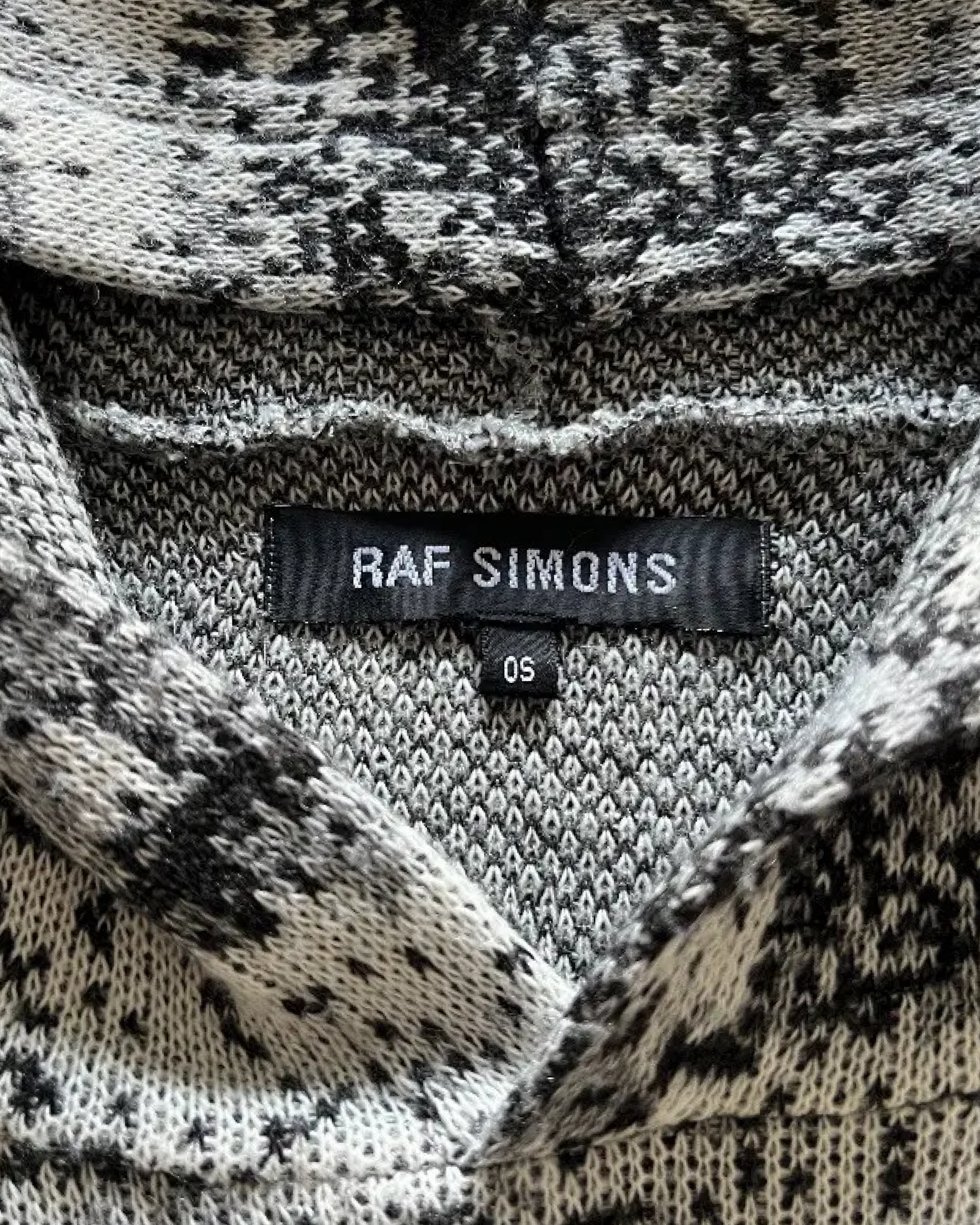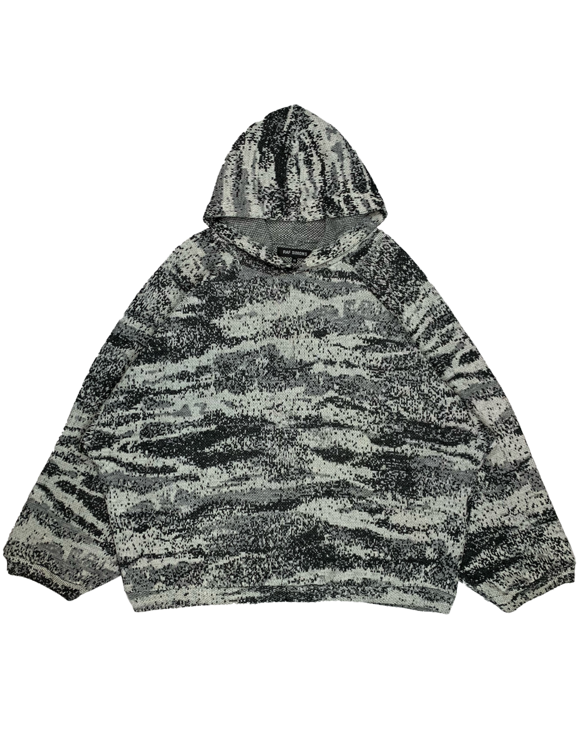 The Raf Simons Digicamo Hoodie reimagines classic military-coded camouflage through the designer’s signature lens of youth culture, subversion, and futurism. Crafted from a heavyweight cotton fleece, the piece features a digitally rendered camouflage print that blends distorted pixels, abstract color shifts, and textural depth—creating a pattern that feels both industrial and cyber-inspired.