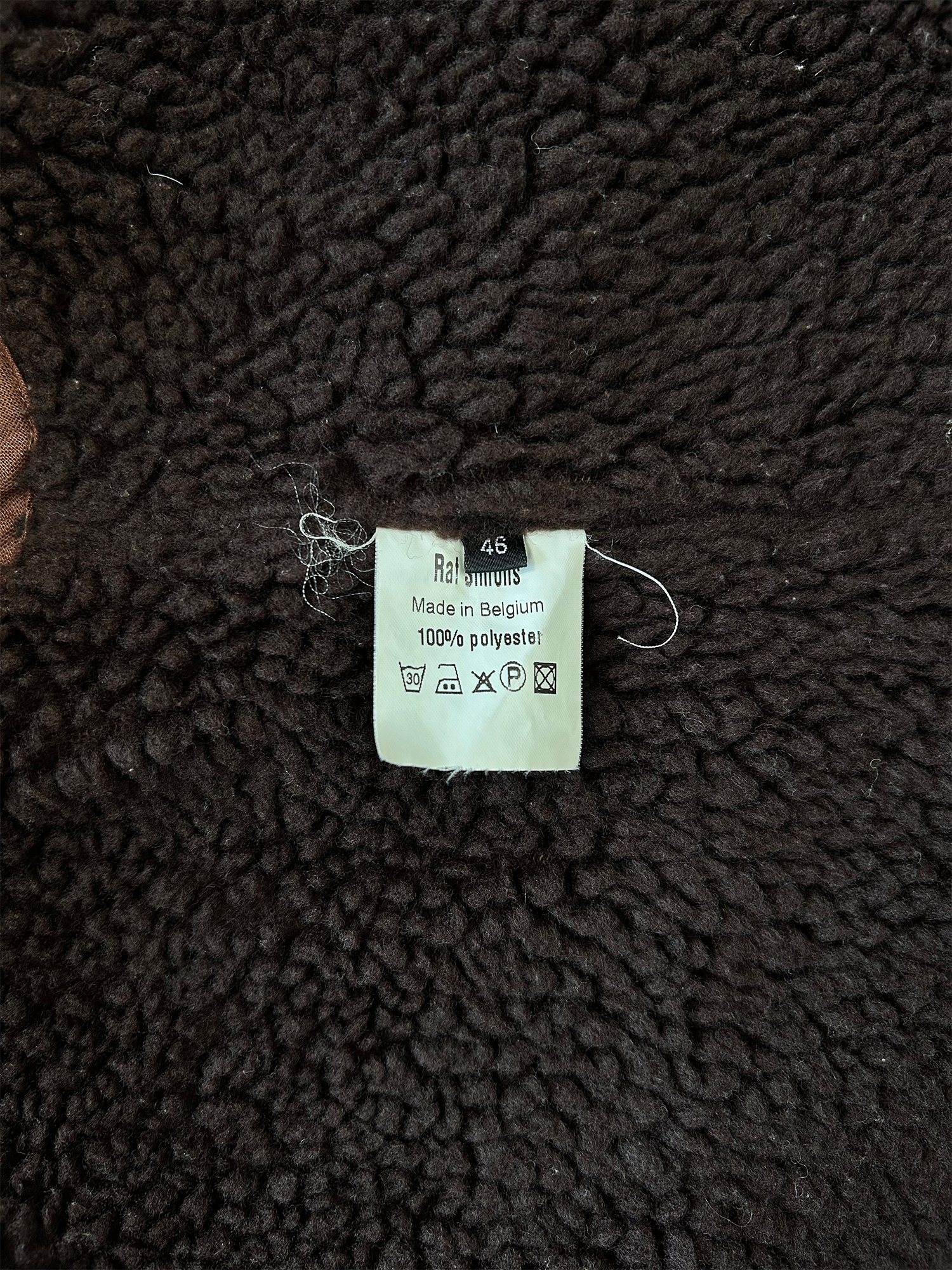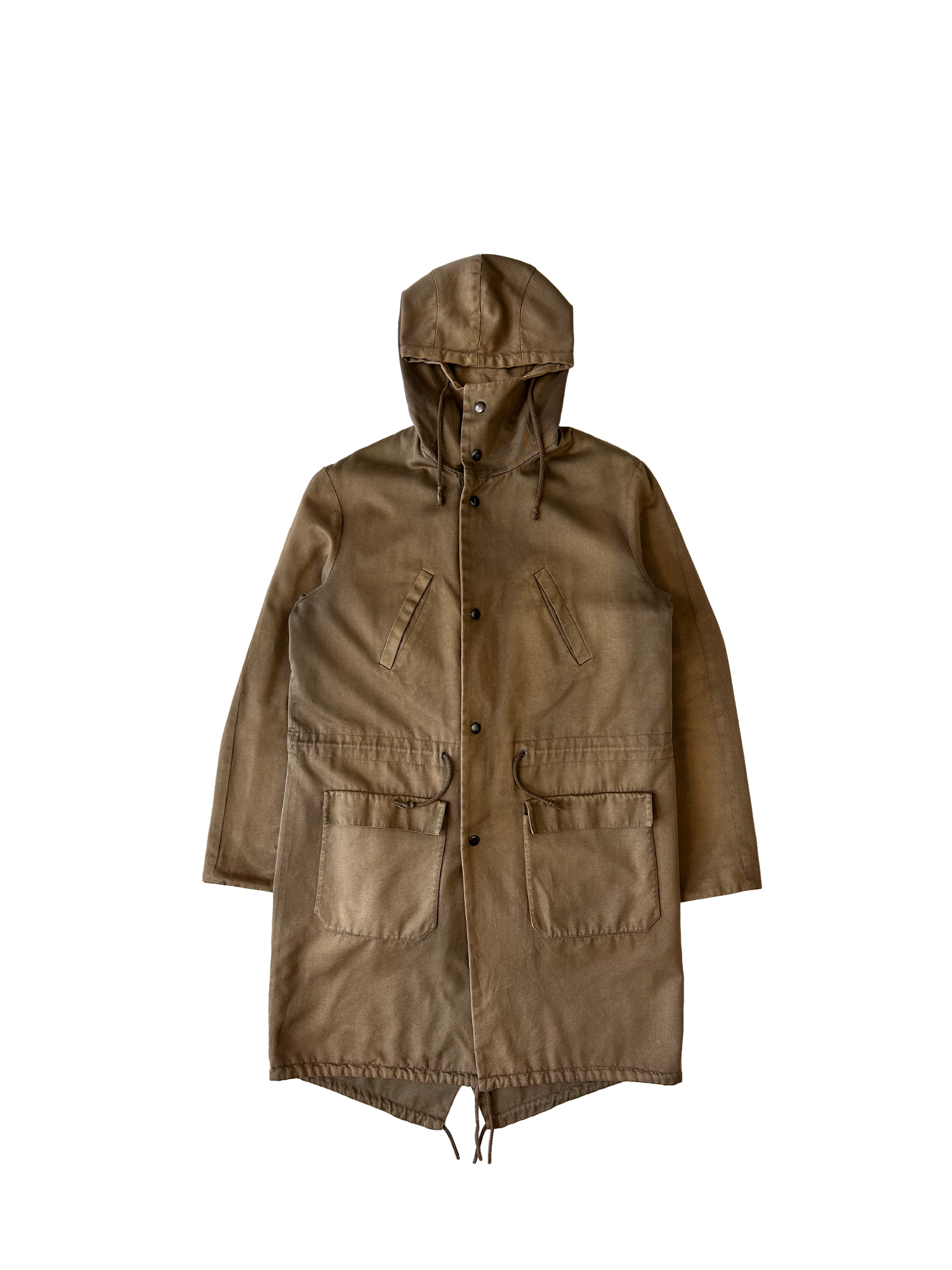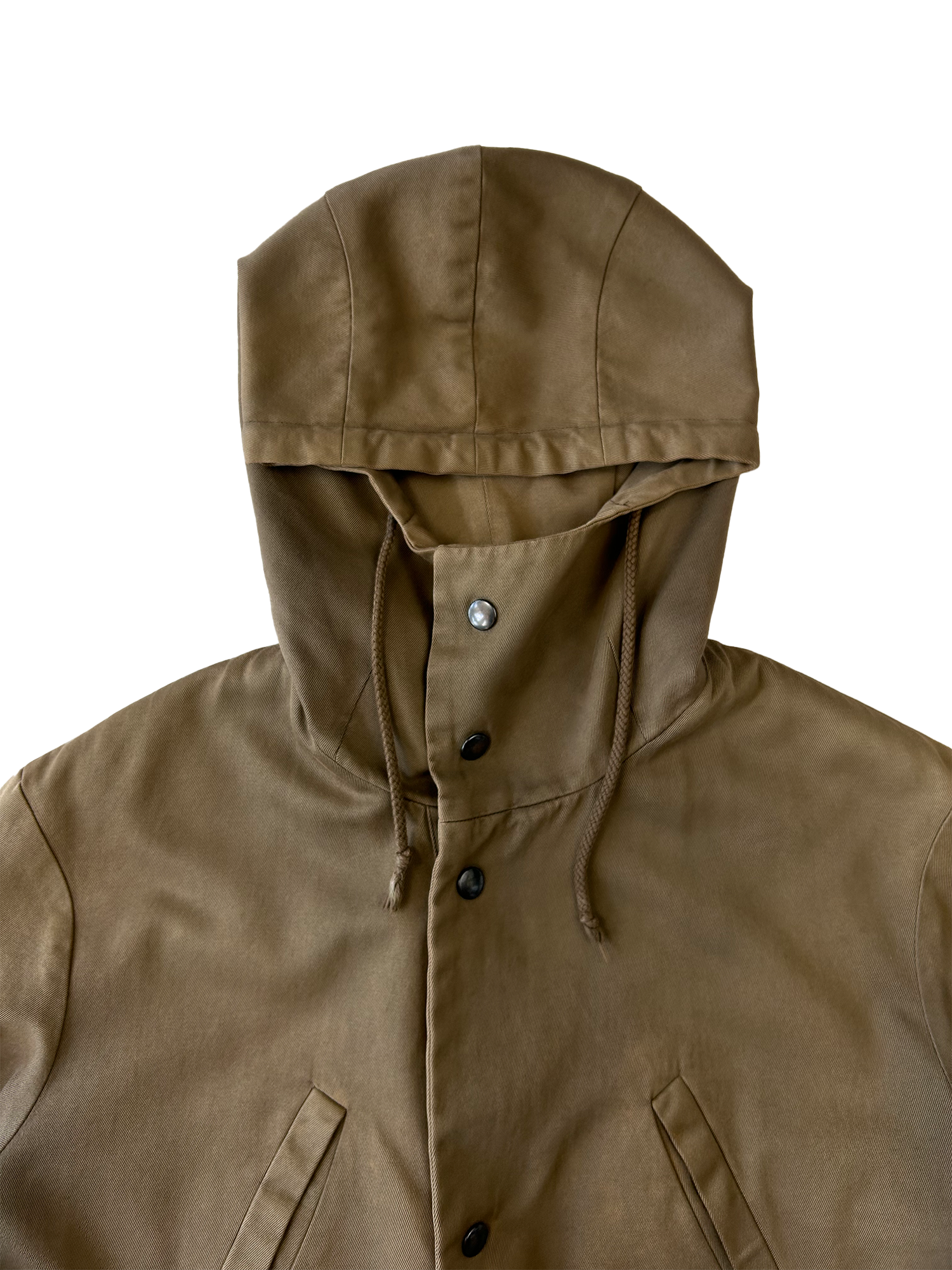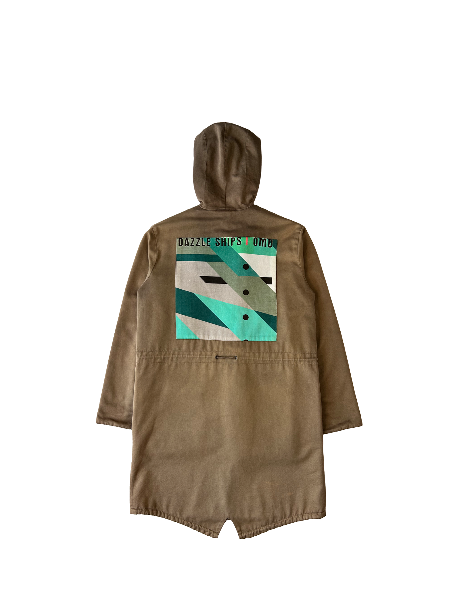 This khaki green cotton parka is a collaboration with British artist Peter Saville. It features a removable sherpa lining for added warmth, a drawstring hood, and press stud fastening. The design includes two chest pockets and front flap pockets with printed details on the cuff and side.