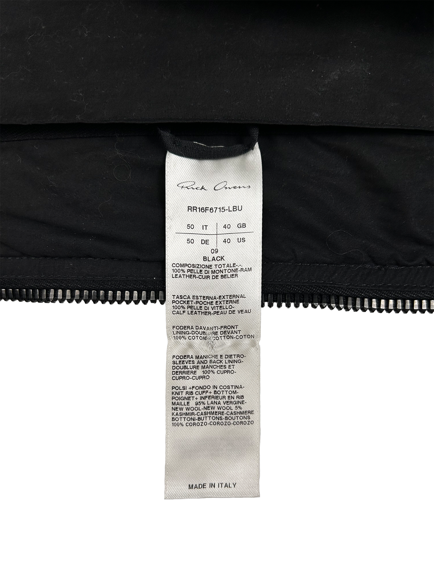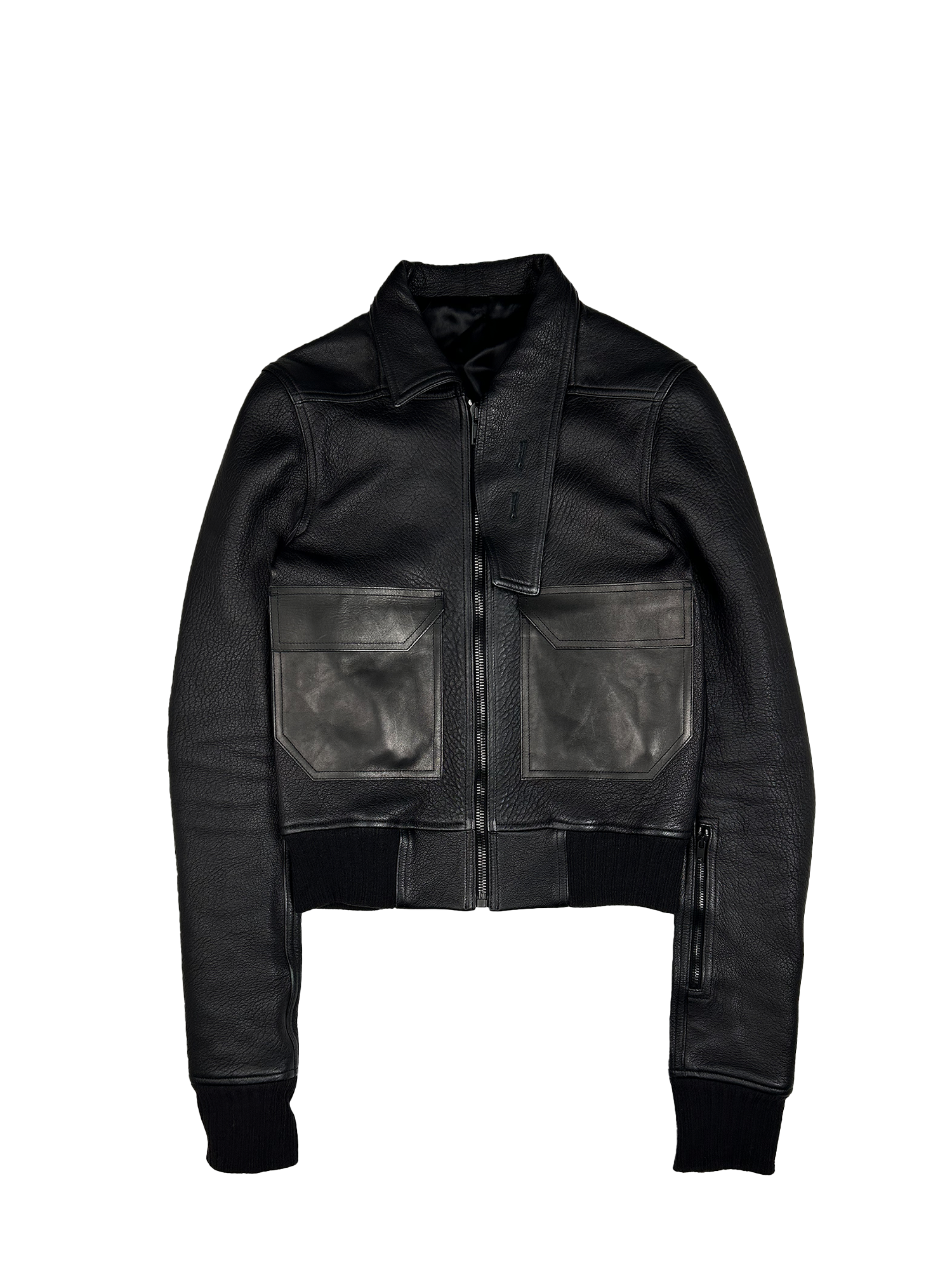 This black bomber jacket is crafted from grained ram leather and features an adjustable buttoned strap at the collar, a zip closure, and buffed calfskin patch pockets at the front. Additionally, there is a zippered pocket at the side seam and on the sleeve.