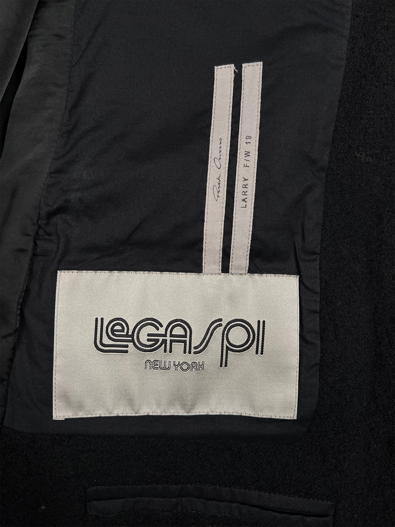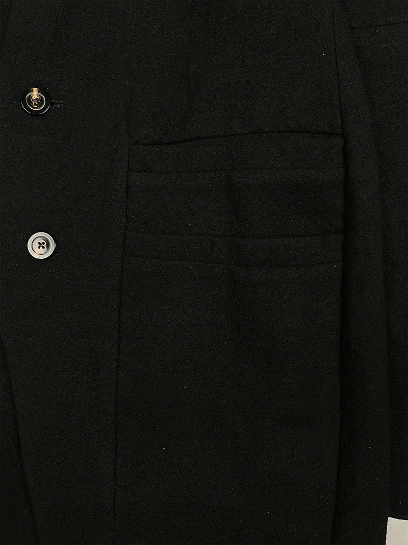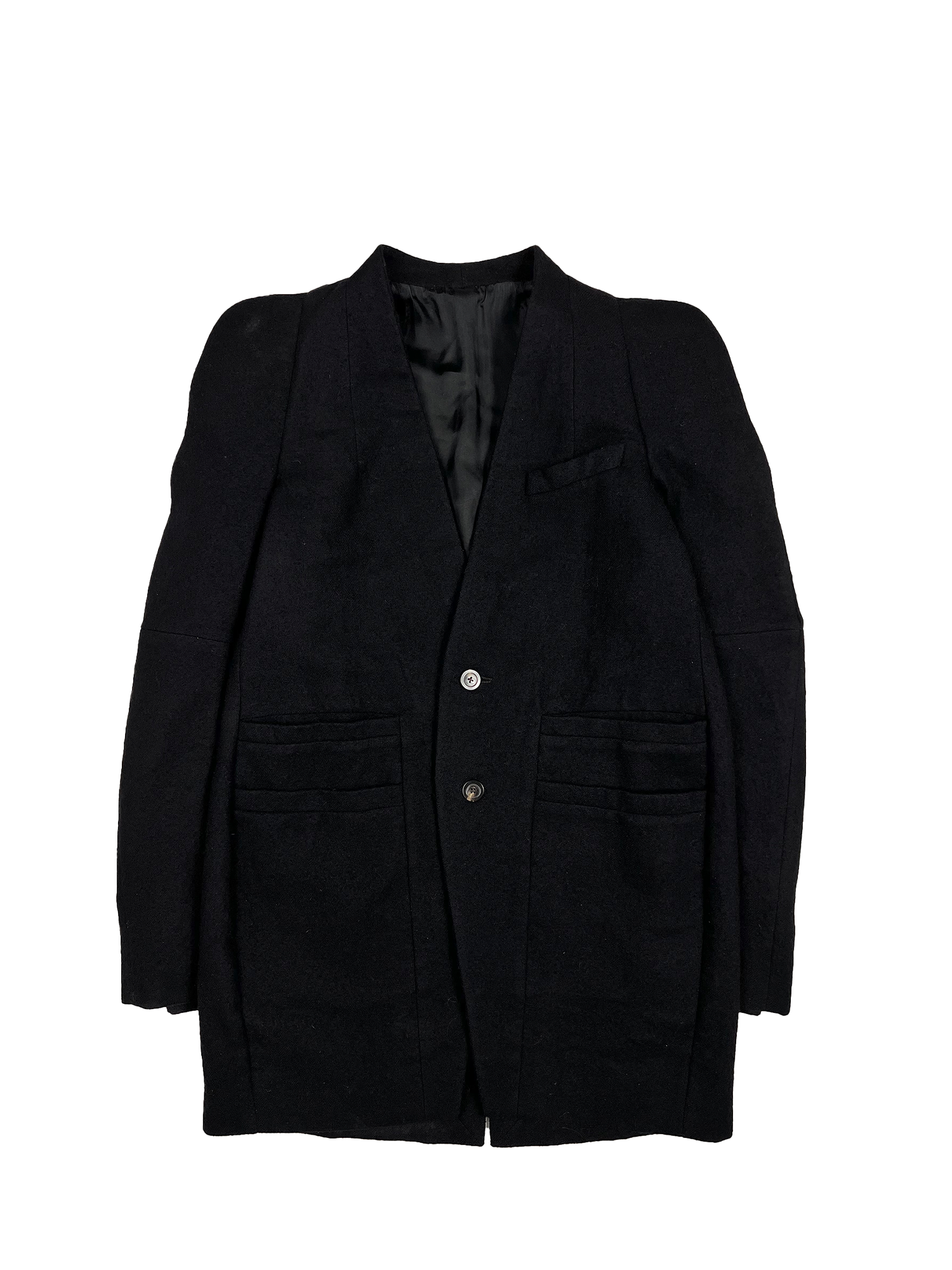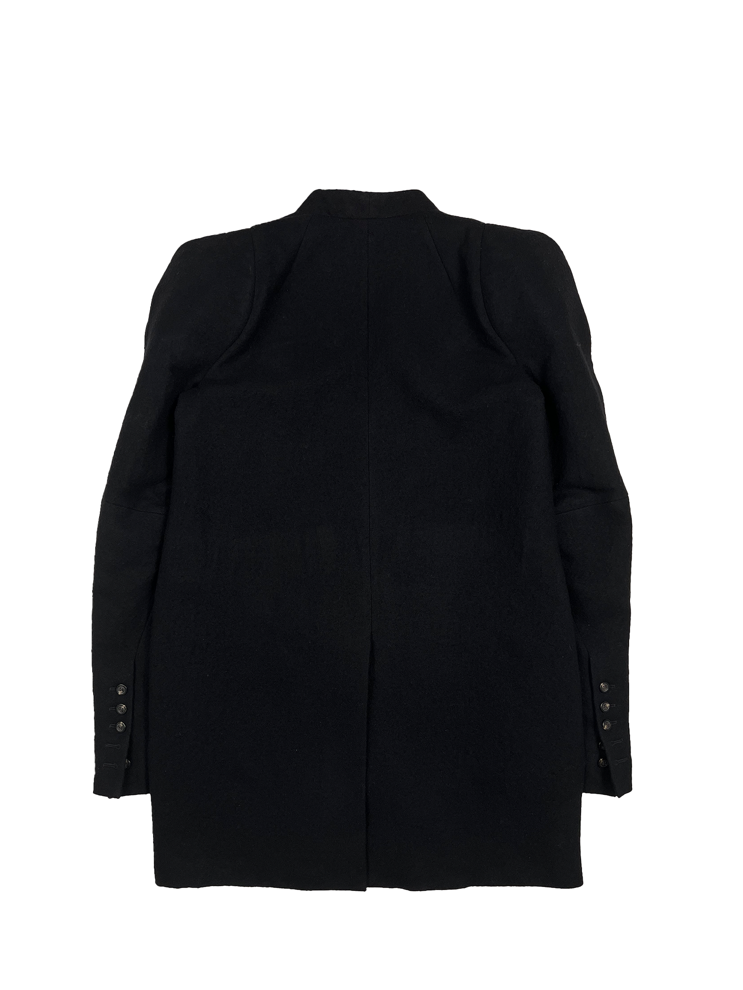 This runway piece showcases a structured silhouette with padded shoulders and elongated sleeves. Fully lined for comfort, this creation is a testament to exquisite craftsmanship.