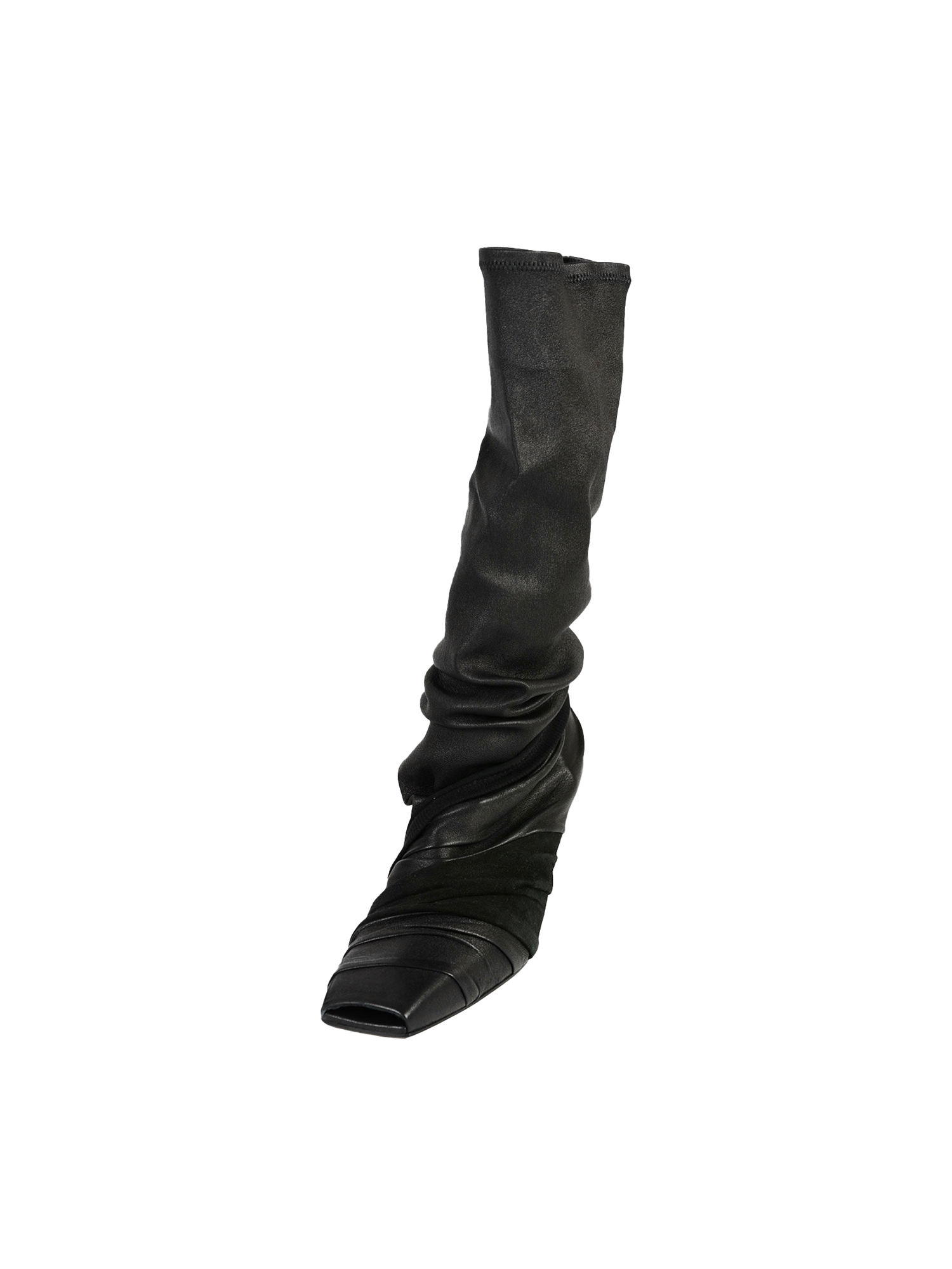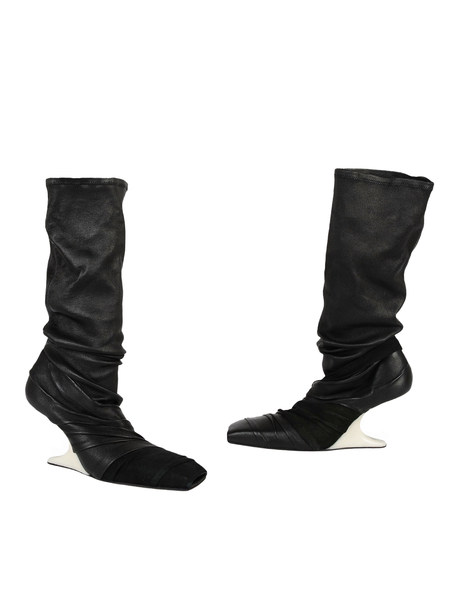 This runway piece features a striking leather and suede drape, complemented by a sculptural resin heel. With its long square toe, it exudes a modern aesthetic.